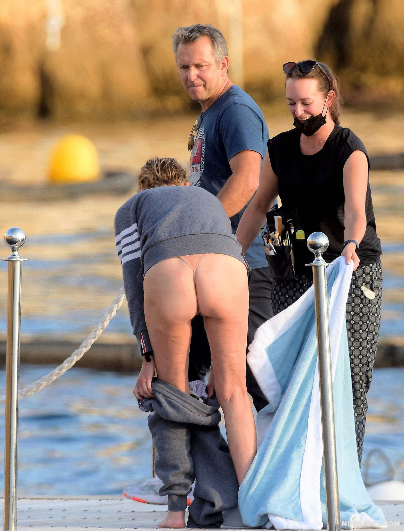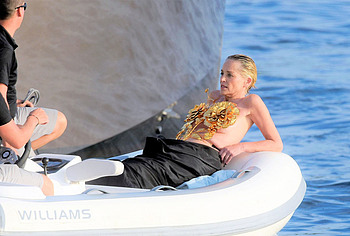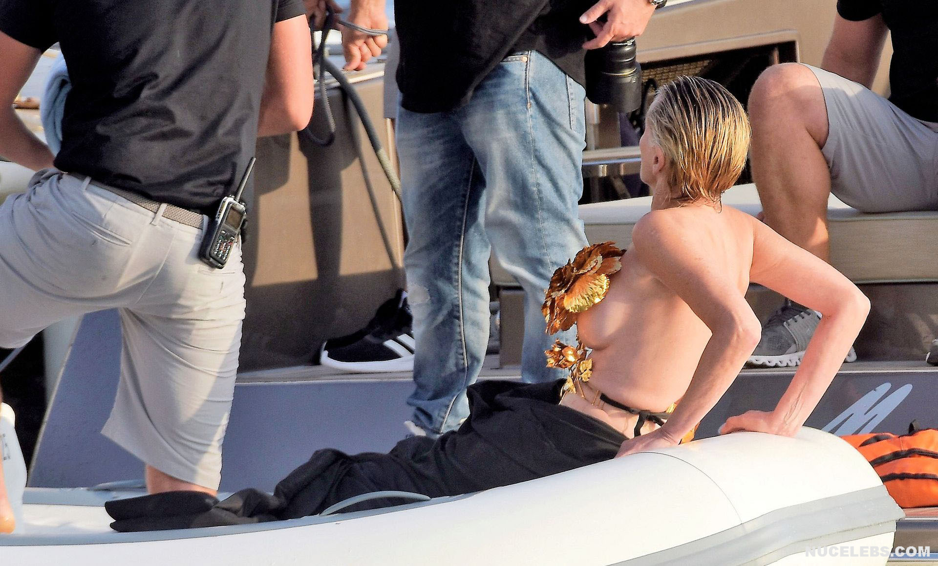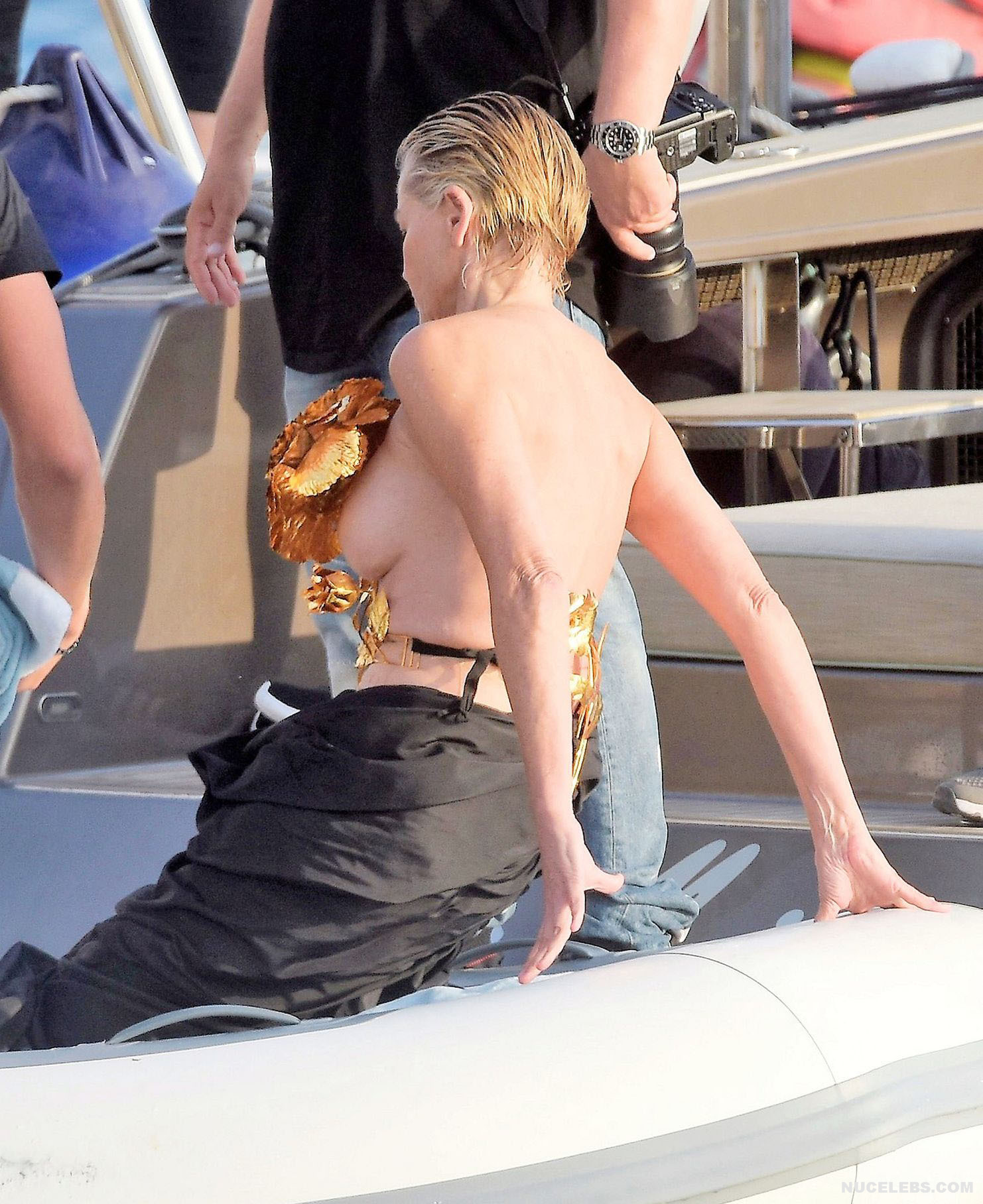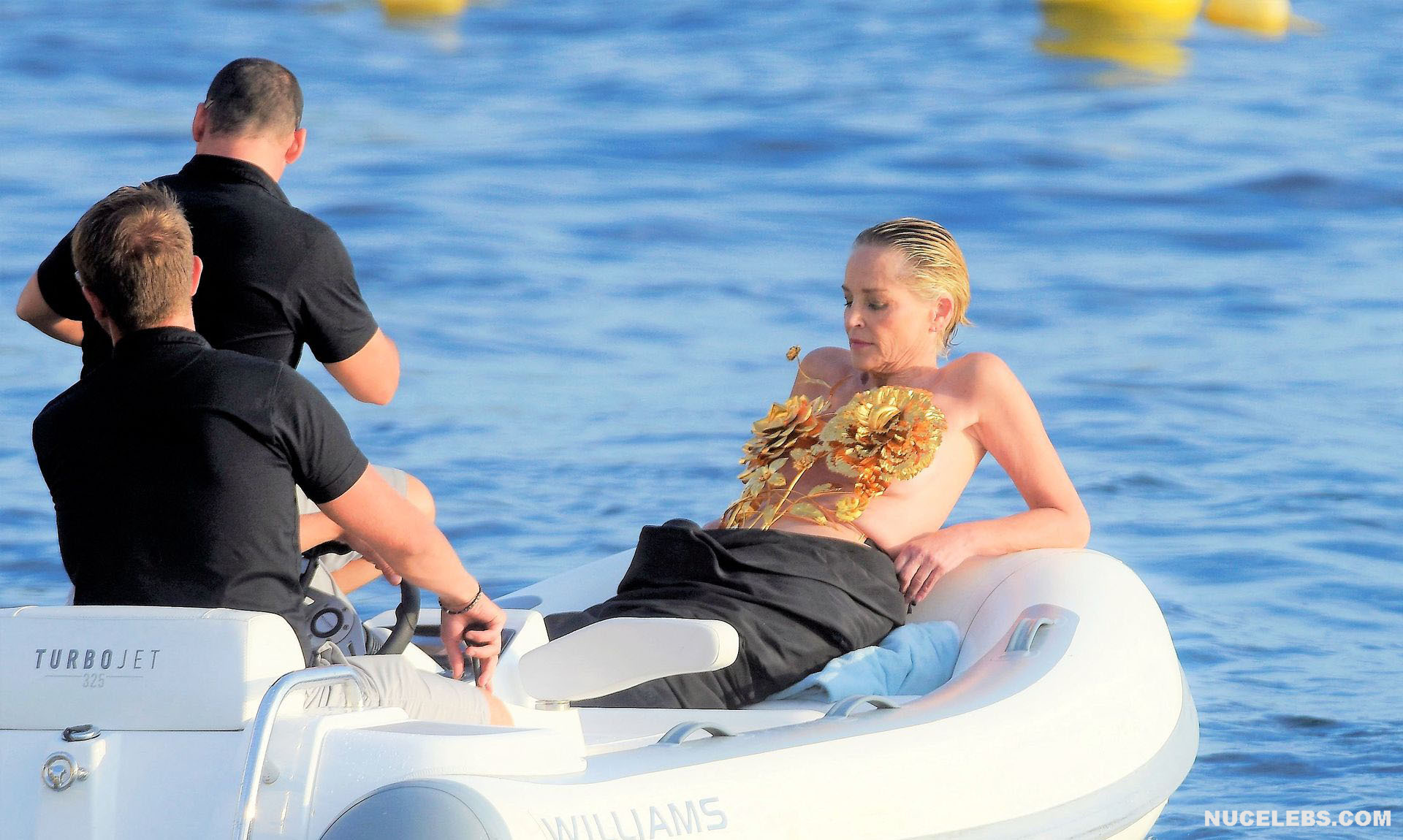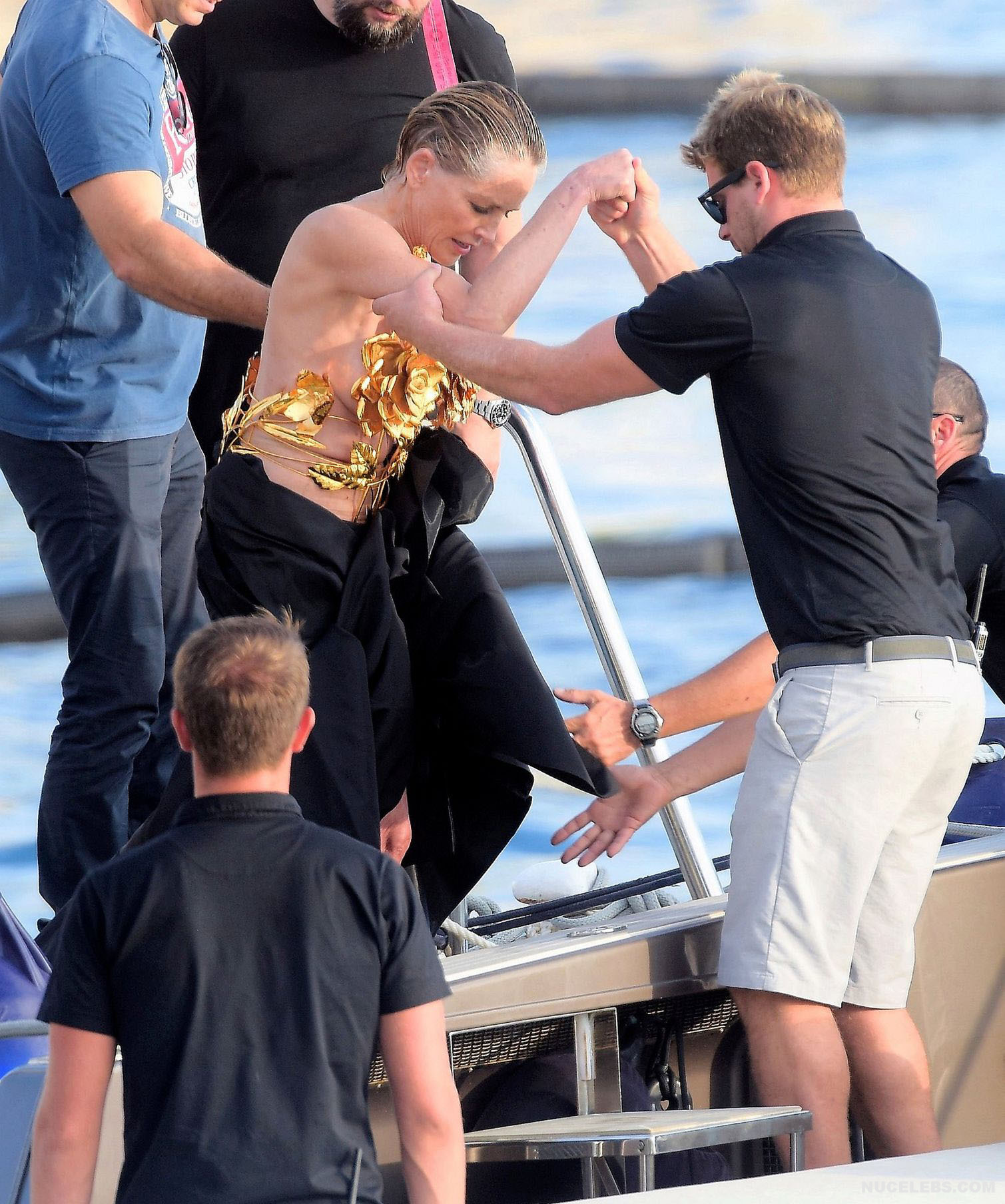 Mature beauty Sharon Stone shows her nude boobies while preparing for a photoshoot! The paparazzi photographed this American actress while she was on a topless yacht! The assistants were just helping to attach the installation of golden flowers to Sharon Stone’s nude titties. However, it’s worth noting that the profile photos show that this golden installation did not hide her awesome breasts at all. This star also flashed her almost bare butt in a petite beige thong when she changed clothes.
