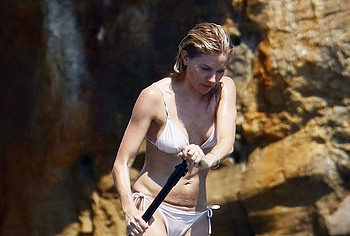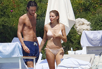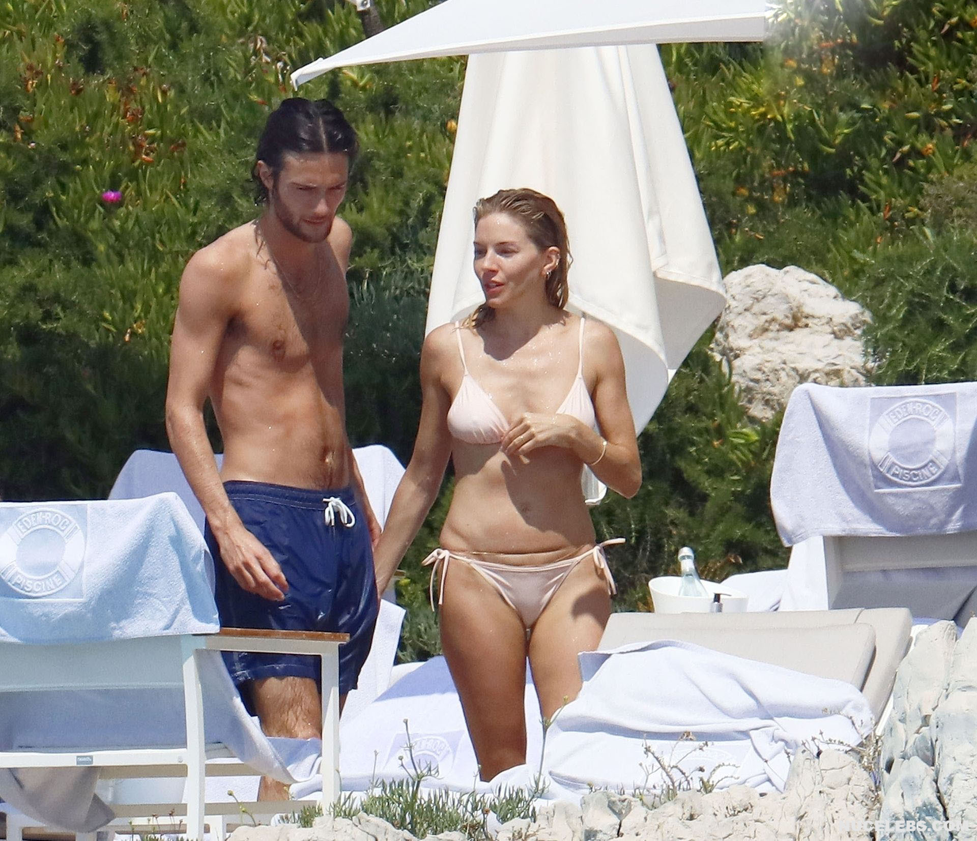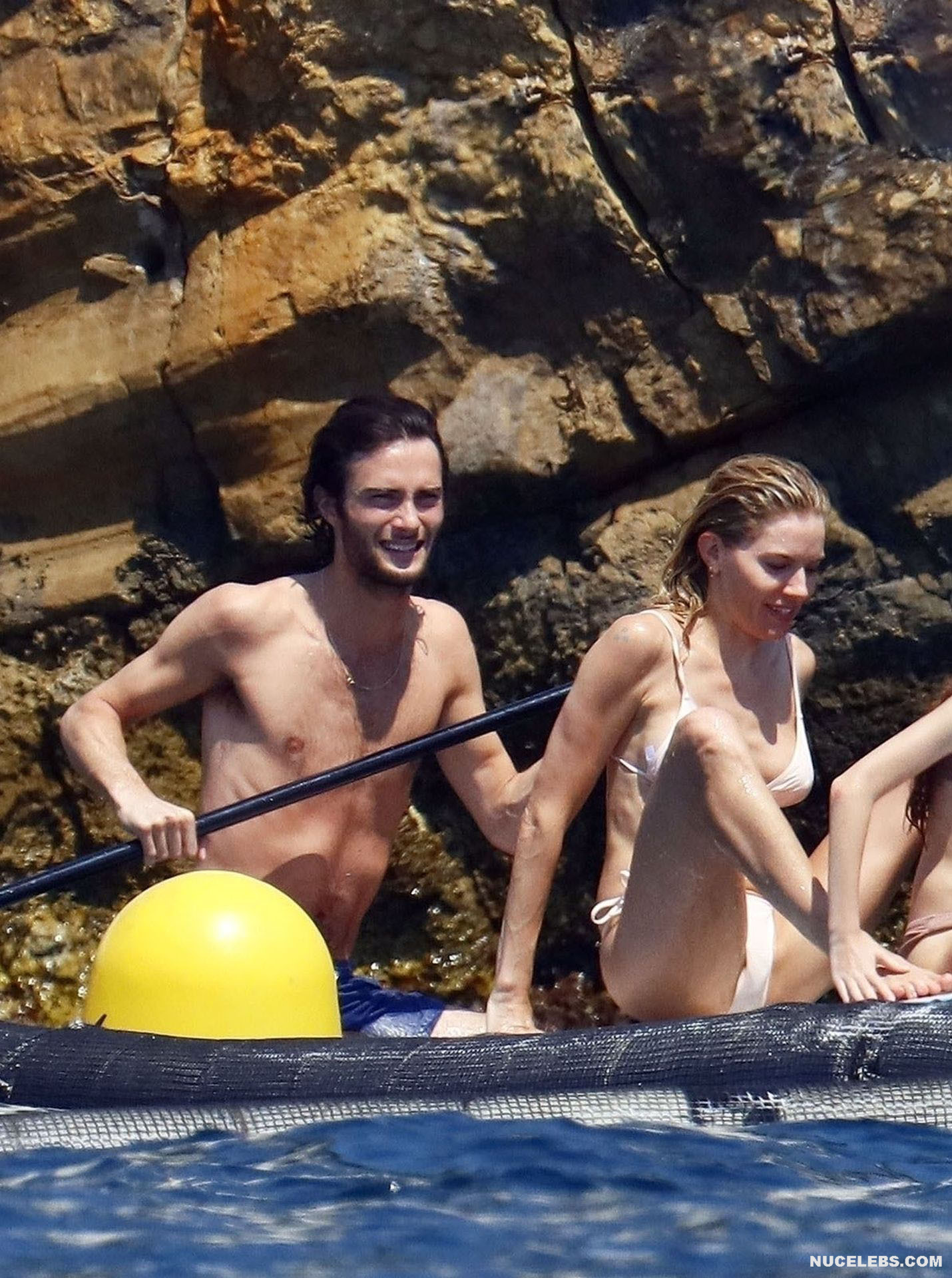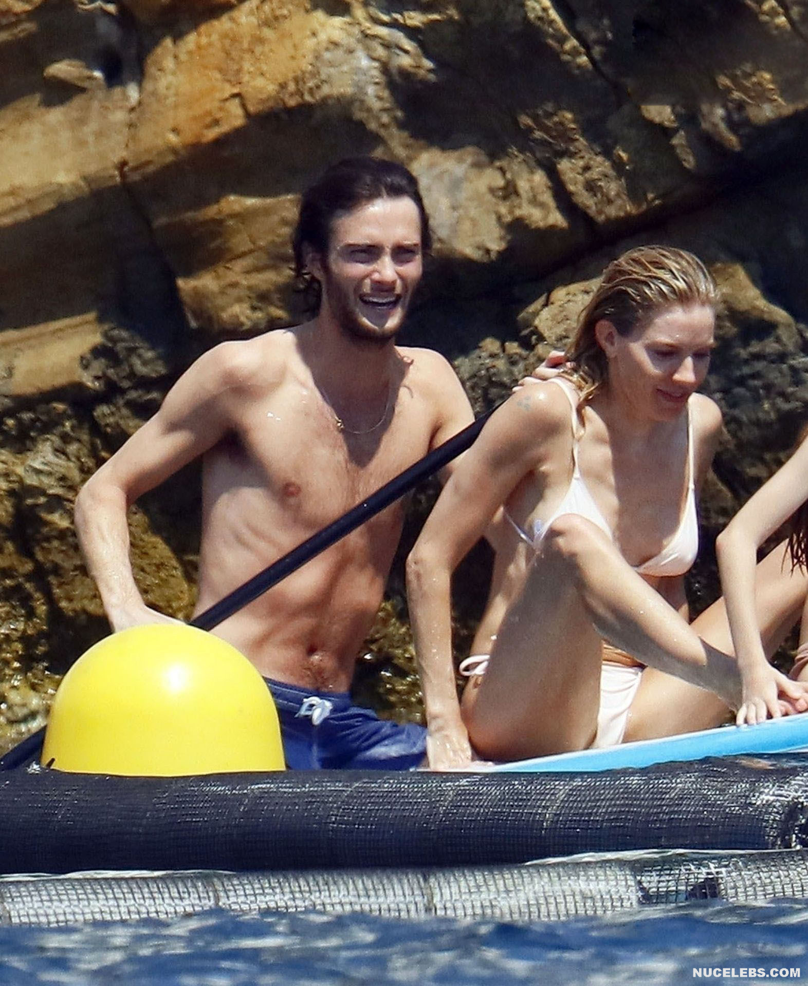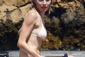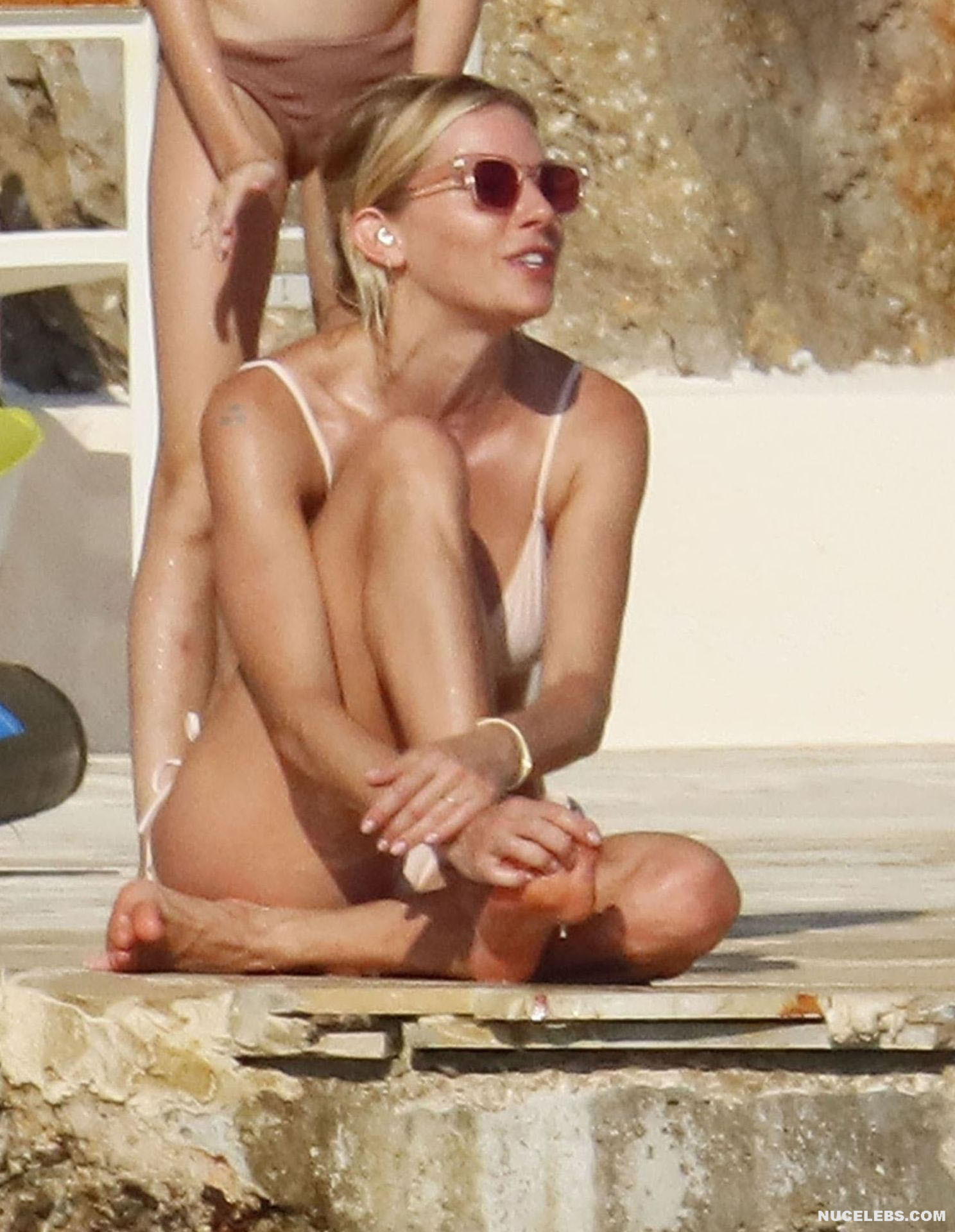 While Sienna Miller was sunbathing and relaxing, everyone around could admire her slender figure. But the most interesting thing began when her white bikini got wet. Her poking nipples became clearly visible through her bra, although Sienna Miller’s nude titties were still hidden from view. You could also admire Sienna Miller’s chic cameltoe in her wet panties.