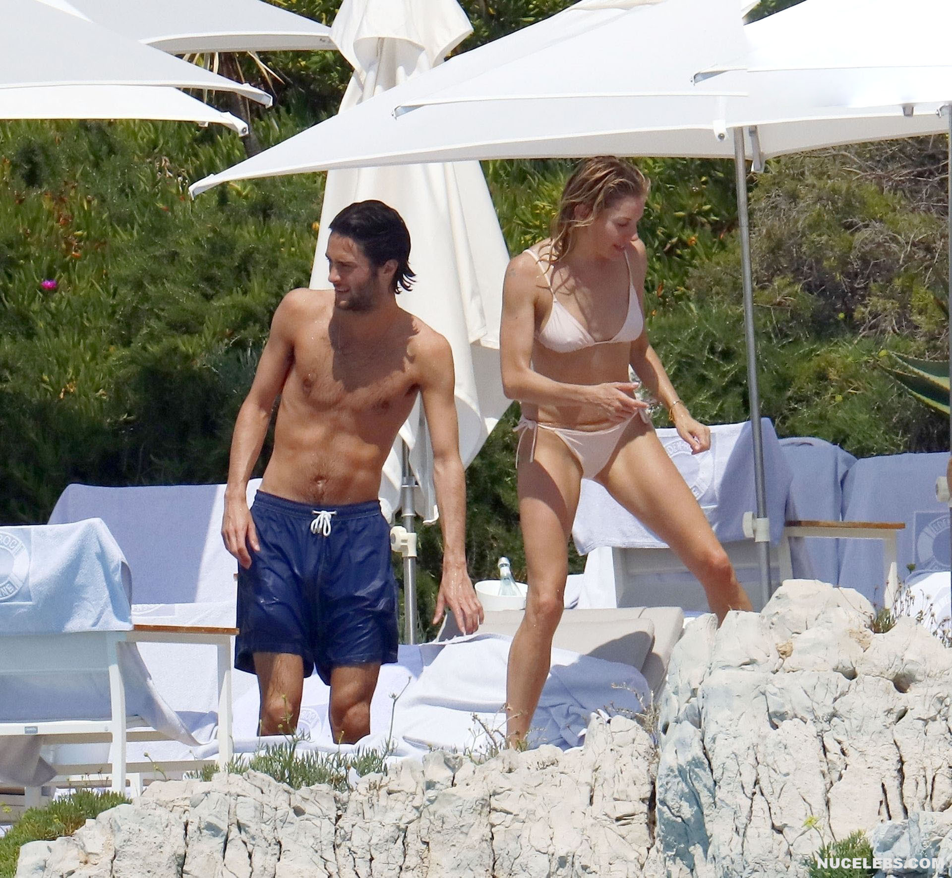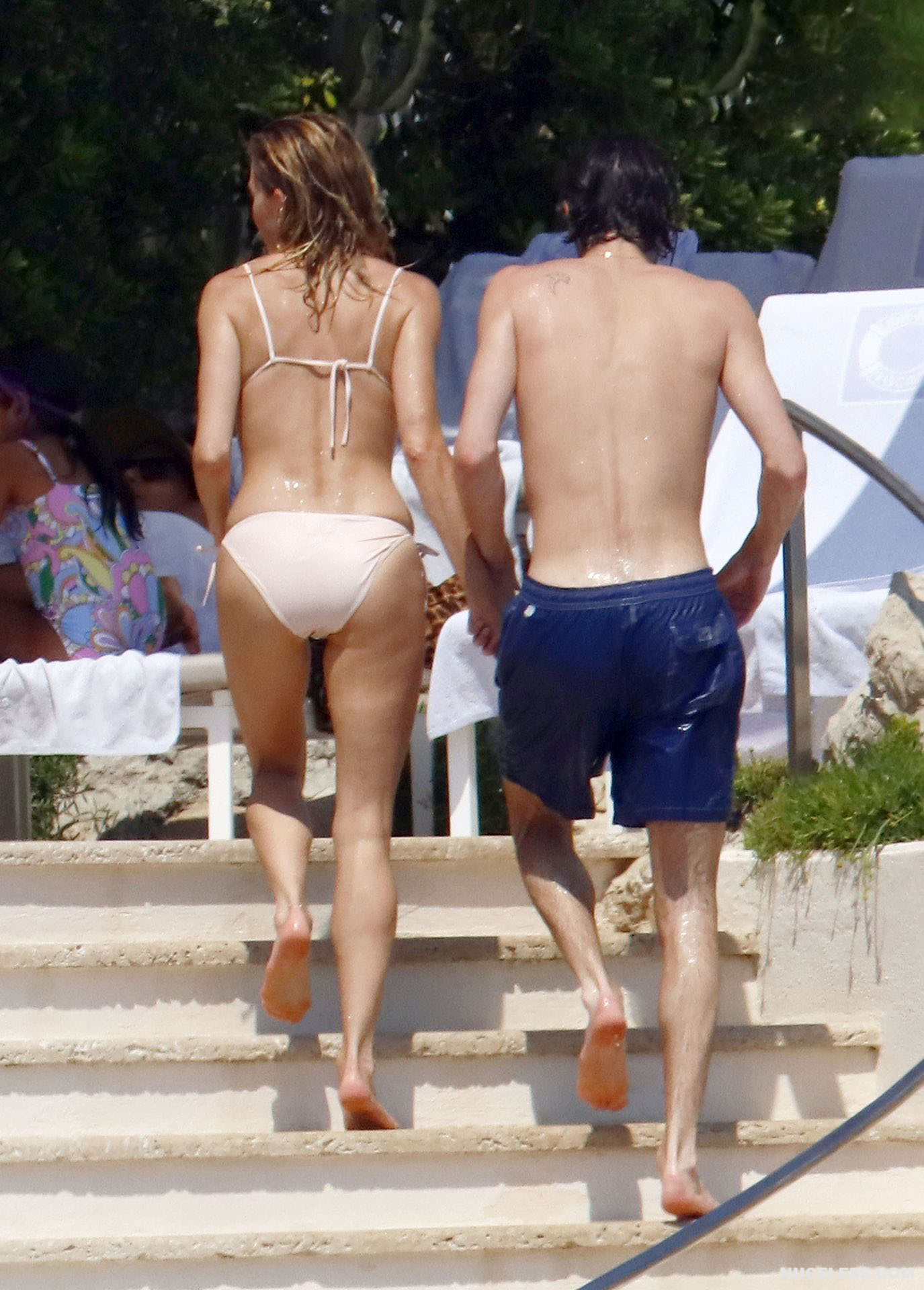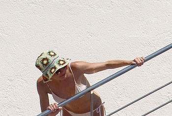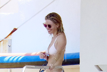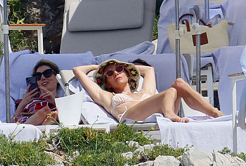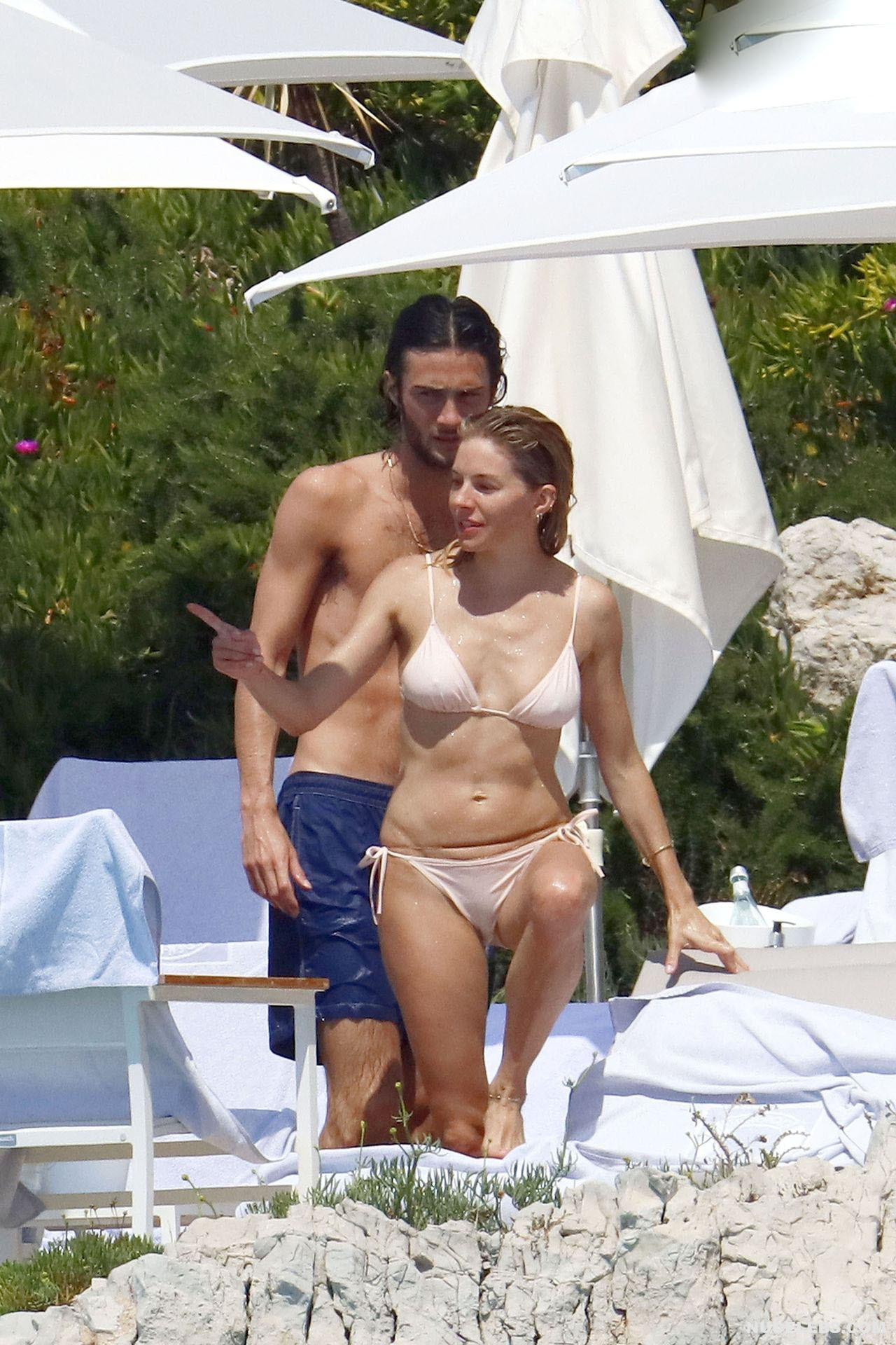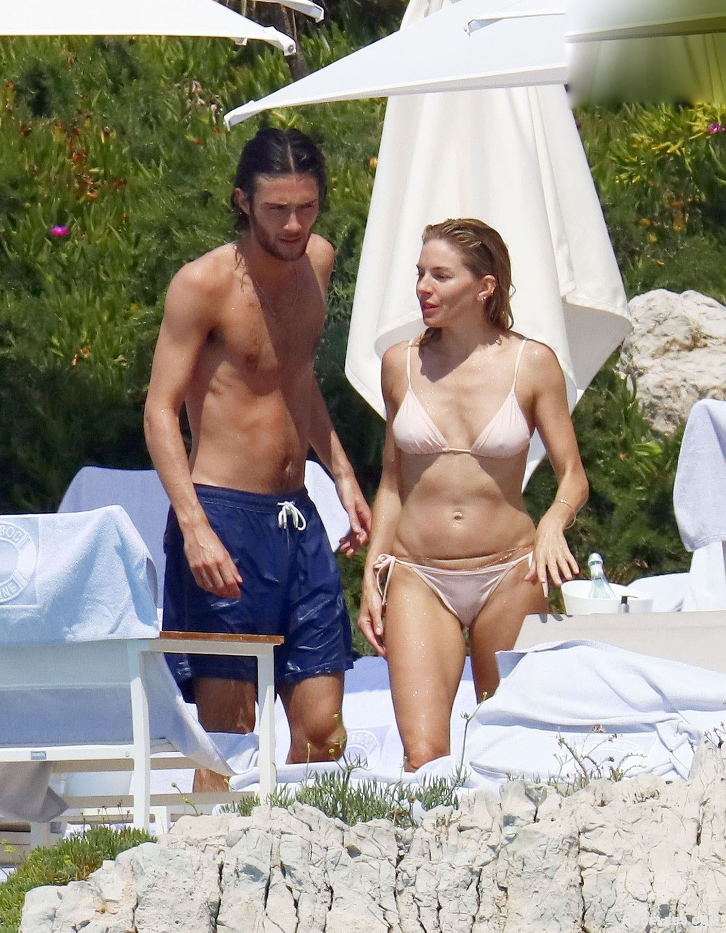 While Sienna Miller was sunbathing and relaxing, everyone around could admire her slender figure. But the most interesting thing began when her white bikini got wet. Her poking nipples became clearly visible through her bra, although Sienna Miller’s nude titties were still hidden from view. You could also admire Sienna Miller’s chic cameltoe in her wet panties.