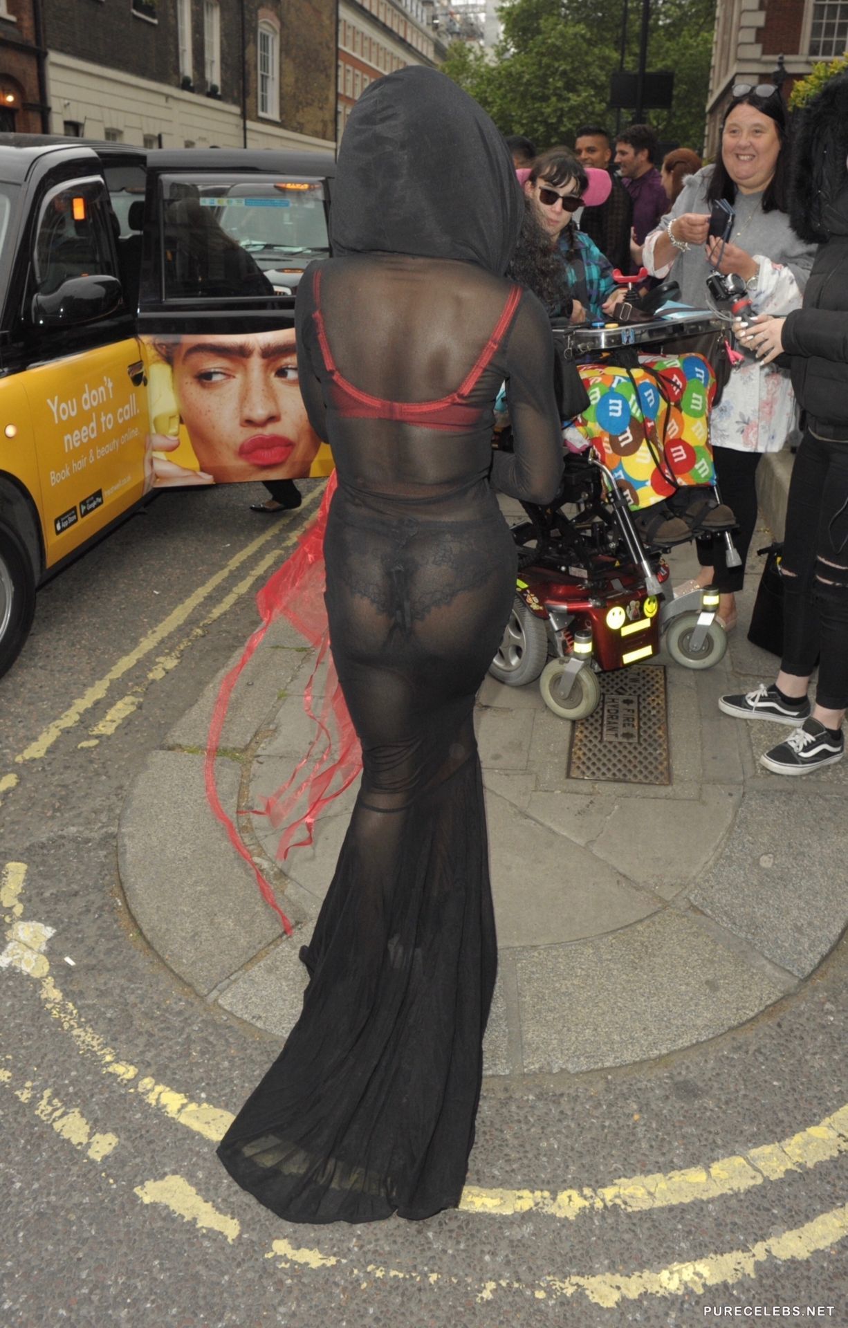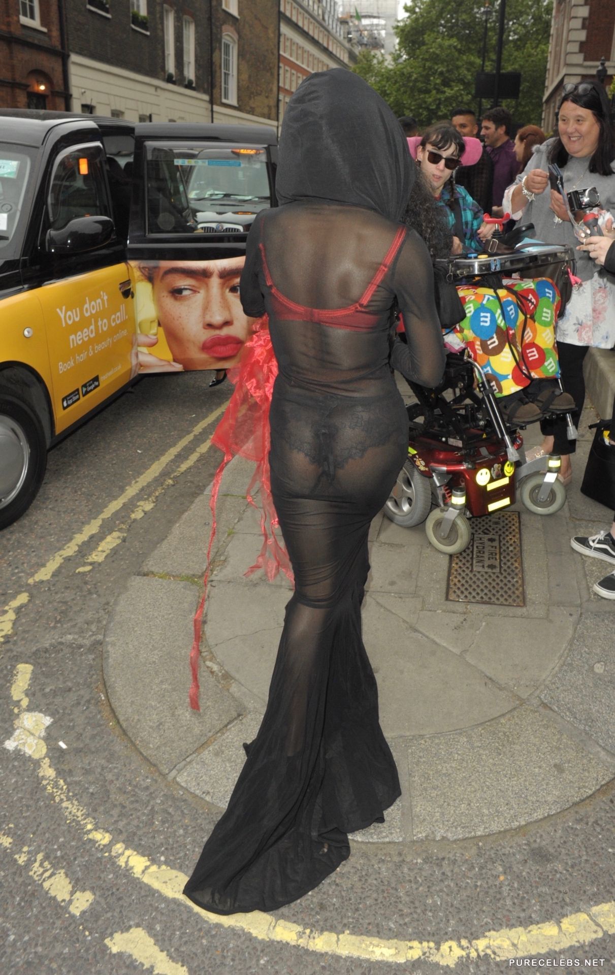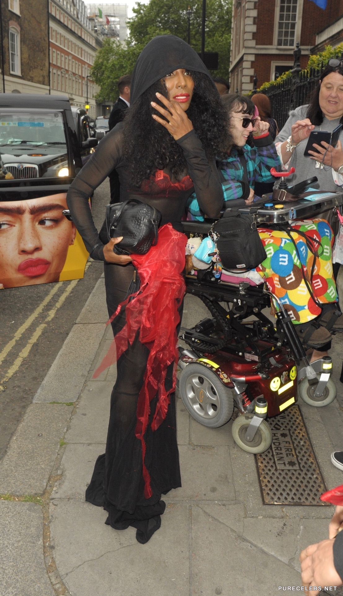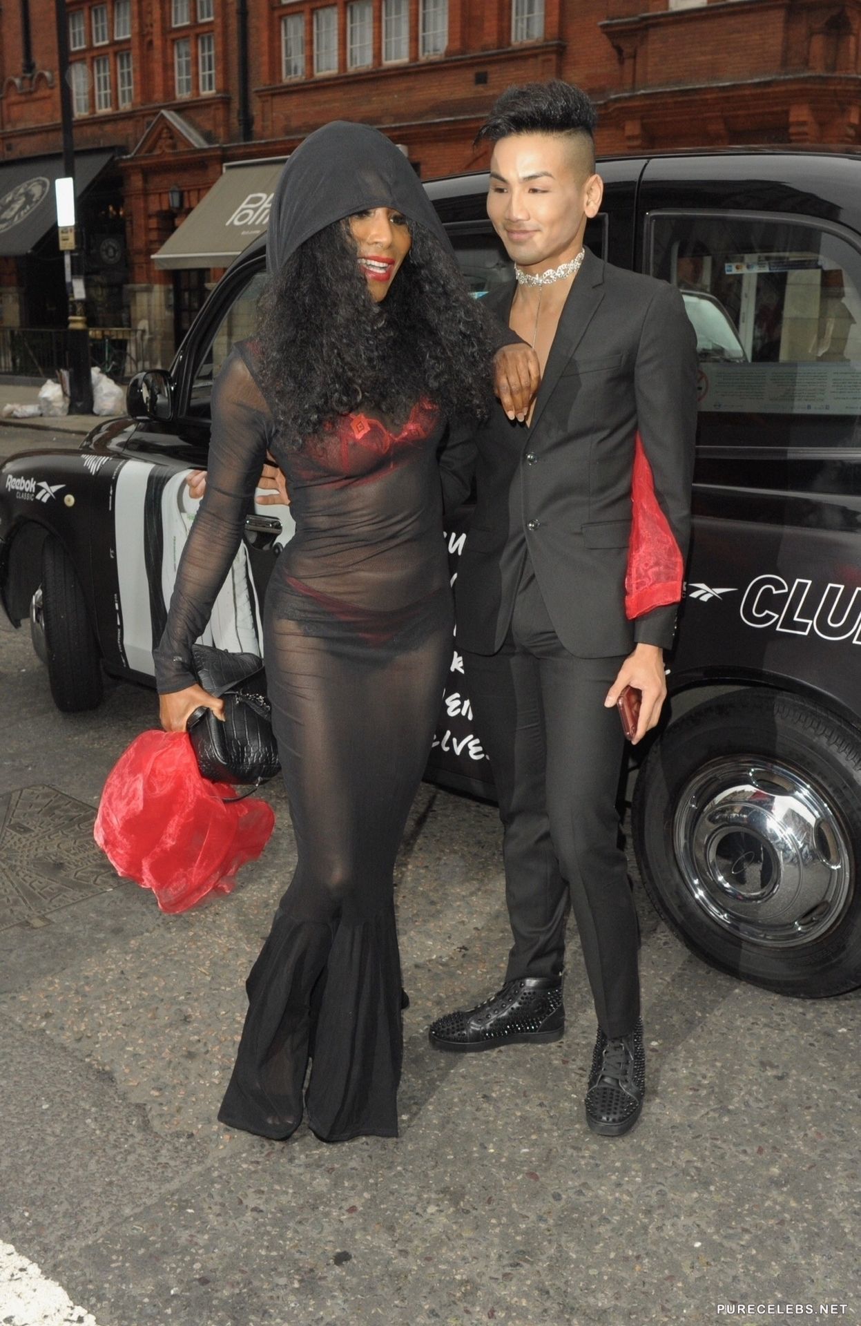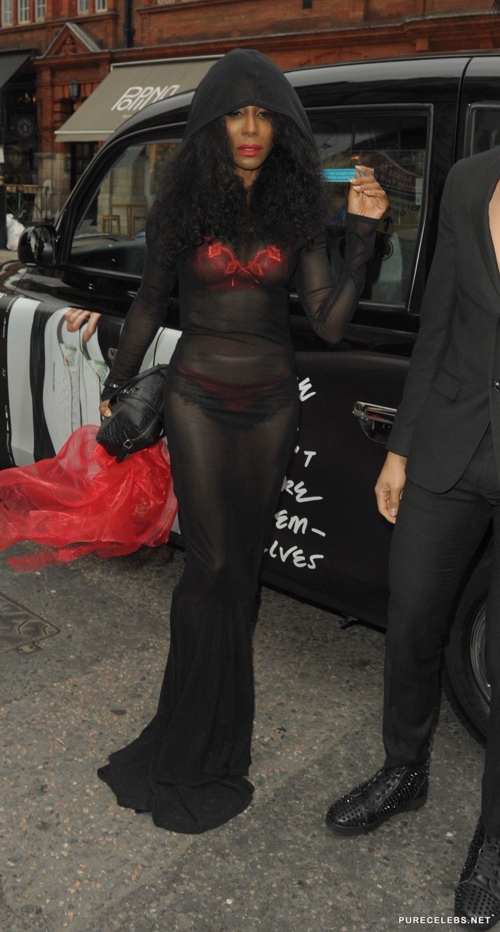 Sinitta, a famous American singer with a bright appearance and unusual outfits, who likes to attract the attention of the public. Recently, a celebrity was spotted in a long black translucent dress through which you could see her lingerie. She had a bright red bra and red-black panties, which were also translucent and you could see her awesome titties with hard nipples and her juicy delicious butt.