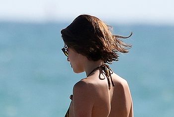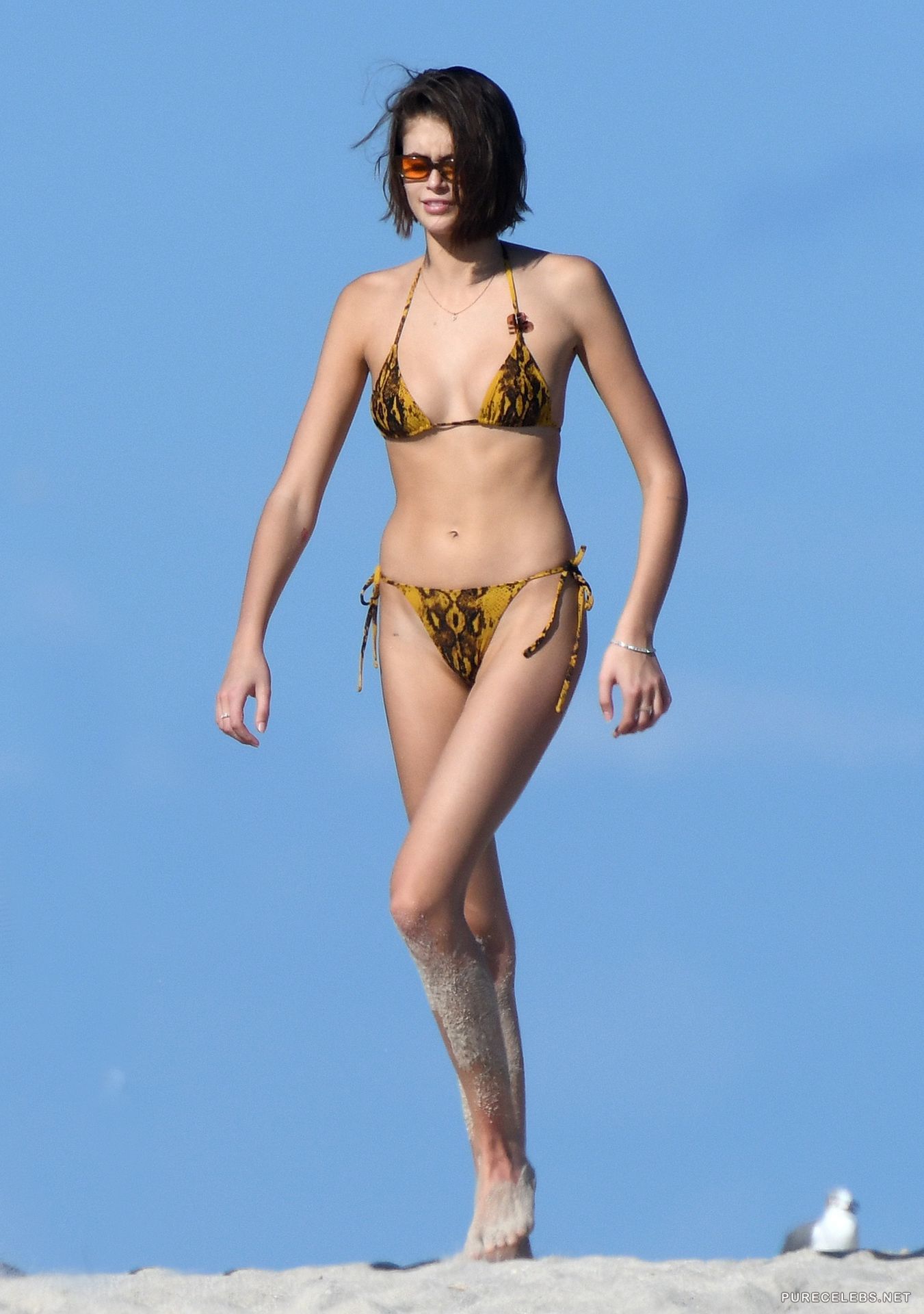 18-year-old American fashion model Kaia Gerber, daughter of supermodel Cindy Crawford, is already used to the constant attention of the paparazzi. So, during her beach vacation, this beauty was wearing a yellow bikini, which was very suitable for her. Small thongs perfectly demonstrated her beautiful ass and hardly covered her sweet pussy. It is also worth noting that her boobs looked just awesome in a small bra.