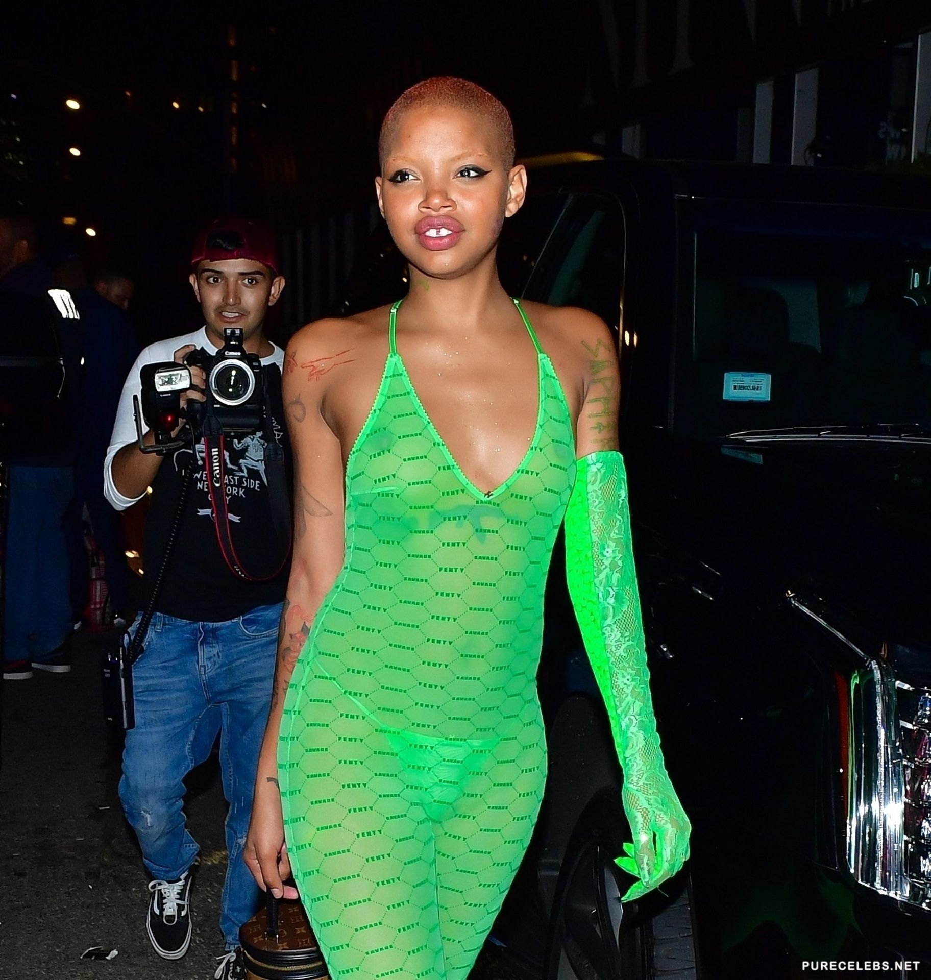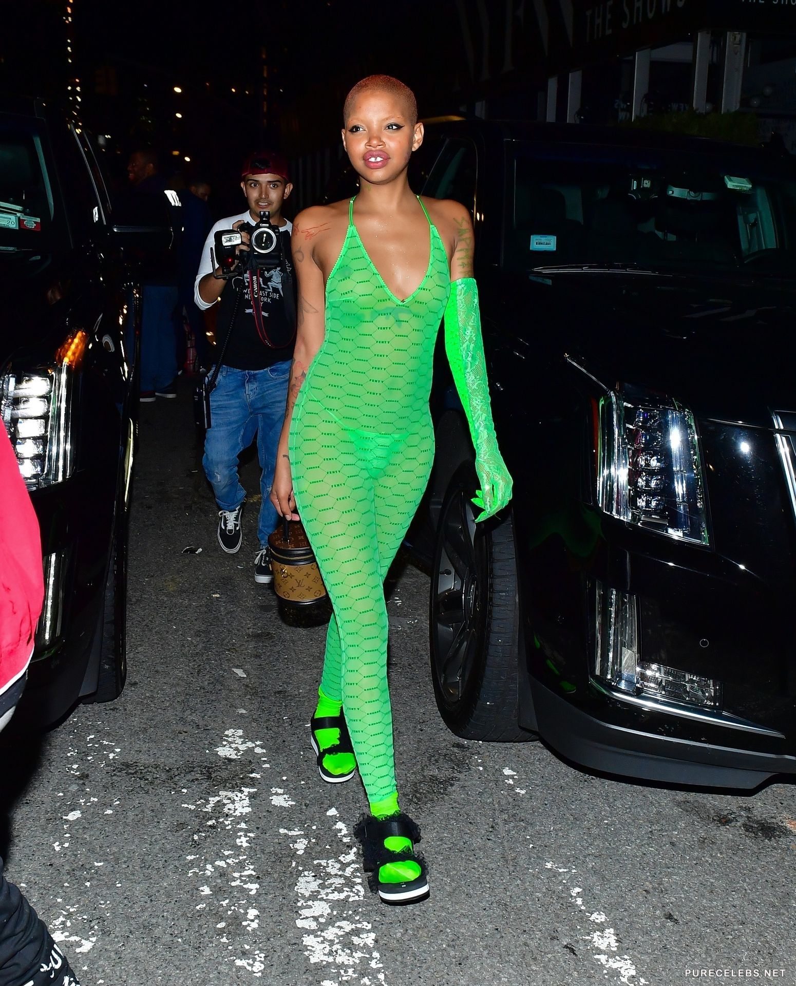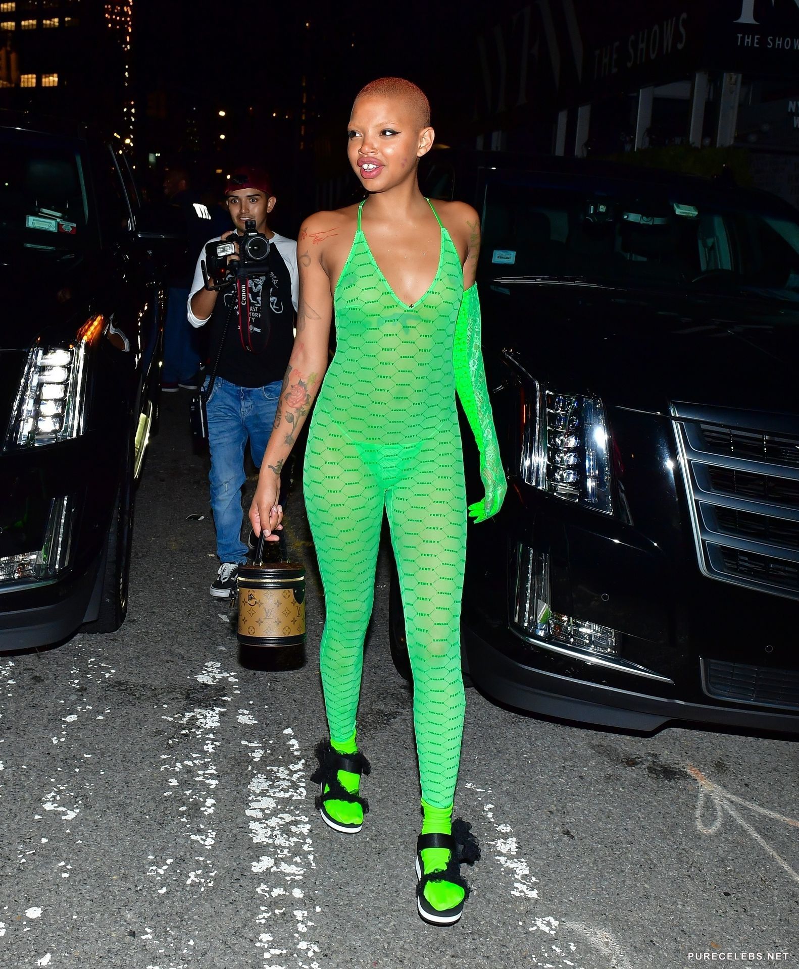 American model Slick Woods always dresses very brightly and defiantly, which certainly attracts the attention of the paparazzi. Recently, a celebrity was caught outdoors in a green jumpsuit that fitted her slender body, a green long glove and sandals with green socks. It is worth noting that the jumpsuit was translucent and through it you could see her little panties and her awesome tits with poking nipples.