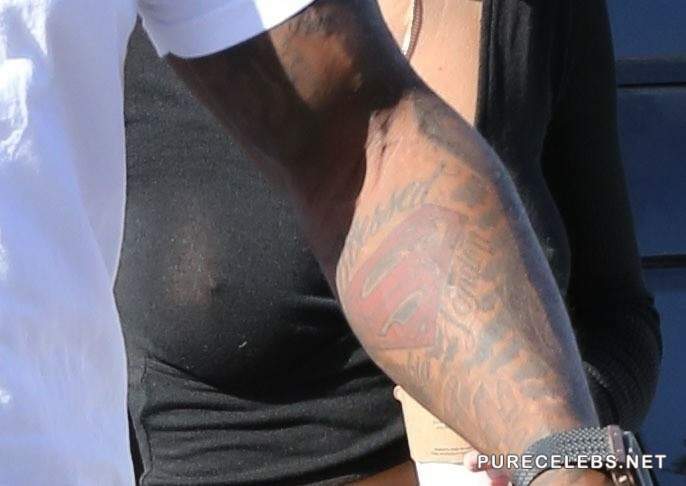 The youngest daughter of the famous singer apparently cares little for the reactions of the public, as she decided to stroll down the street in only a pair of jeans and shirt. The young model was enjoying her coffee and her breasts a bra-less freedom, as the nipples were sticking out from underneath her shirt. Walking around with a phone in one hand and a shopping bag in another, it seems like just a regular day for this girl.