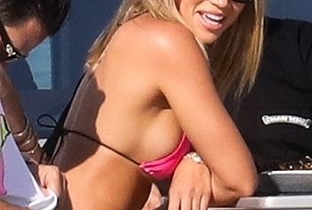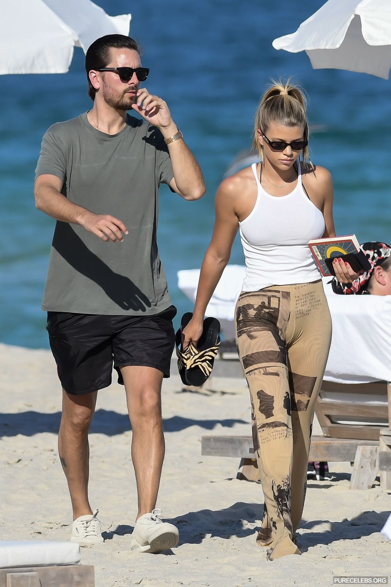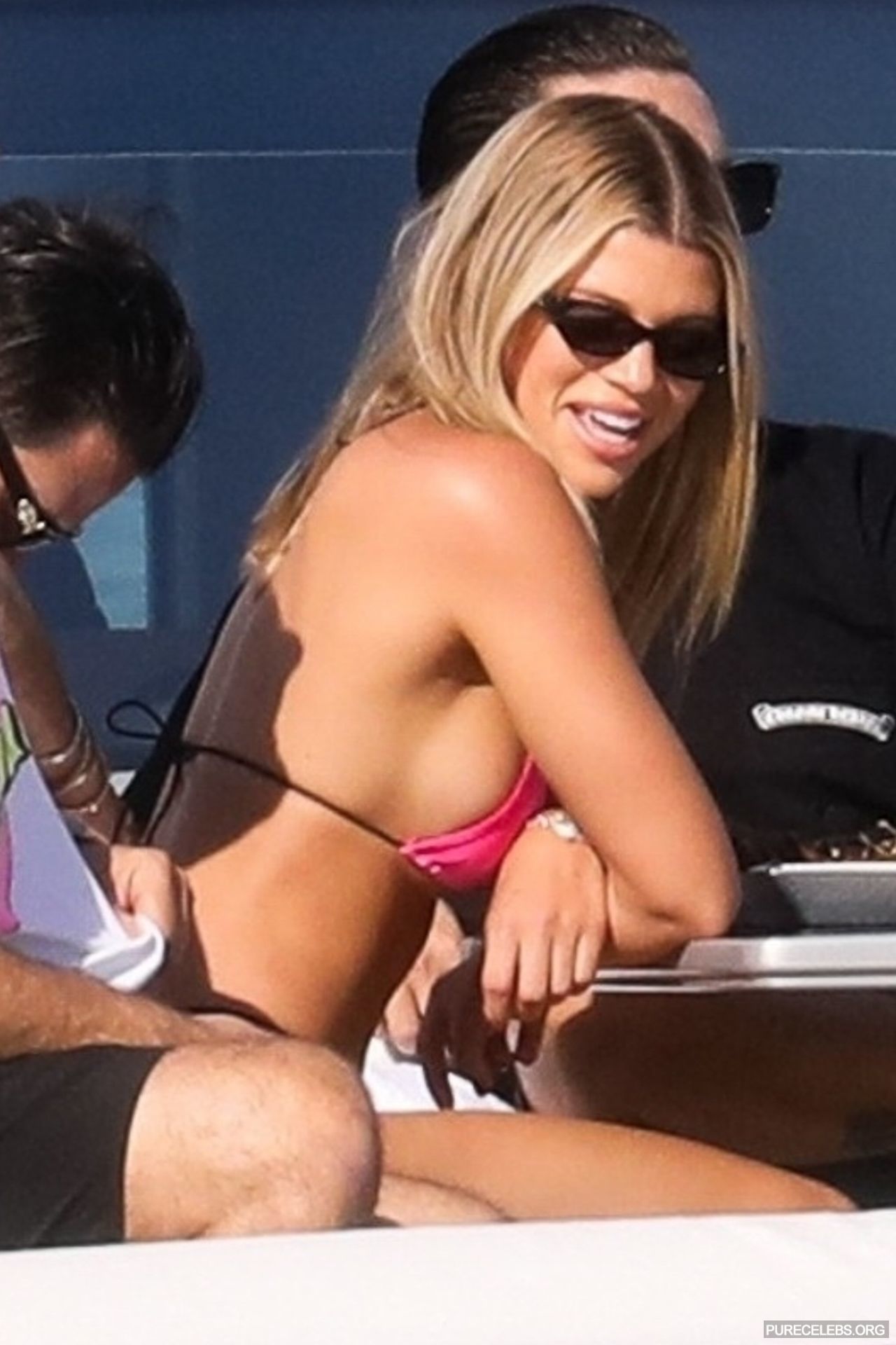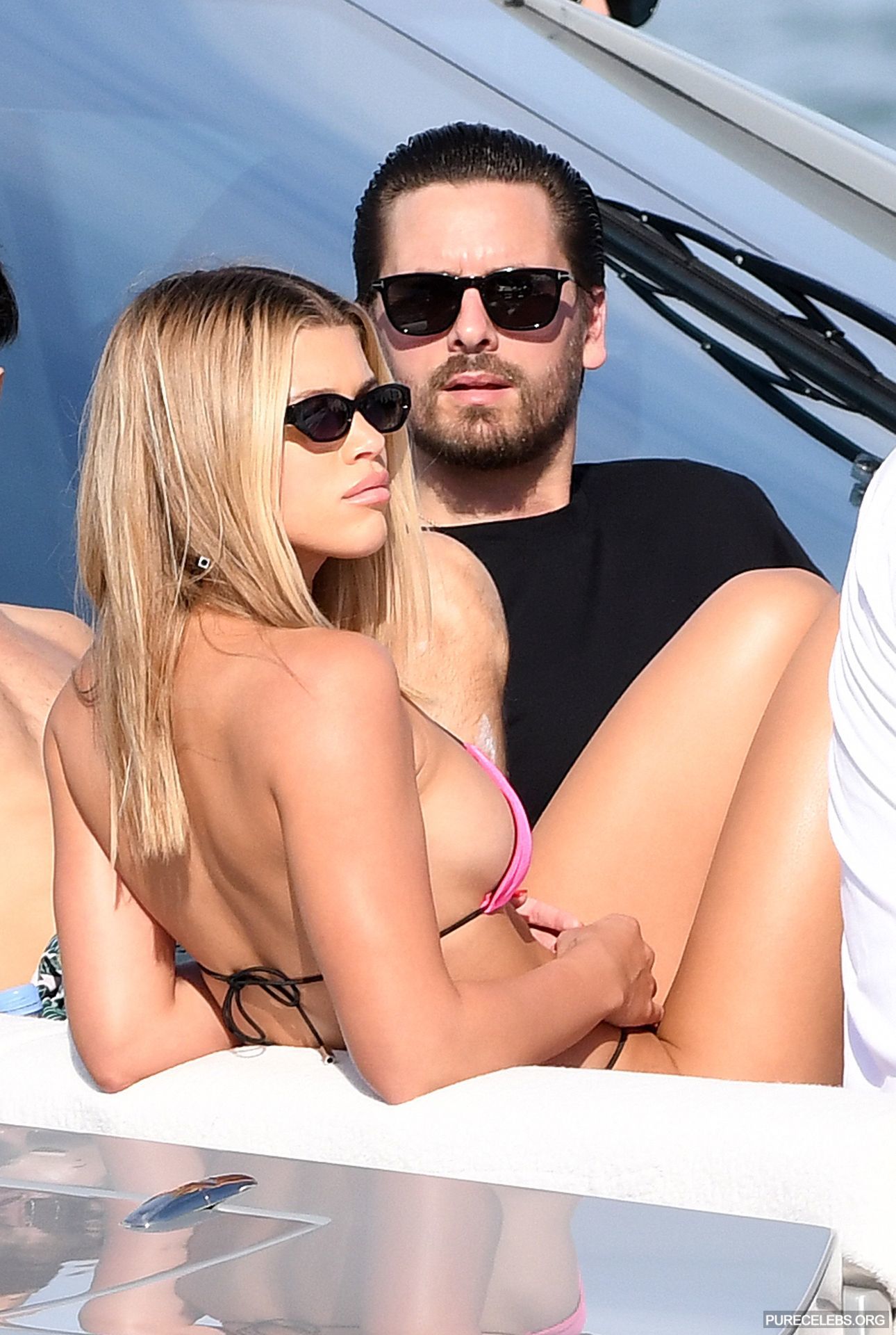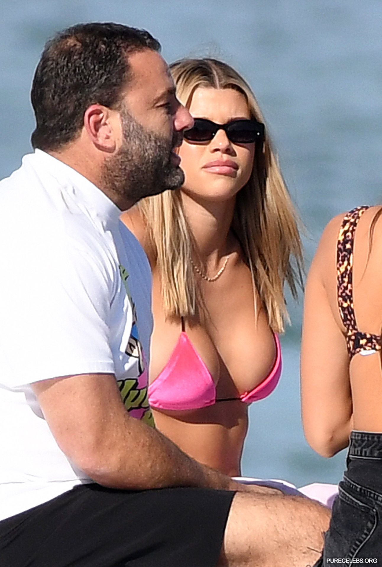 When the American model and fashion designer Sofia Richie appears on the beach, be sure that all eyes will be turned only to this hot blonde. And this is not surprising, because this celebrity dresses in very small bikinis, which almost do not cover her awesome body. For example, her puffy booty looked incredibly attractive in narrow pink thongs, and her big tits seemed ready to jump out of a small bra at any time!