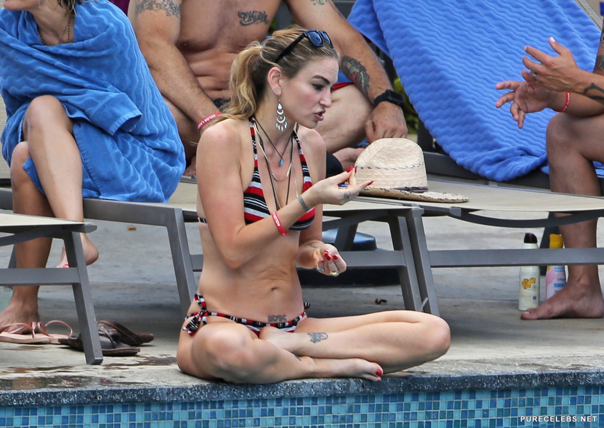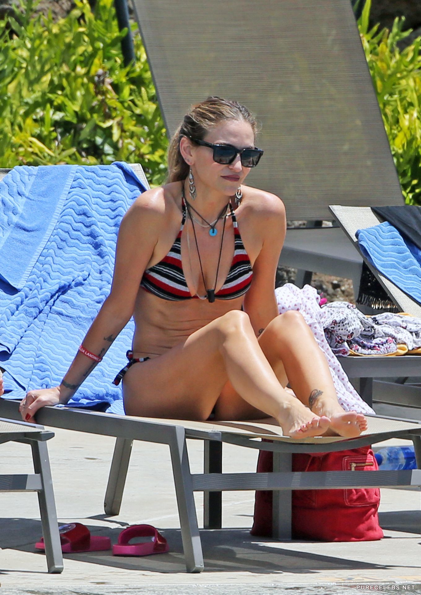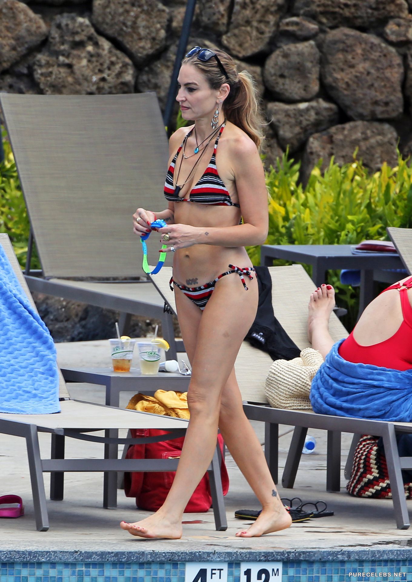 A famous American actress Drea De Matteo is the owner of a very slim body, judging by her new photos near the pool. A celebrity was sunbathing while lying on a sunbed in a striped bikini and dark sunglasses. When she got up then we had the opportunity to admire her amazing booty, a small flat tummy and awesome tits that seemed to be jump out of her bra. This star is extremely seductive and hot, isn’t she?