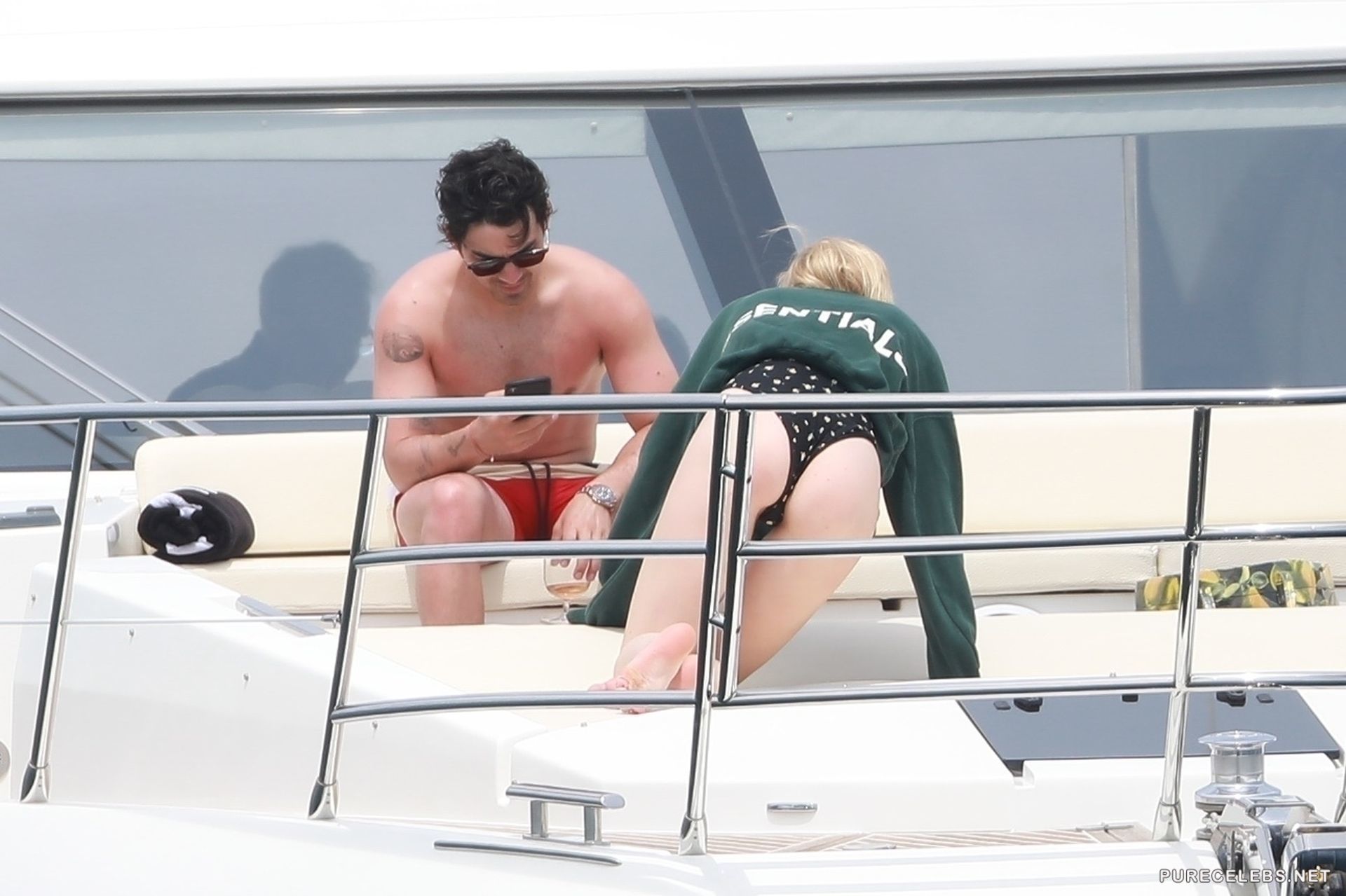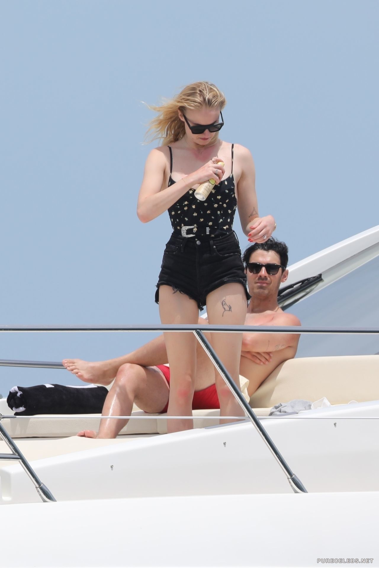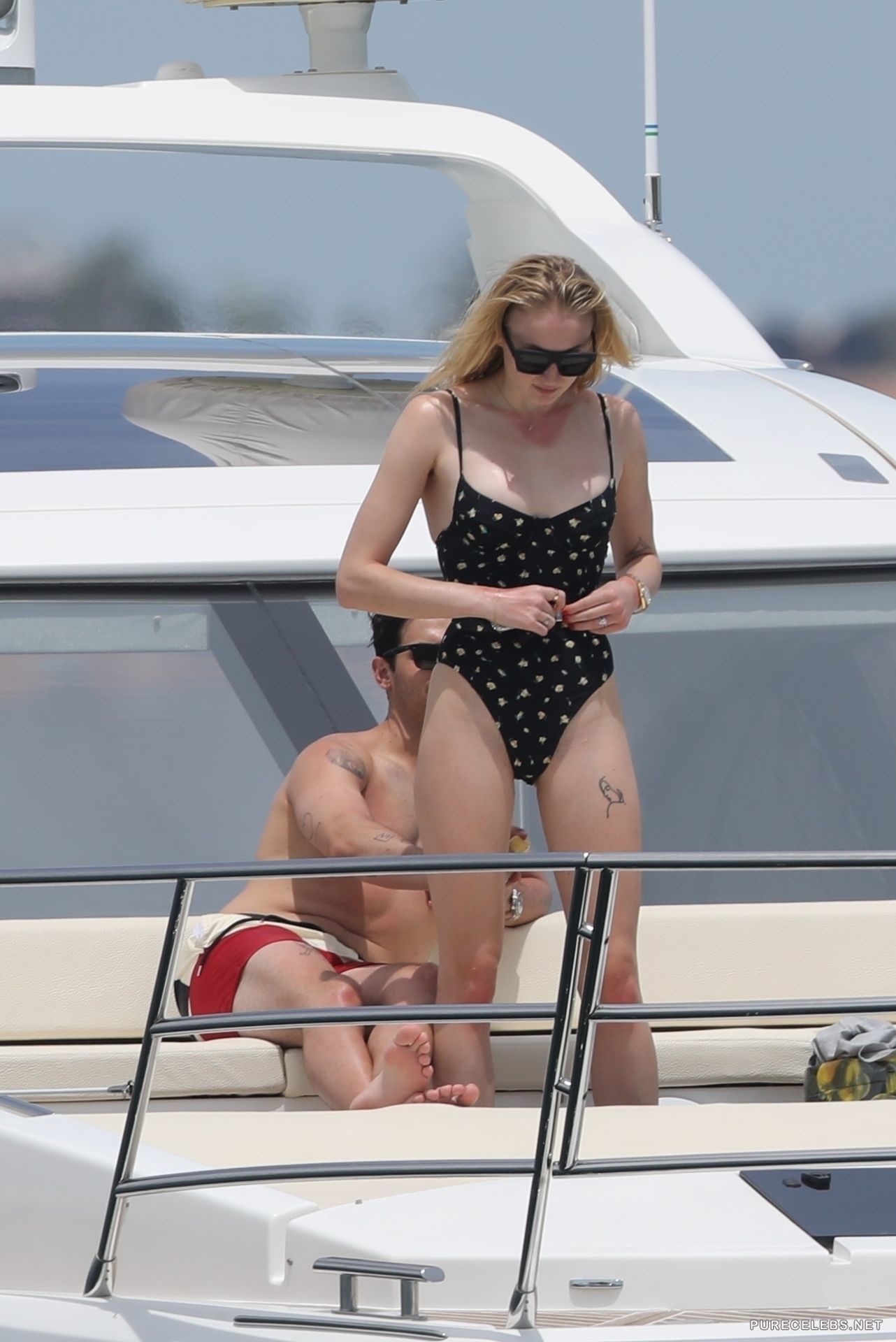 The 23-years-old actress Sophie Turner doesn’t cease to please us with her provocative photos. Recently, the famous actress was resting on a yacht wearing a tight black swimsuit that beautifully emphasized her slim figure. The star often bent, showing off her awesome buttocks covered with a narrow striped thong. She also smeared her breasts with lotion and it looked so sexy that it was impossible to take eyes off!