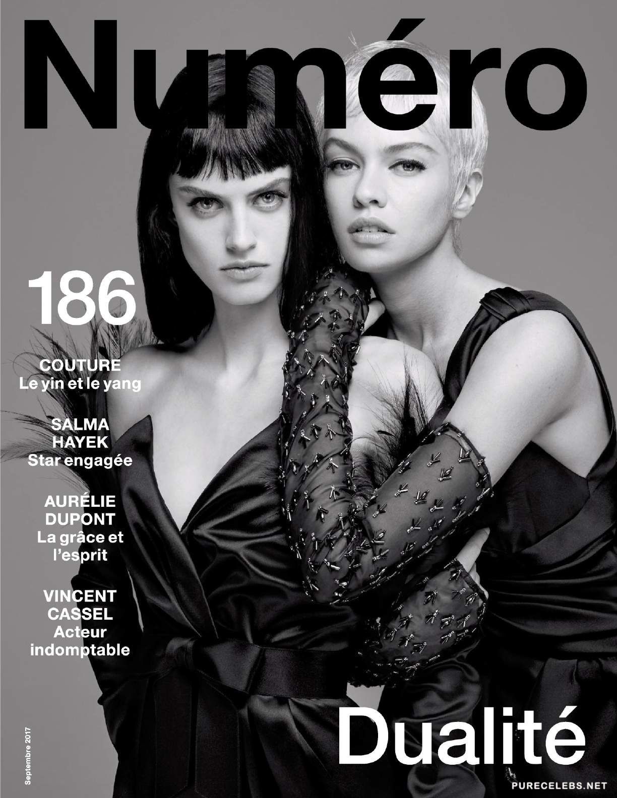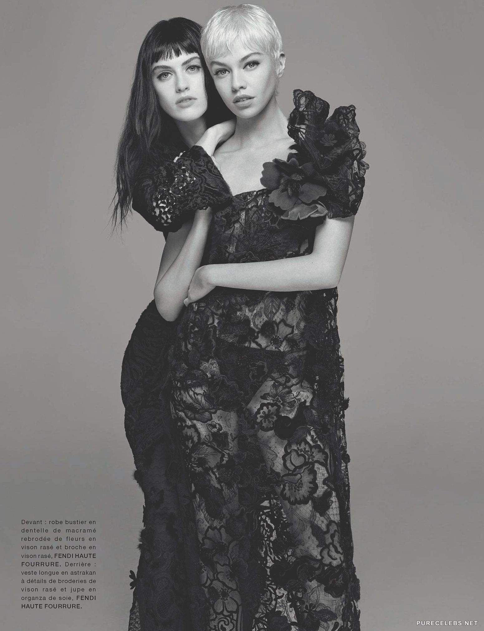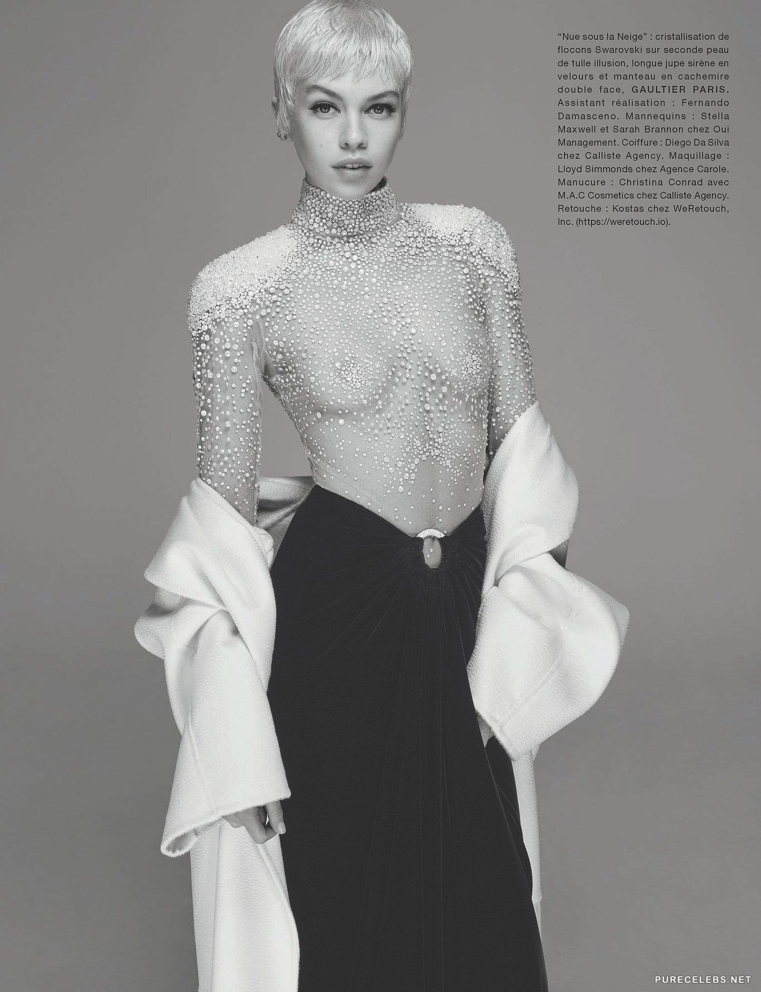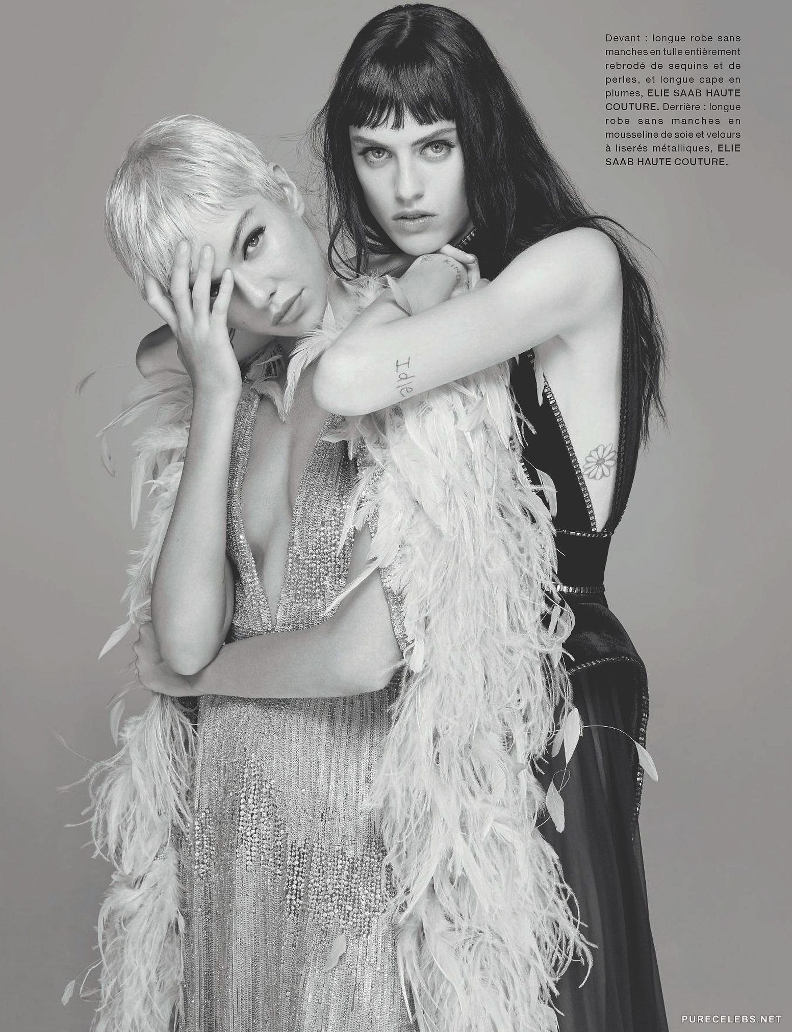 Supermodels Stella Maxwell and Sarah Brannon recently posed for the French magazine Numero in a series of black and white photos flaunting their naked chests. They were photographed wearing several different black and white outfits, each more revealing than the last. Their beautiful tits peek out of sheer shirts to greet the curious eyes of their fans. The models were pleased to display their assets while gently touching each other.