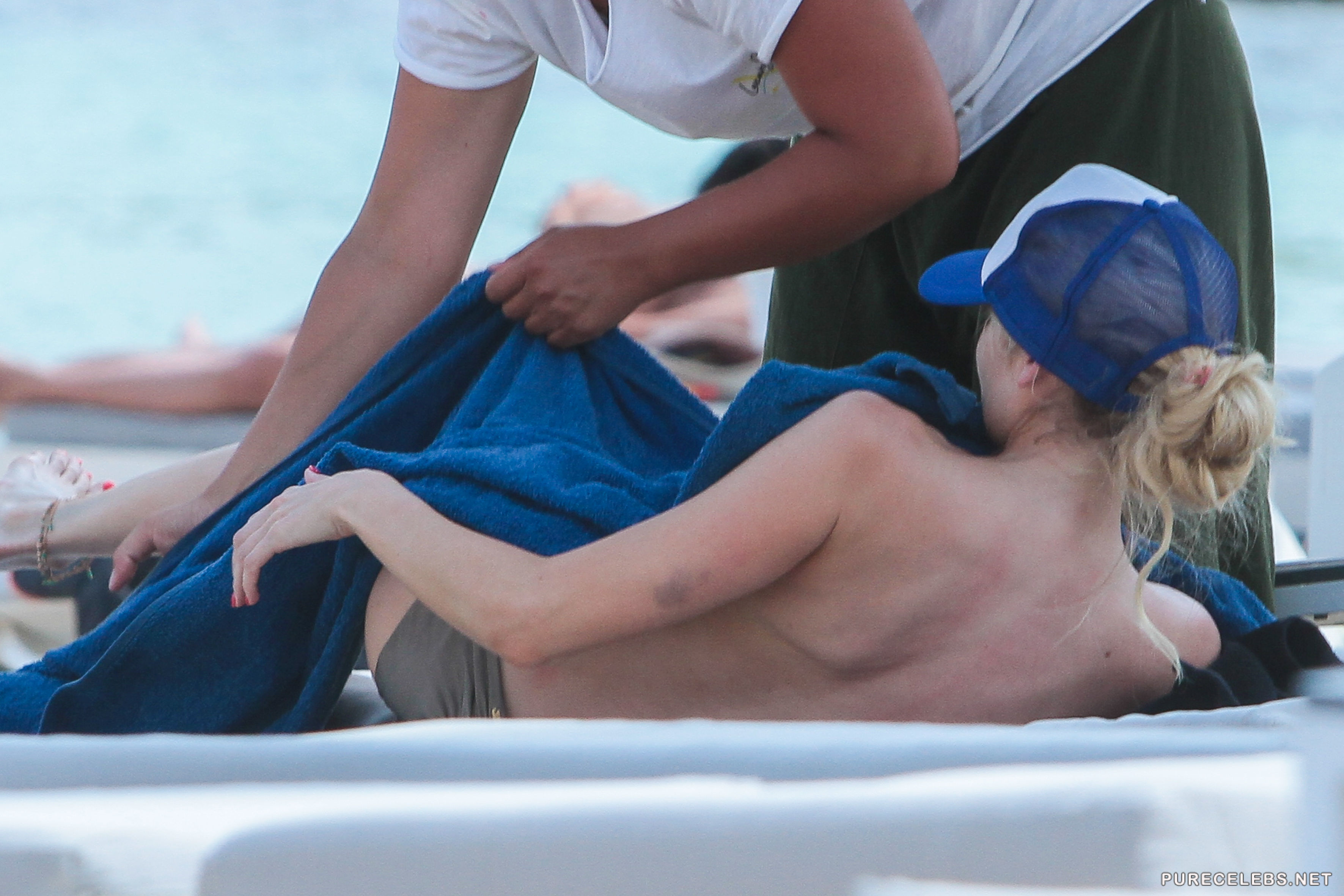 Stephanie Pratt adjusts her bikini on the beach as she talks with friends. She is out in order to relax after a hard day of working on the set and she does not care about the paparazzi around her that want to take pictures of her. She is prepared to give them a good show if that means that they will leave her alone.