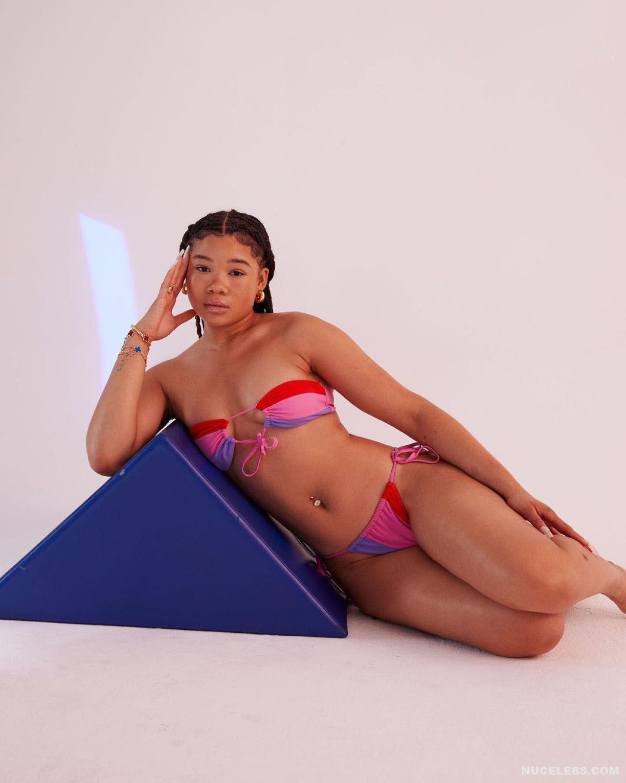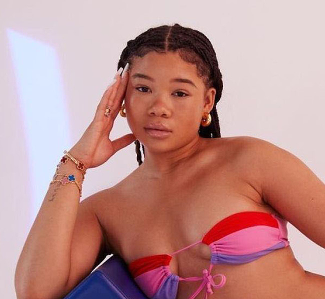 Sweet babe Storm Reid shows off her delicious body in a miniature bikini. Her ass in orange panties with yellow strings looked incredibly seductive. And when this 19-year-old actress posed in a colorful bra, it seemed to be too small for her juicy boobies! Also, this celebrity looked very sexy in a pink and red swimsuit while sitting on a white armchair.
