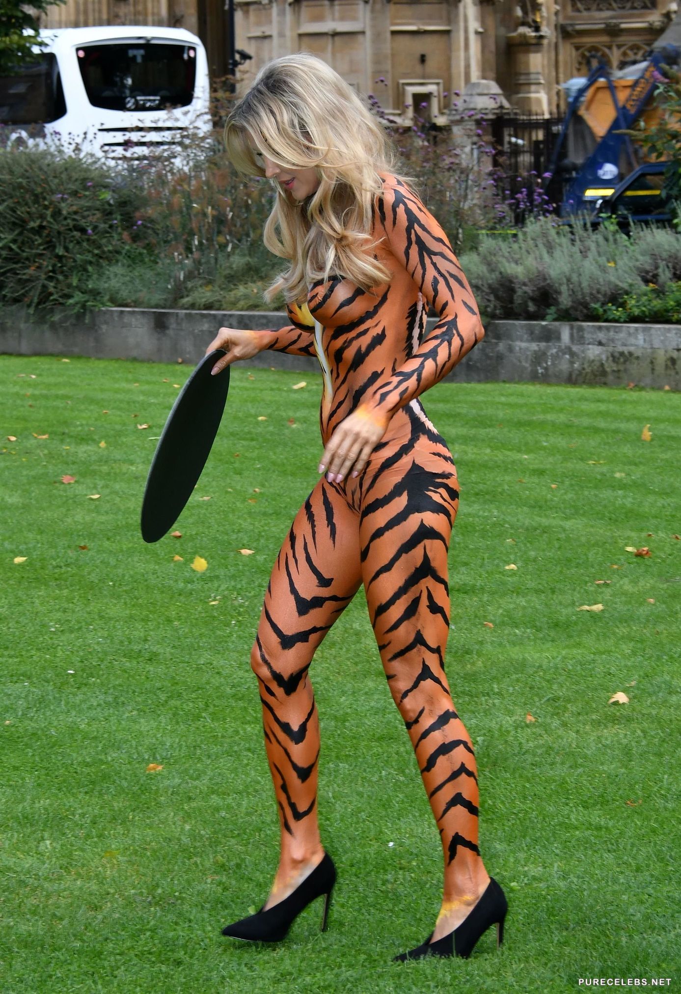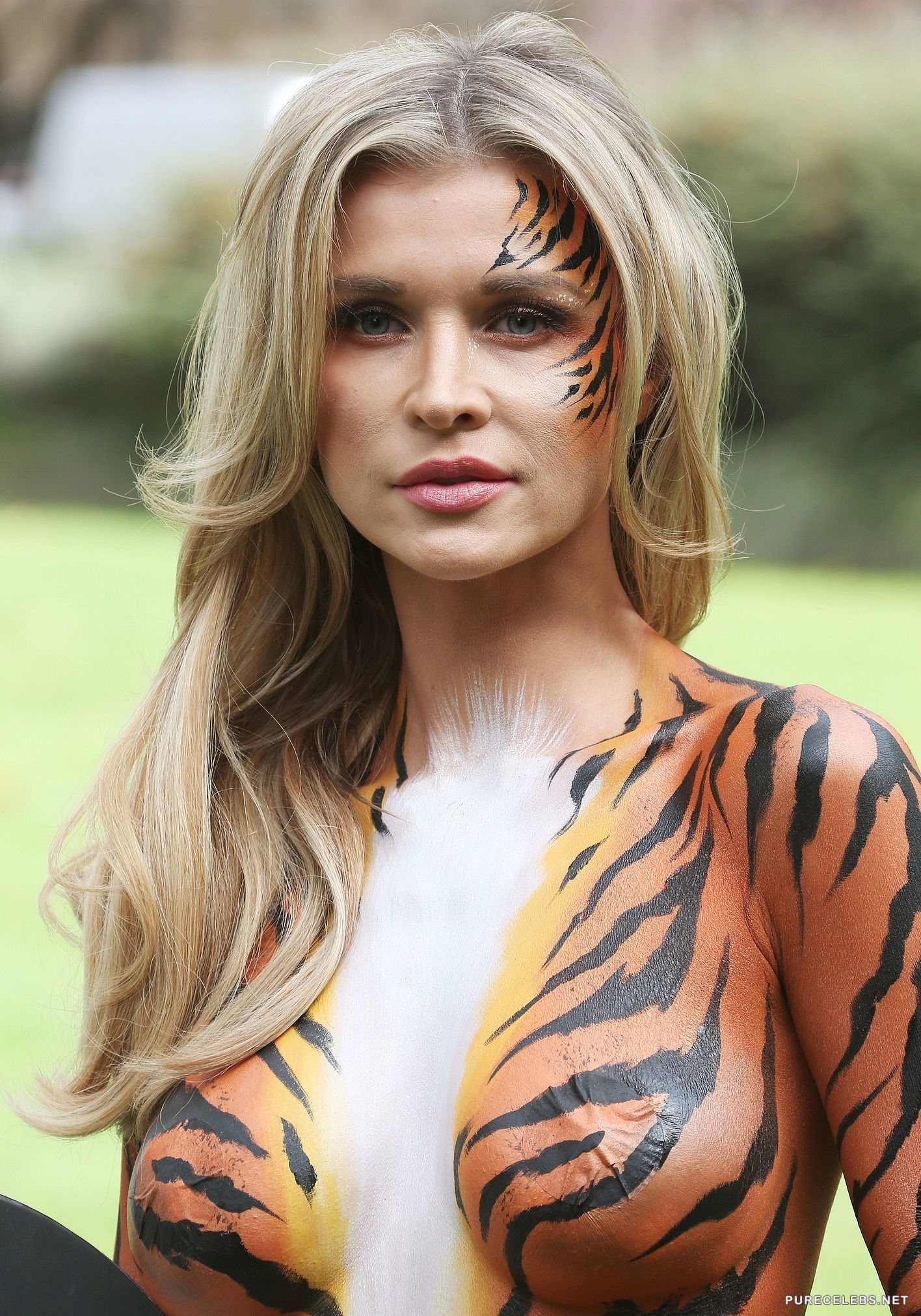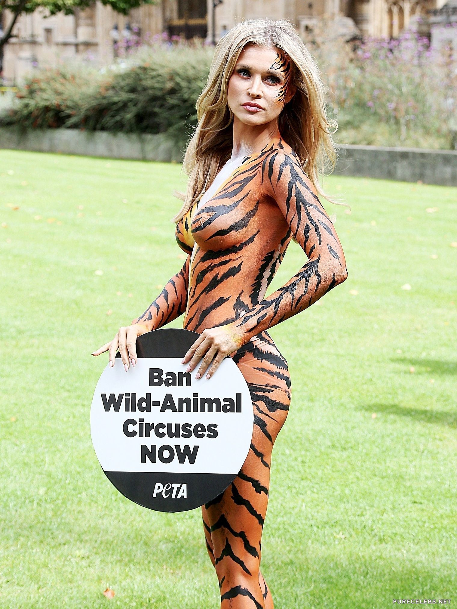 It’s always a treat to see celebrities get involved in charity work, especially when they do it in the nude. Supermodel Joanna Krupa was recently photographed covered in body-paint mimicking a tigers fur. The beautiful blonde took part in PETA campaign and showed off her naked body posing for cameras with a sign urging people to ban circuses. We admire her activism and effort almost as much as we admire her plump boobs.
