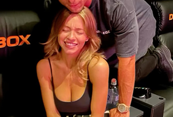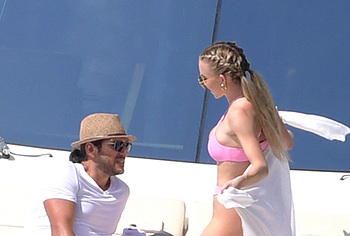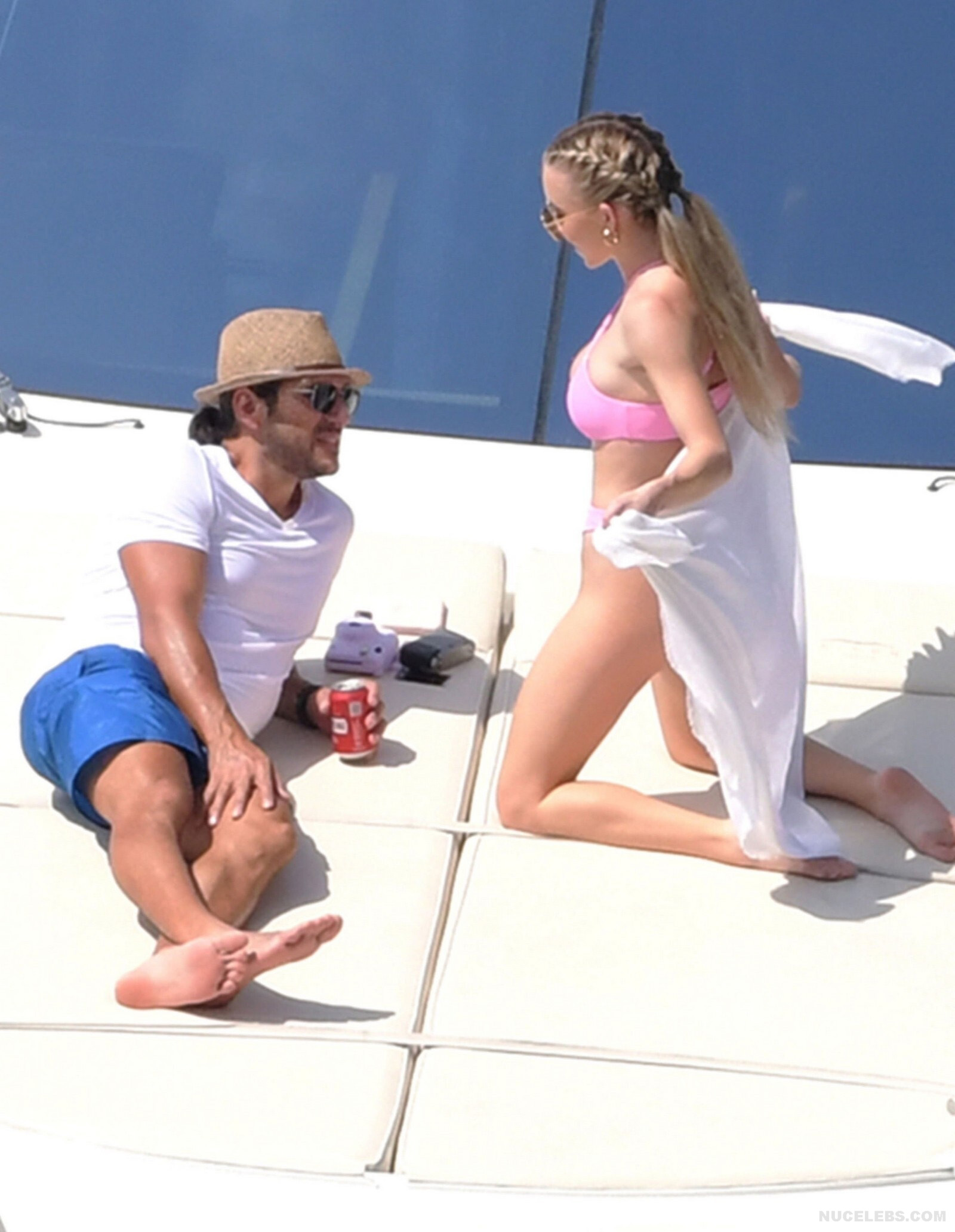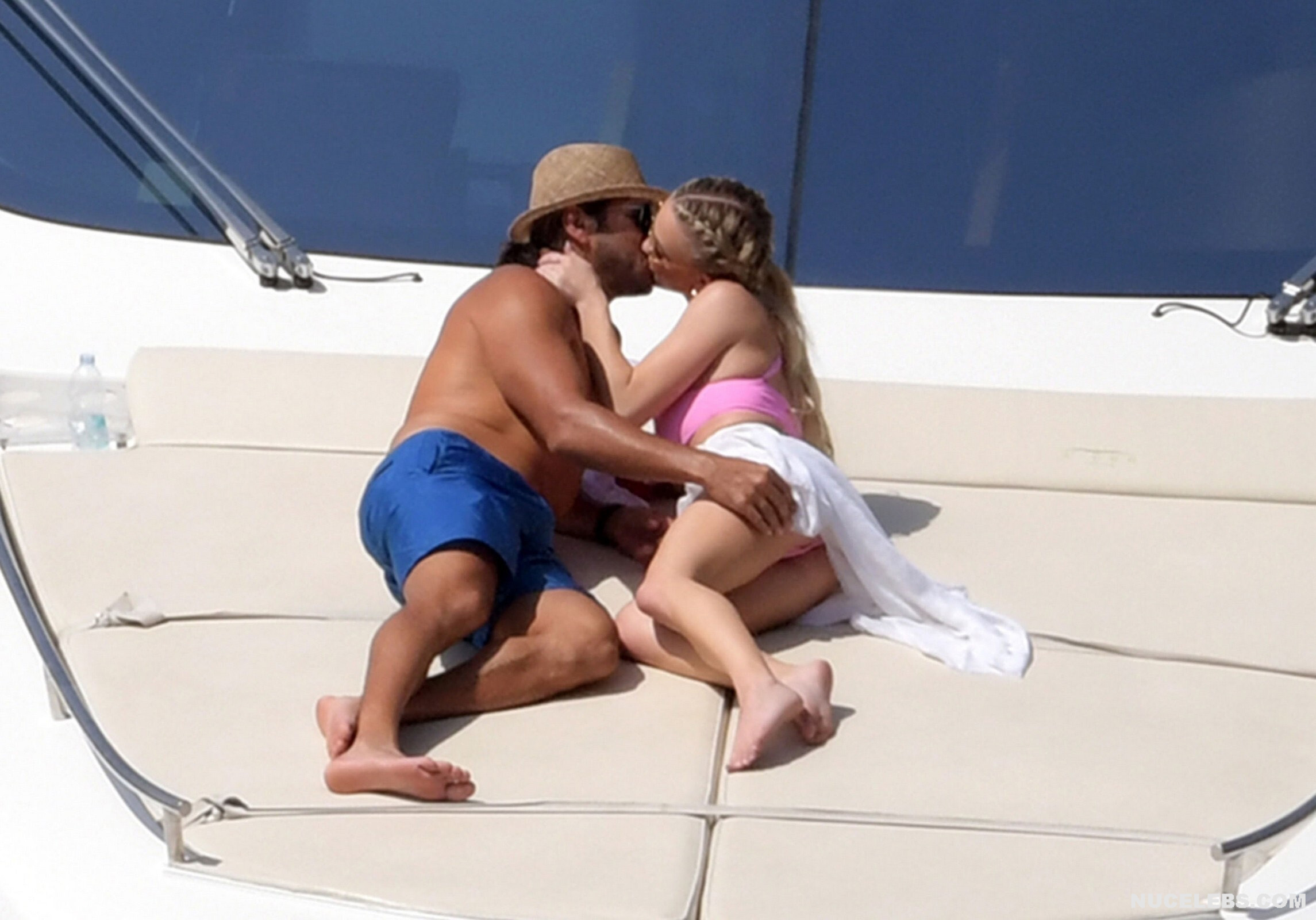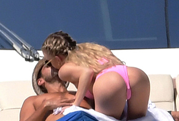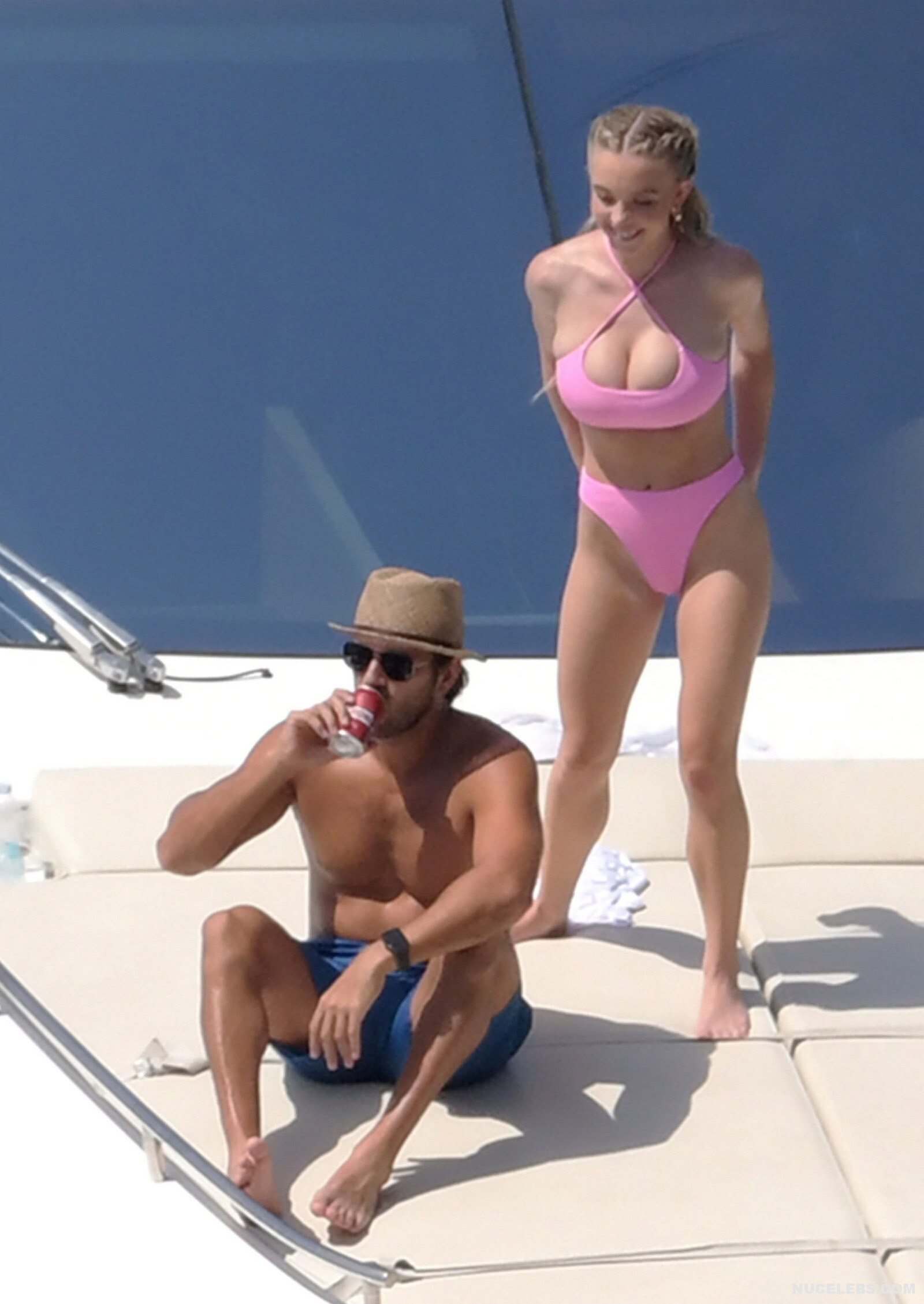 Sydney Sweeney loves to tease everyone with her big juicy tits and peachy ass! This American actress loves to wear thongs in public. So, the paparazzi photographed Sydney Sweeney’s sweet booty and stunning cameltoe in a miniature pink thong when she bent over on a yacht to kiss a man. This beauty also flirted in front of the camera, sticking out her tongue and squeezing her huge tits in her hands, peeking out from the low neckline of her white blouse.