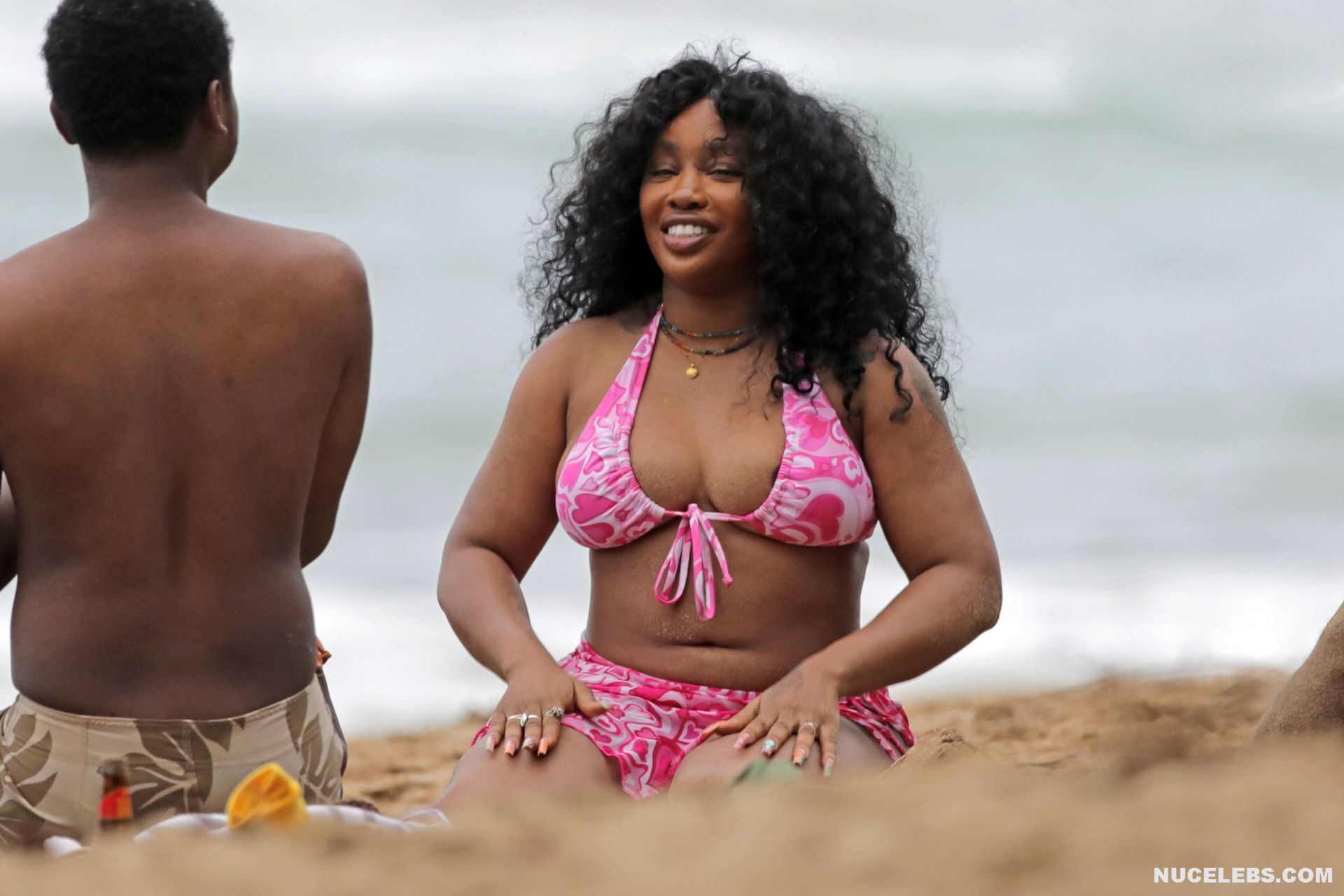 Get ready to howl with delight as you look at SZA’s nude photos in the laundry room. This American soul singer felt completely confident as she squatted next to the washing machines. Moreover, from the clothes she wore only a veil and pink shoes. Agree, it was impossible to look away from SZA nude boobs and peach buttocks! And the paparazzi photographed SZA nipslip moment. This 33-year-old star in a pink bikini was just talking to a man on the beach when her big boob with a brown nipple slipped out of her bra.