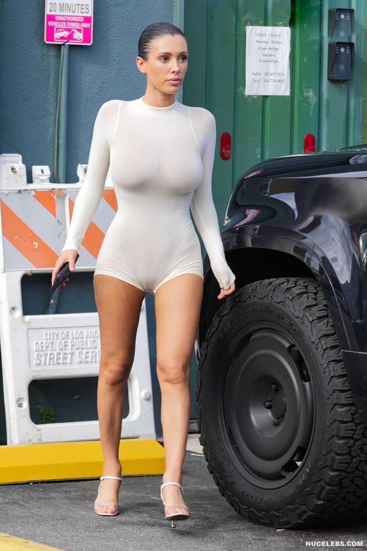 It seems that Bianca Censori has decided to gain a foothold in the ranking of all nude celebs. This hot beauty appeared in public again in a revealing outfit. This time the 29-year-old star was wearing a white short bodysuit with long sleeves. Moreover, Bianca Censori’s nude tits were visible through a transparent top, as well as her amazing buttocks. Well, this time you could even see this beauty’s pussy, because she decided not to wear underwear with her outfit!