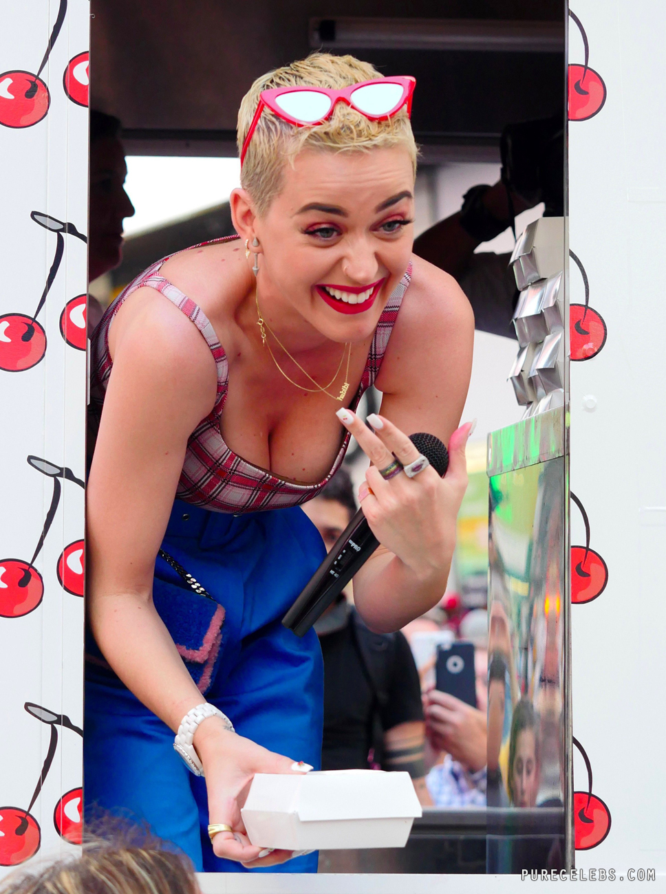 Katy Perry is one hell of a hot singer. She has adorable face with charming smile, and a body that is worth dying for! Because when you take her whole into consideration, she has awesome big boobs and perfectly round booty! When we said boobs, paparazzi caught her deep cleavage during her new song premiere called “Bon Appetit” in New York! Follow through and enjoy in her magnificent cleavage!