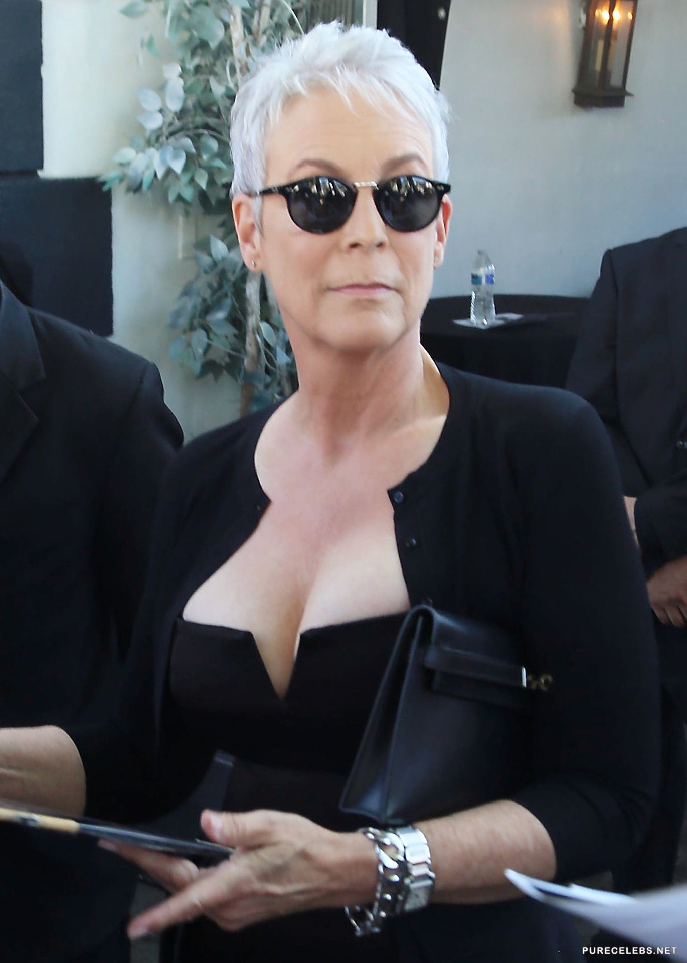 American actress Jamie Lee Curtis, the daughter of legendary actors Janet Leigh and Tony Curtis, was caught by paparazzi during one event. The bright blonde in black glasses was discussing something very zealously and looked incredibly sexy. She was wearing a tight-fitting black dress with a great cleavage, and everyone around was simply unable to look away from her huge, juicy boobs. This star is so hot!