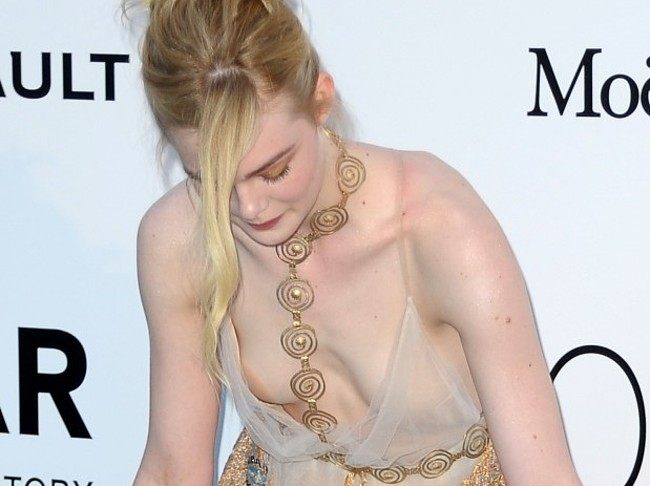 It looks like blonde hottie Elle Fanning wasn’t thinking about down blouse shots at the movie awards when she put on this dress, but she likes to tease with tiny outfits judging by these pictures. You can see her little tits, as well as shots of her white panties thanks to the watchful eyes of photographers that aren’t afraid to capture a celebrity babe’s real beauty with some candid photos.
