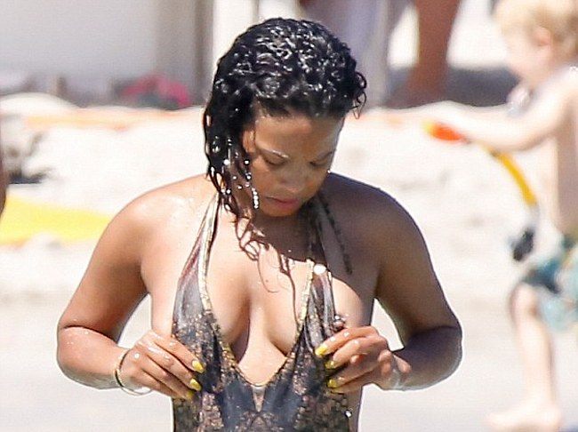 Black celeb Christina Milian is a hot booty babe that’s tearing up the music charts with her hits, so it’s no wonder she’s ending up in paparazzi galleries like this one. In this series of candid photos on the beach, you can get a look at her curvy body, and see a nipslip thanks to her tiny one piece bikini. Oops, guess she’ll be more careful next time.