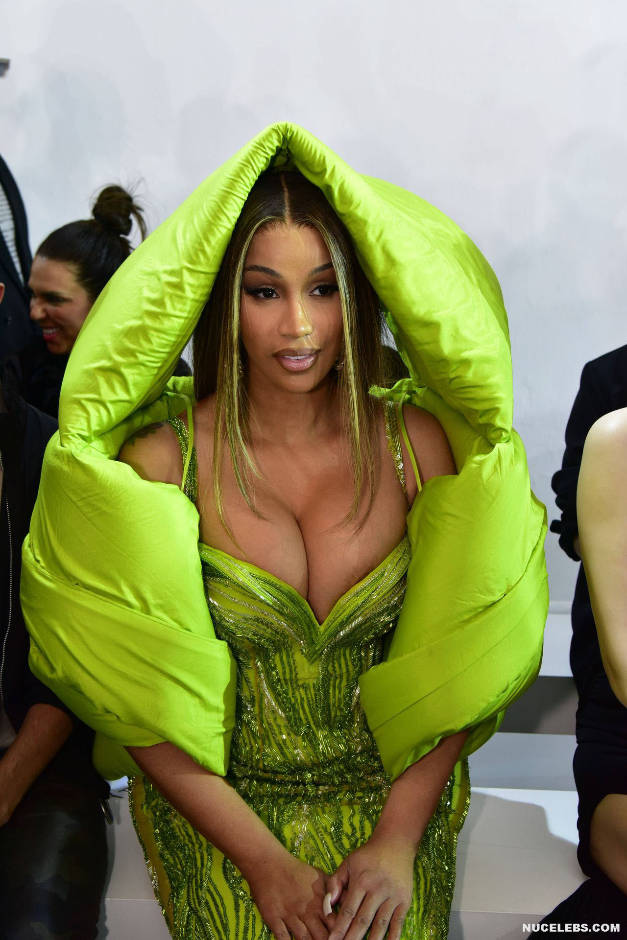 Cardi B loves to shock the audience with her outfits! At one of the events, this celebrity appeared in a long green dress embroidered with rhinestones and with a green fluffy cape on her head and shoulders. Particular attention was riveted to the awesome cleavage of this American hip-hop artist. And not in vain, because very soon Cardi B nude tit with a brown nipple slipped out of the low neckline of the dress. And the paparazzi managed to catch this oops moment!