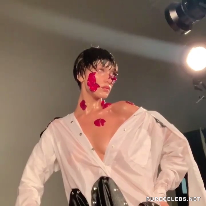 American model Bella Hadid starred in a very sensual erotic photo shoot, which certainly will not leave you indifferent. Hot beauty posed under a stream of water. Her face was decorated with rose petals, and she was dressed in a white shirt, which was wet and perfectly fitted her chic body. At some point, her shirt moved down and you could see her awesome boob with areola nipple.