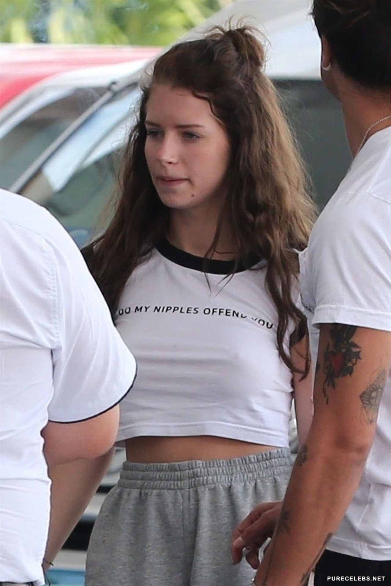 Younger sister of Kate Moss, pretty and quite petite girl, Lottie Moss was caught by paparazzi, recently, when she went out in baggy pants and crop top, obviously without a bra, so we could not clearly see her tits, but pokies were more than obvious, even from afar. Maybe that’s why she had the “Do my nipples offend you” written on her shirt, just in the case someone notices it.