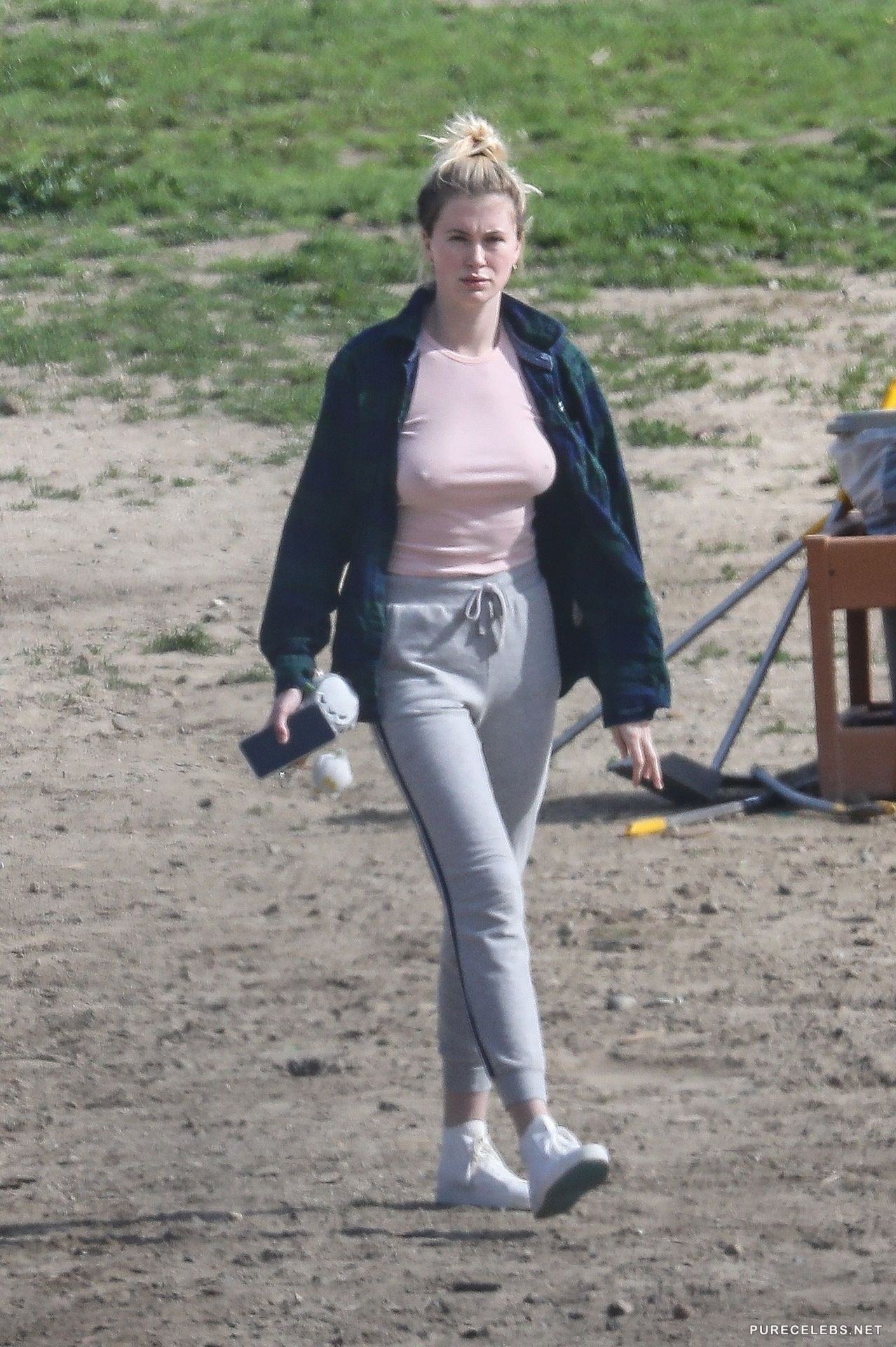 Ireland Baldwin goes out on a cold day and she does not put her bra on. We all notice it since her nipples get hard from the cold and they start poking through her top. She even takes off her jacket so we can have a good view of her body as she turns around to check something out. Her massive tits are really prominent.