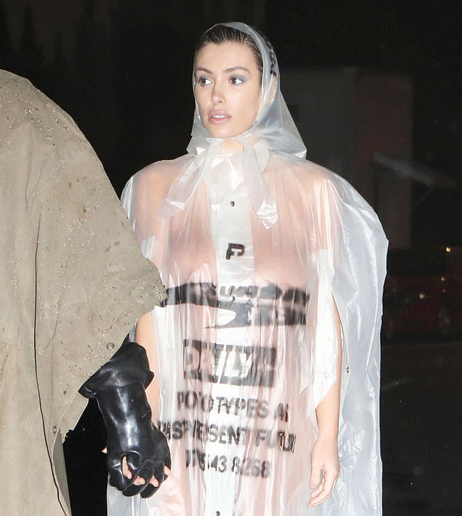 Bianca Censori was not shy about appearing completely nude in public. This hot beauty looked very unusual in an outfit that consisted of a white cellophane bag with black inscriptions. A man in a suit and mask walked hand in hand next to her, and as one might assume, it was her husband. However, let’s return to Bianca Censori, because when she walked, through the transparent film you could see her nude juicy tits, as well as her awesome ass!