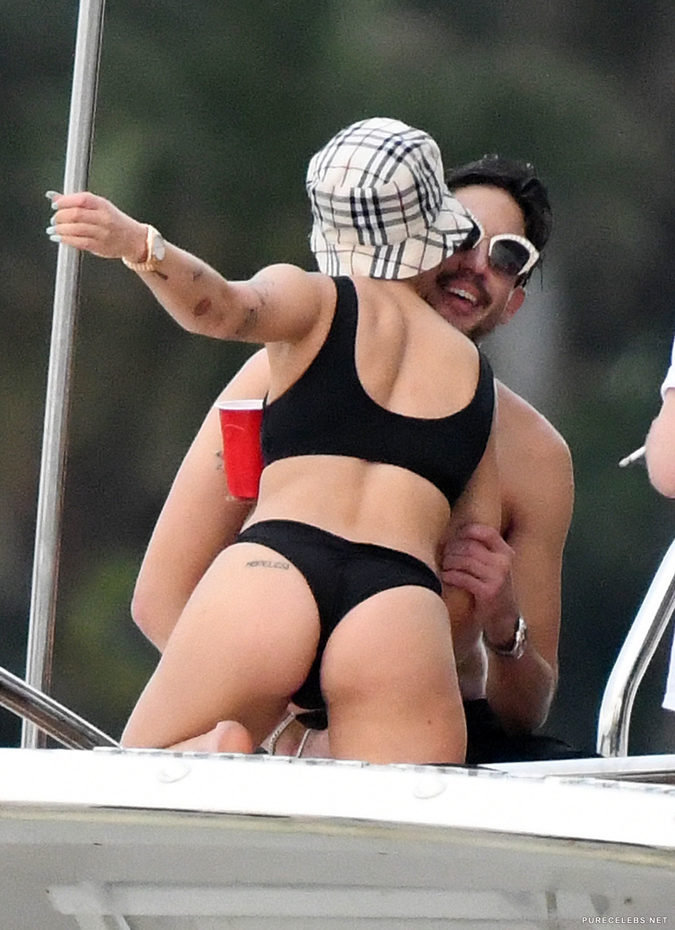 Teen pop sensation Halsey never fails to surprise us with her provocative style and outfits, and this bathing suit she wore to a yacht party is no exception. The lovely blond put on a black thong bikini that let her massive ass hang loose and jiggle in the sun, while her cleavage was exposed in the tiny top. Halsey seemed to be having a lot of fun with her friends and enjoying all the attention.