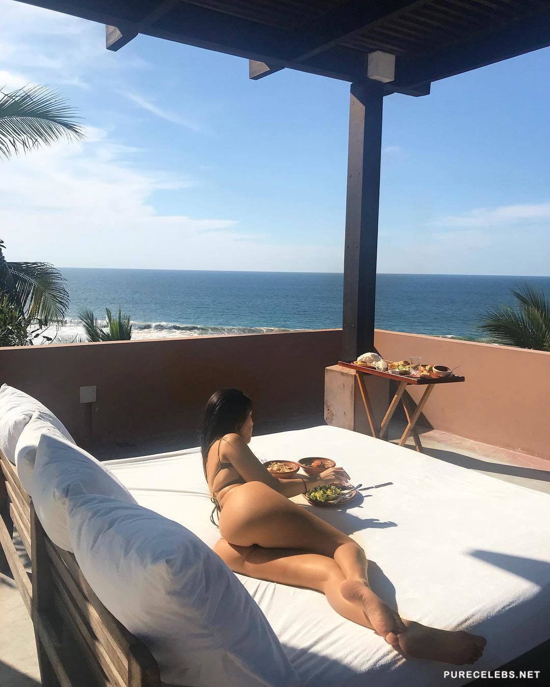 Kim Kardashian recently posted a photos of herself on a vacation. She is lying on the bed, while sun is caressing her skin. All the clothing she has on herself is tiny two piece bikini. That thong bikini bottom is not covering anything, but rather it is covered by her plump juicy ass, as she lays on the bed, suggestively sending a message that she wants some good fucking.