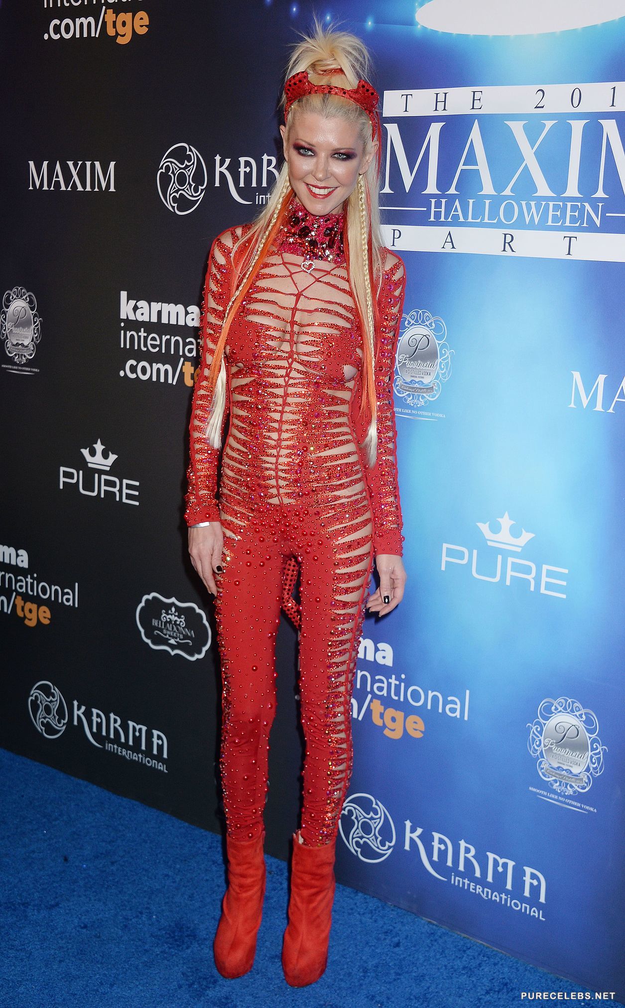 Tara Reid is well known for being a party girl and surely she could not miss the Maxim magazine Halloween party this year. This slim blond came to the party dresses in a very naughty costume, she wore a bright red devil costume. Her shiny little horns and long red tail were just the cherry on top of this sexy cake. Her red jumpsuit had cutouts in all the right places allowing fans to see her gorgeous boobs.