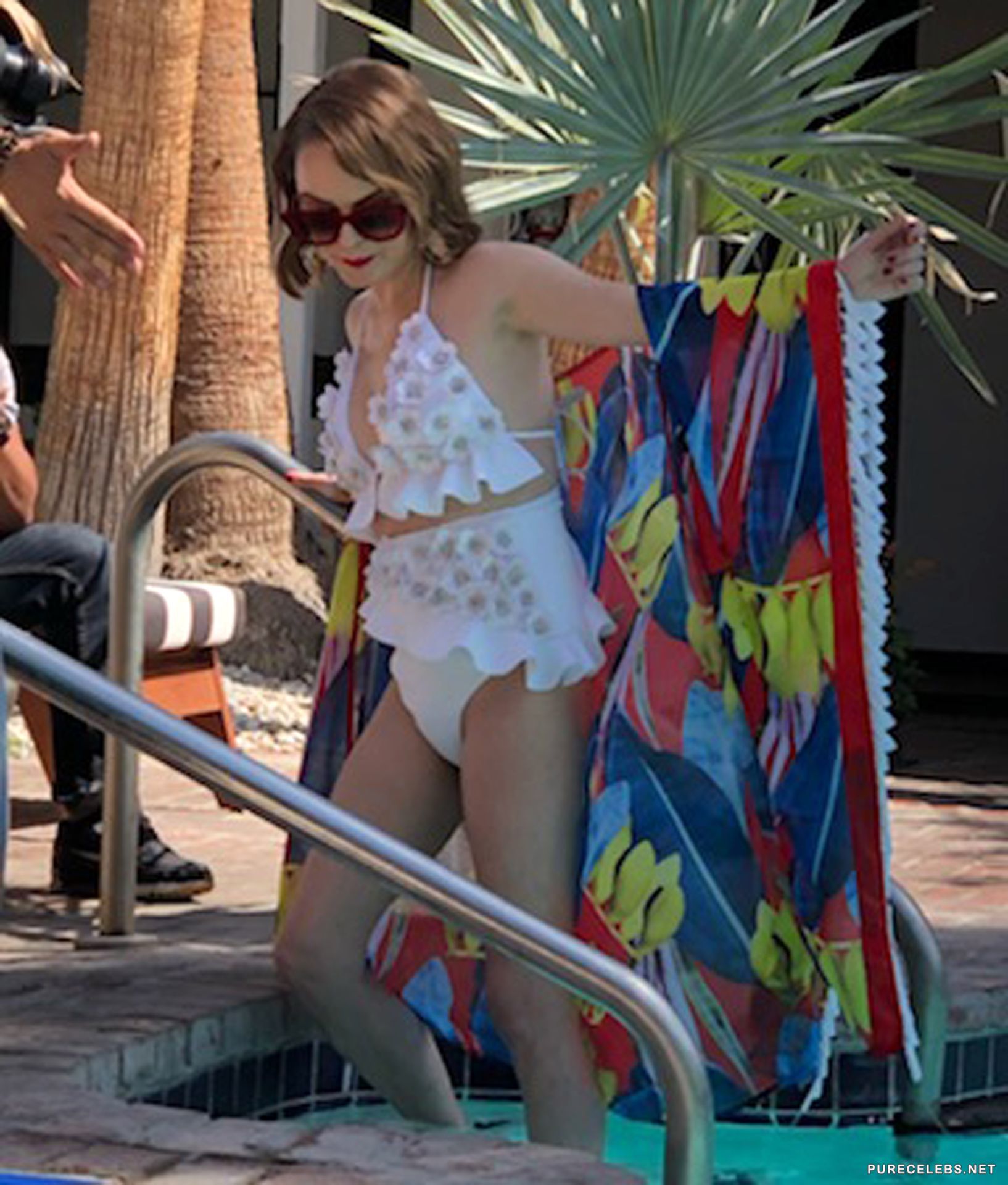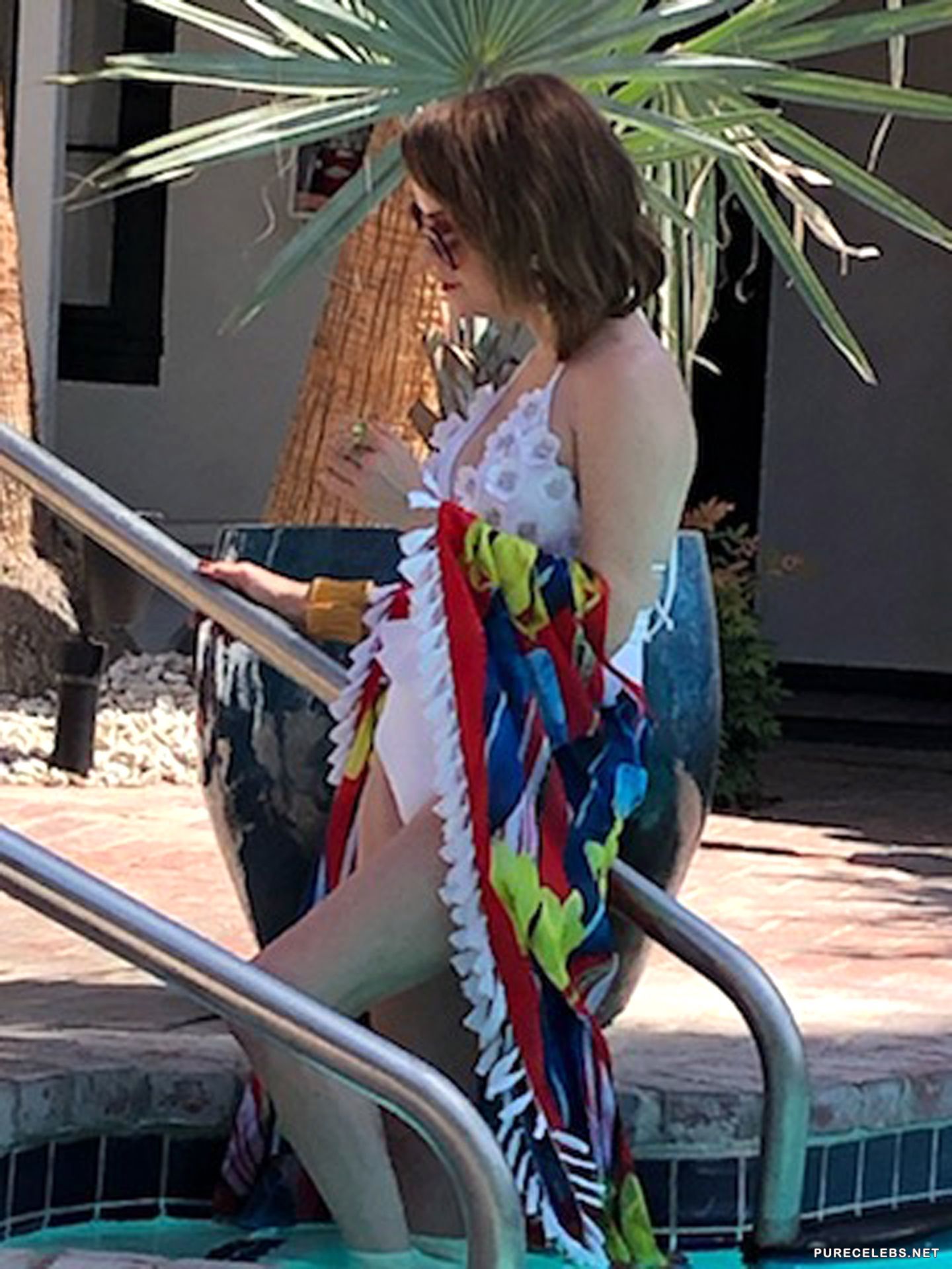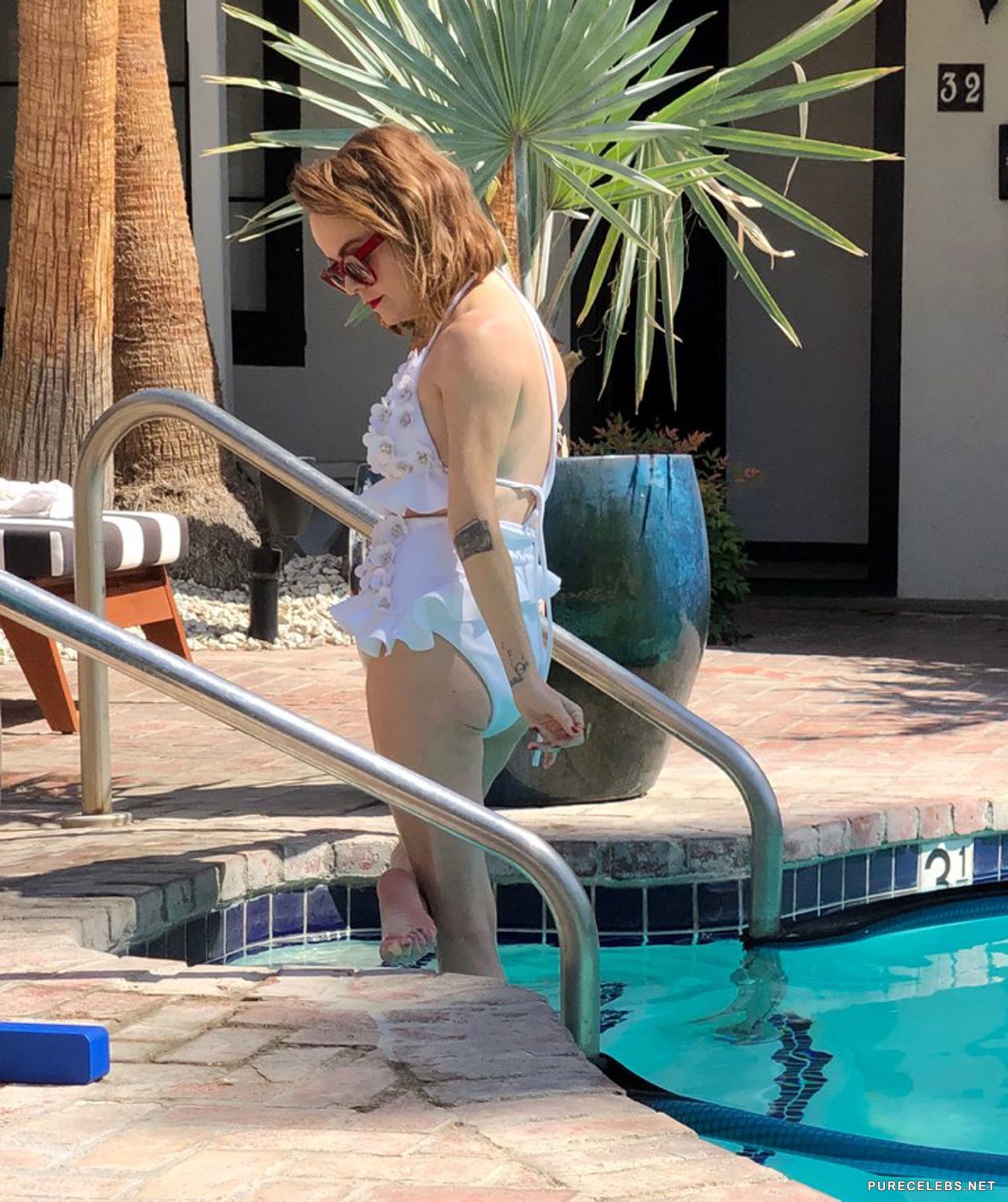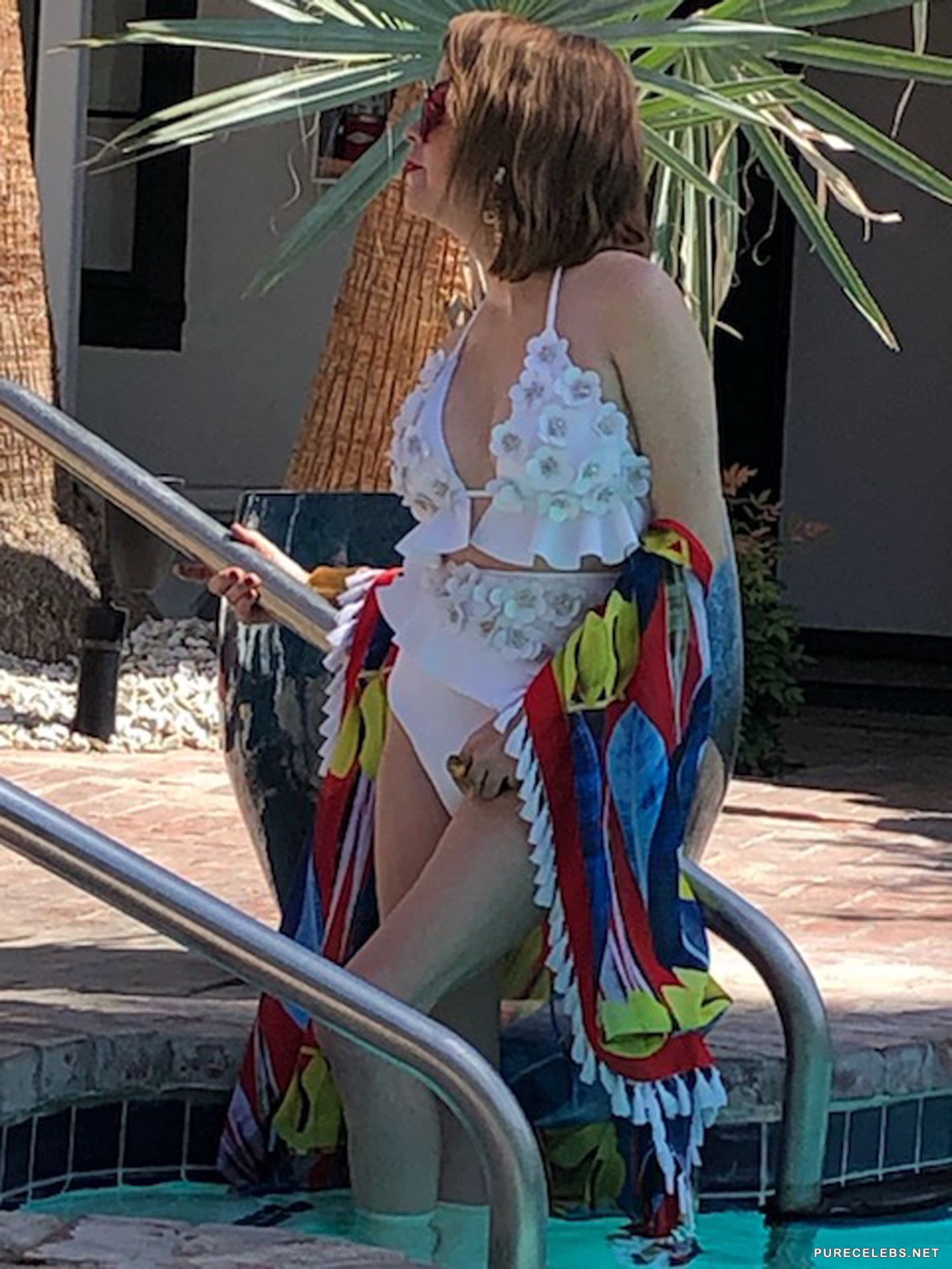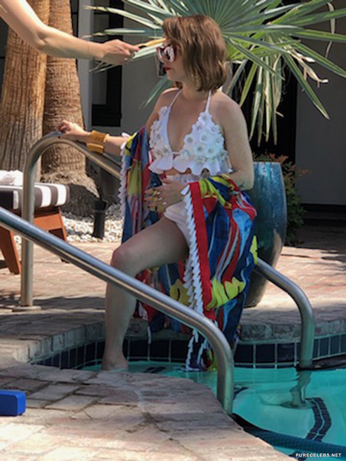Taryn Manning, an American actress and singer, was photographed by the paparazzi during her resting in the pool. The girl was wearing a white bikini with ruffles that beautifully emphasized her tanned body, and she also complemented her look with brown sunglasses. Her juicy ass dressed in white panties looked just breathtaking, and ruffles on her bra made her boobs even bigger and more beautiful.
