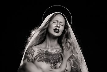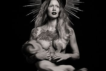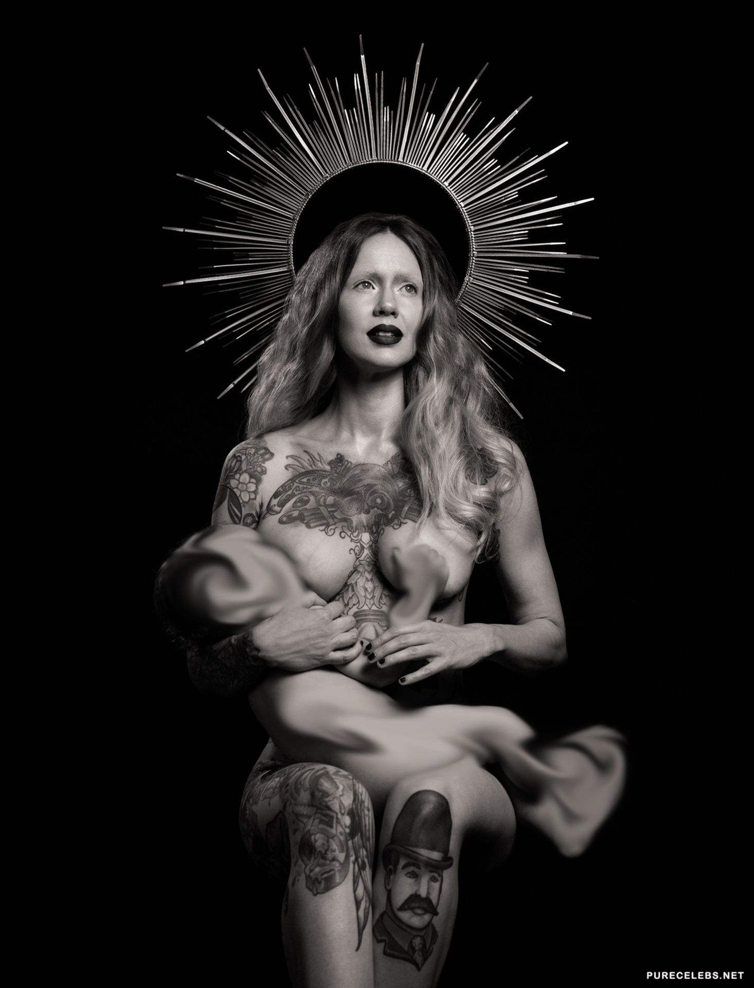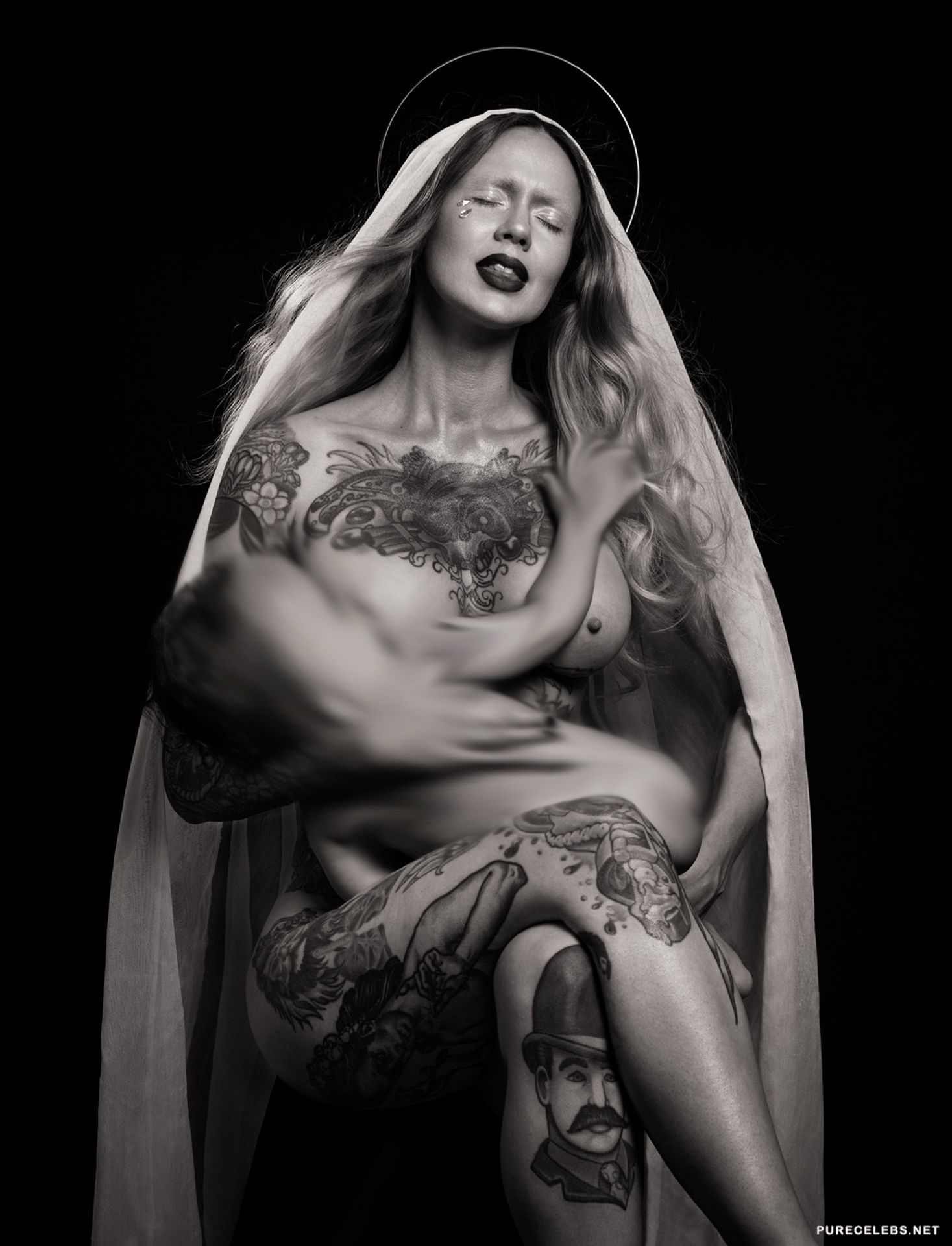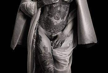 Leah Jung has loads of tattoos on her body and she has no problems showing them off. To top off those sexy tattoos, she has a large pair of tits and she is happy to share them as well. In this series of pics she is fully nude from the front and she is displaying her nice tight pussy that needs some of your love.