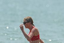 Little blonde Taylor Swift has grown into a real hottie, and these candid photos from the beach prove it. In this celebrity set of pictures, you can see the famous American singer having caress fun on the beach while getting followed by paparazzi. She runs around in the shallows while her firm young tits bounce, and gets her tight ass photographed from behind, all without a care in the world.