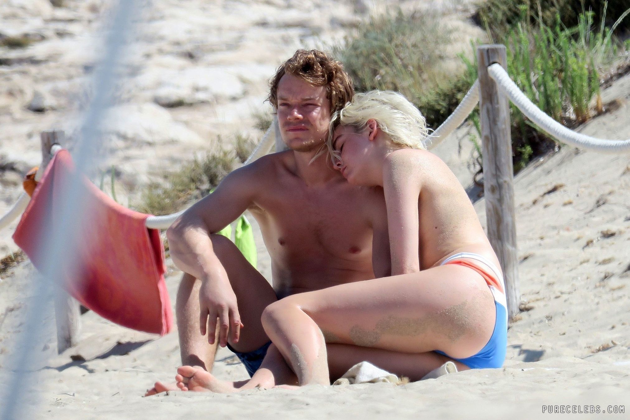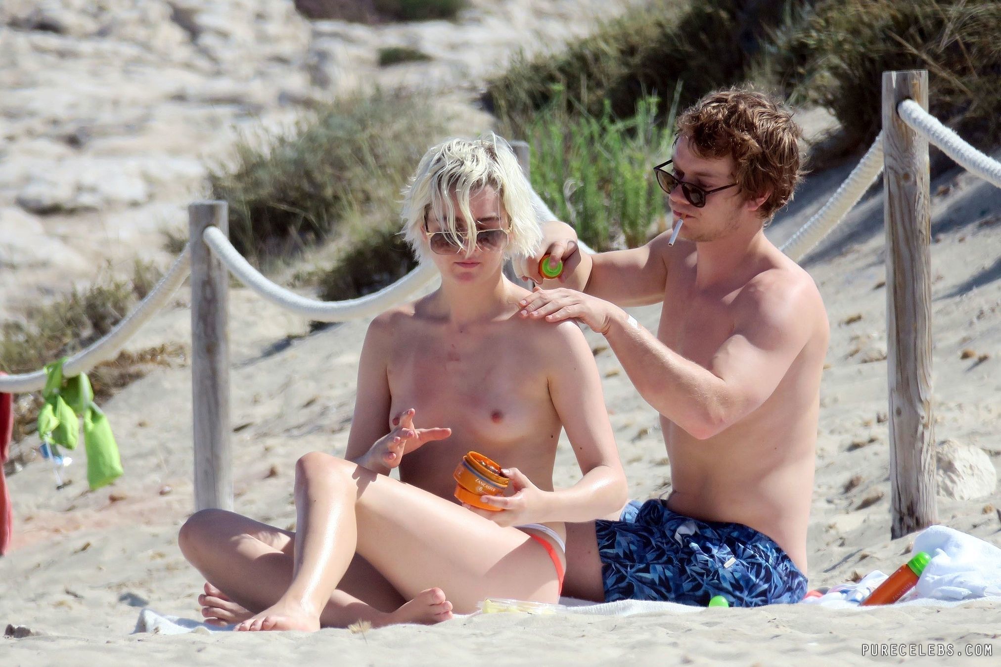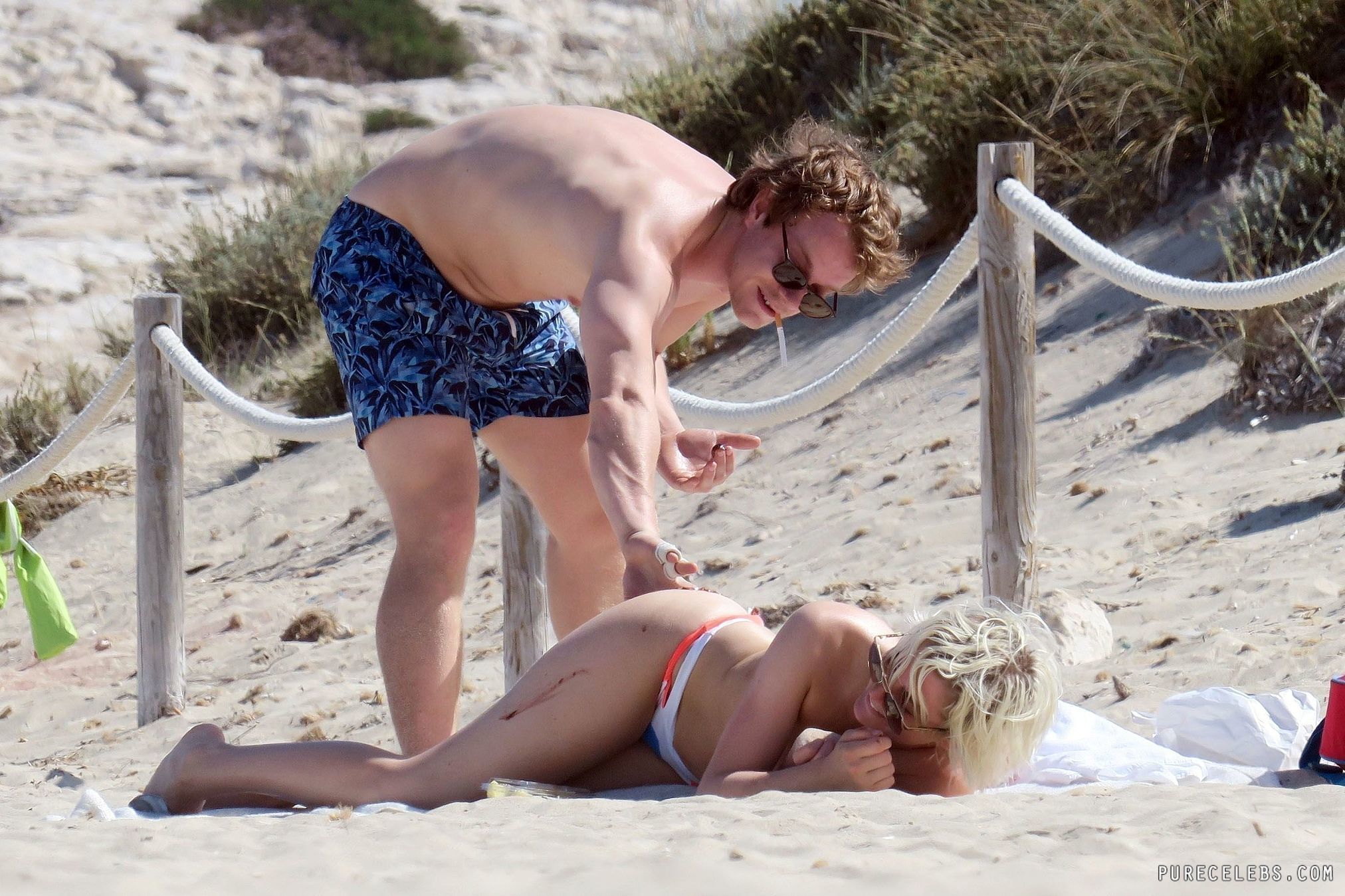 Teliz Alley, the girlfriend of the “Game of Thrones” star Alfie Allen, showed off her nude boobies during a beach vacation. Paparazzi photographed this blonde in small multi-colored panties, in which her ass looked very sexy. Therefore, it is not surprising that her boyfriend could not resist and groped her sweet butt. The girl sunbathed topless. Therefore, the paparazzi managed to take many pictures of Teliz Alley nude tits with brown nipples.