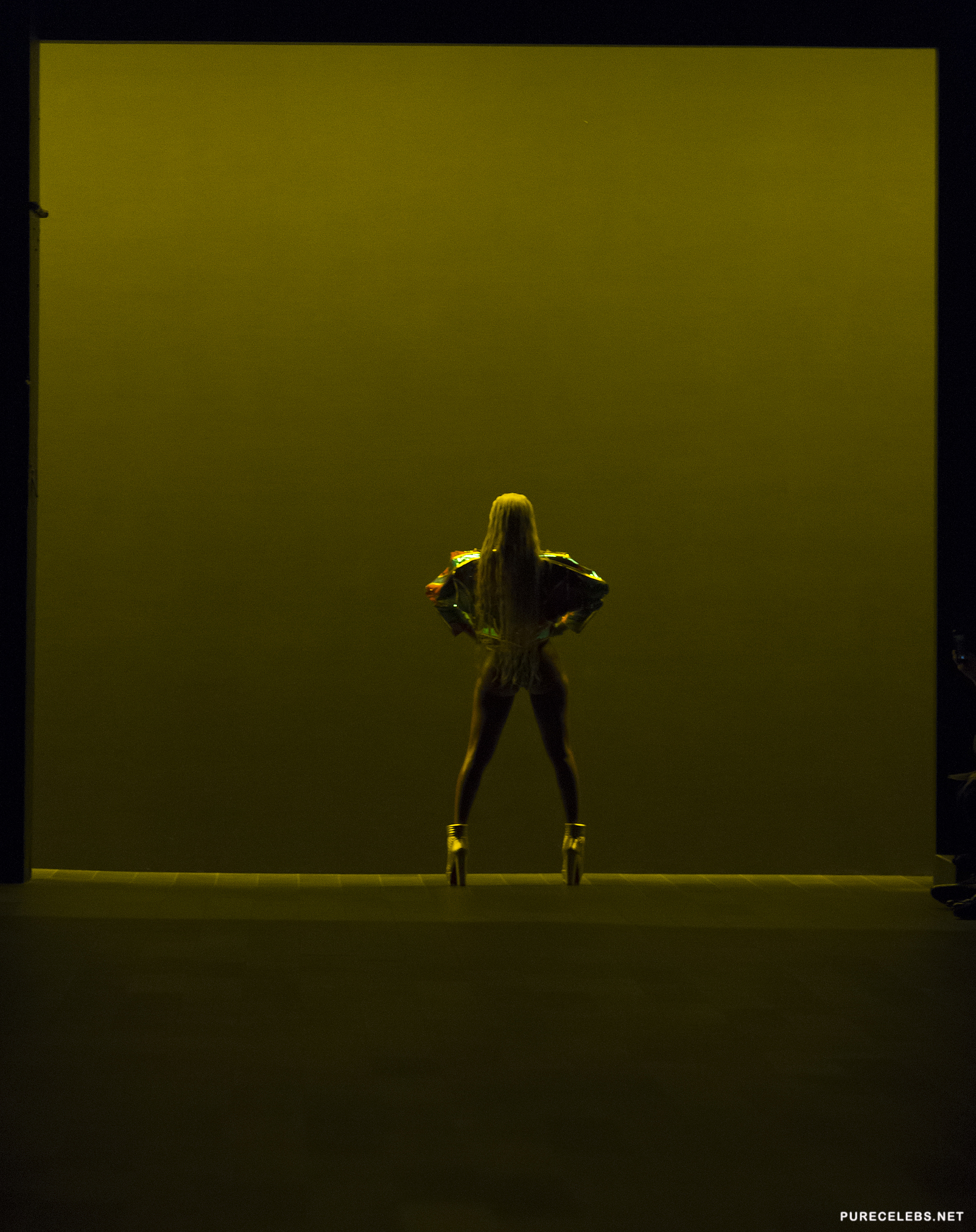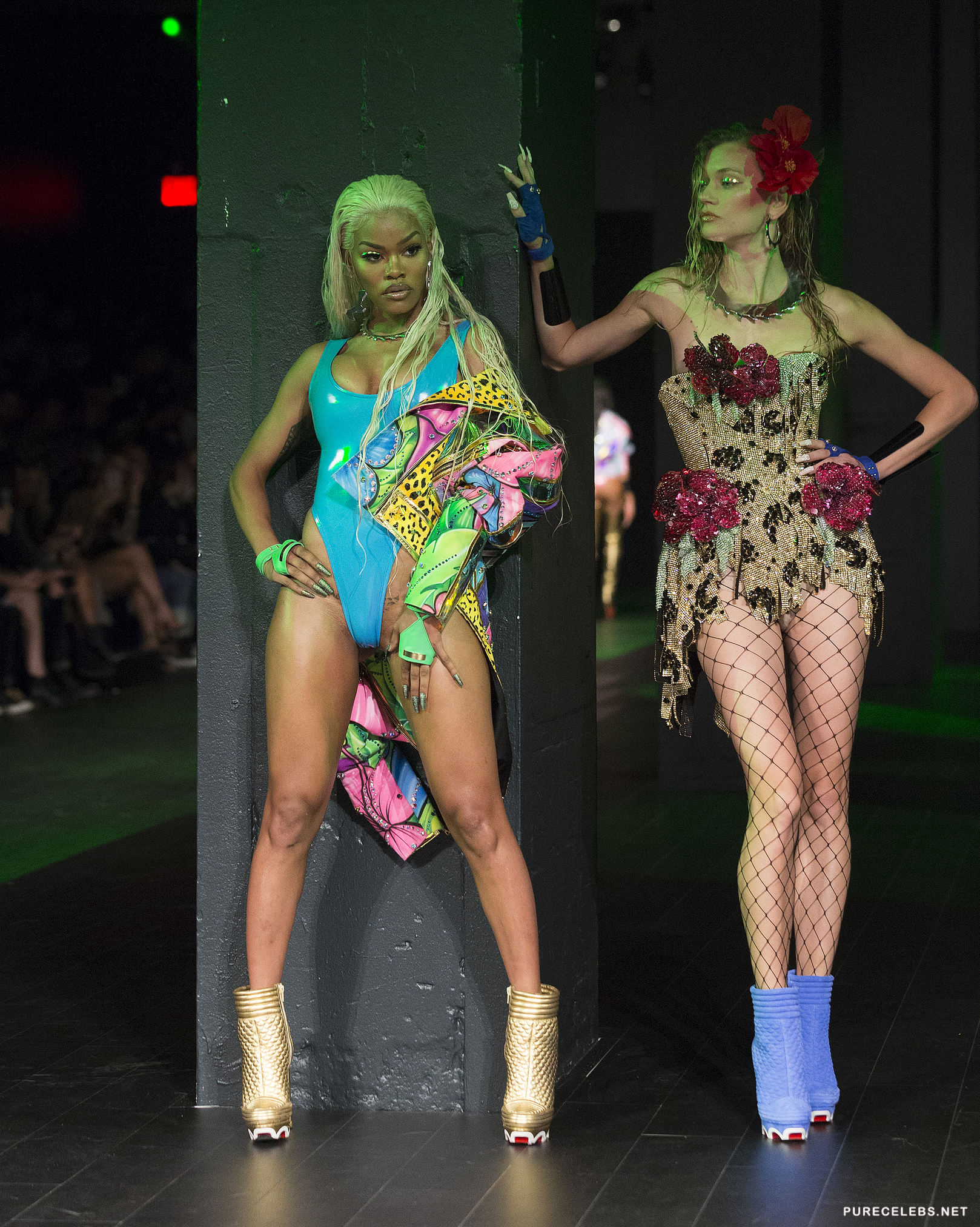 Teyana Taylor may be best known for her singing career, but we are pleased to report that she graced the catwalk of a fashion show at this year’s New York Fashion Week wearing a tiny latex blue swimsuit. The tight garment was barely able to cover her pussy and revealed her sexy hip and stomach tattoos. She paraded down the catwalk flaunting her big ass and gladly posed for reporters.