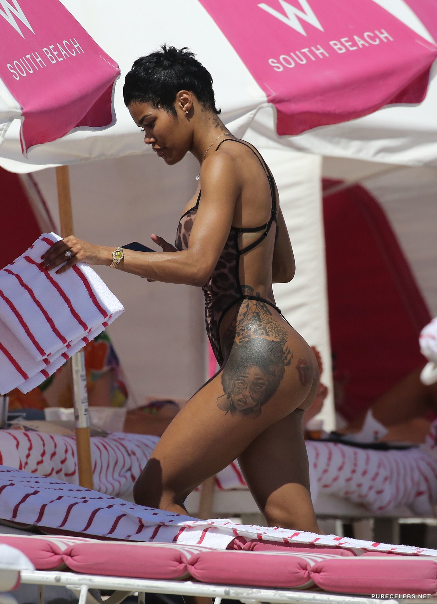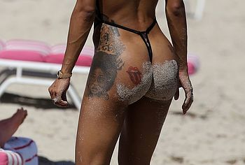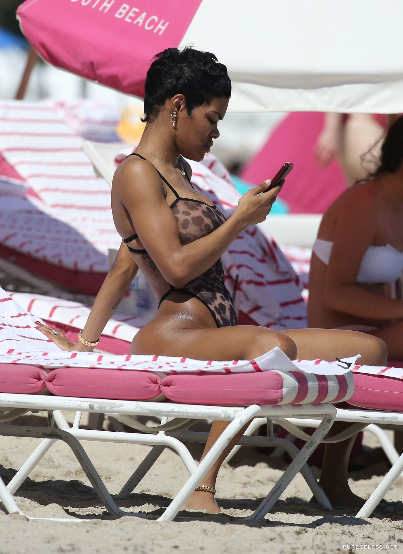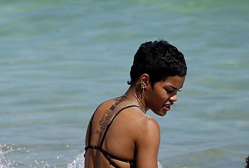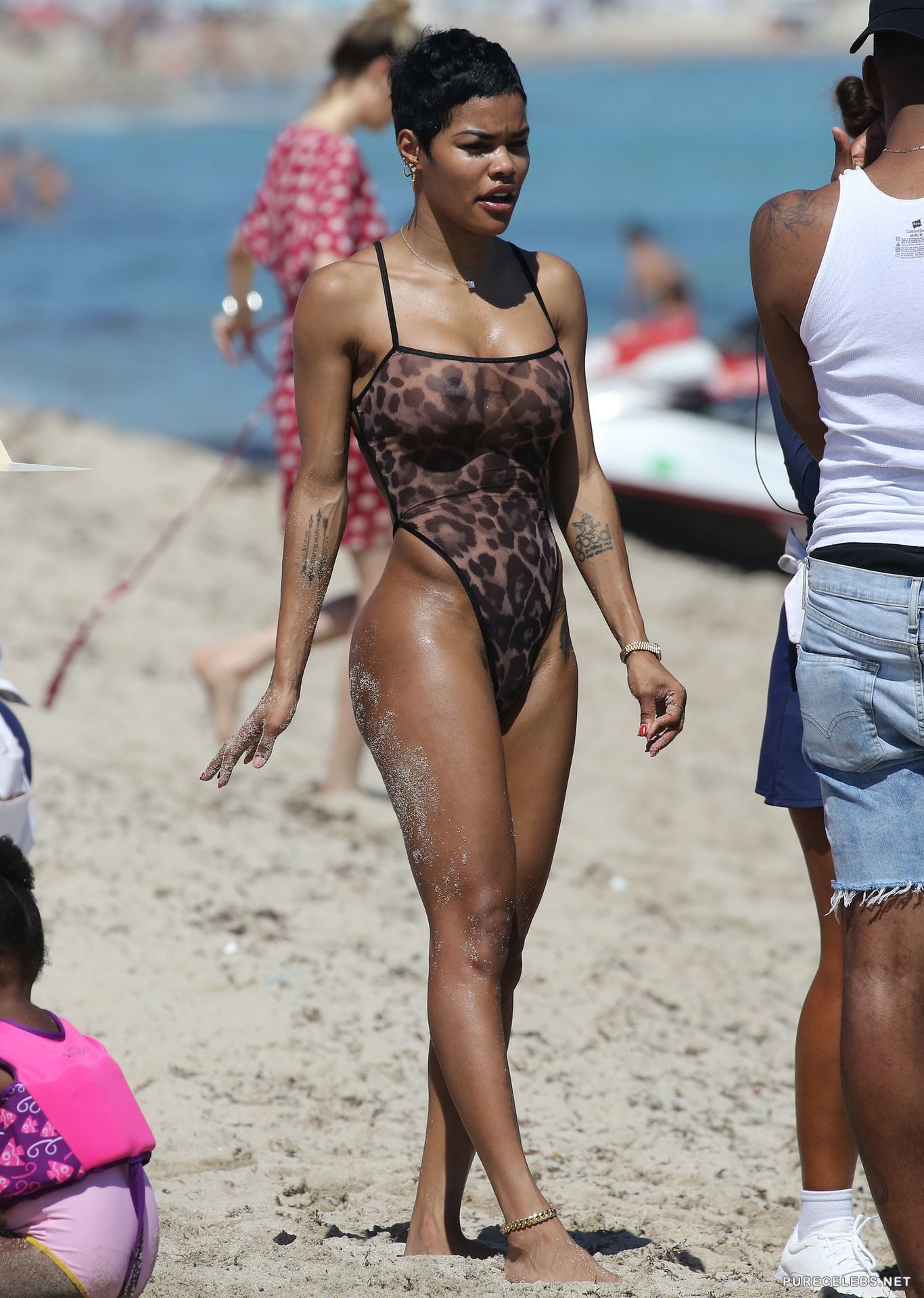 Teyana Taylor is on a beach and since it is not a nude beach, she puts on a suit that technically covers her body, but it really does not. We can see her dark nipples through it and the thong that she has on does not cover her amazing bubble butt as she walks around on the sand on the beach.