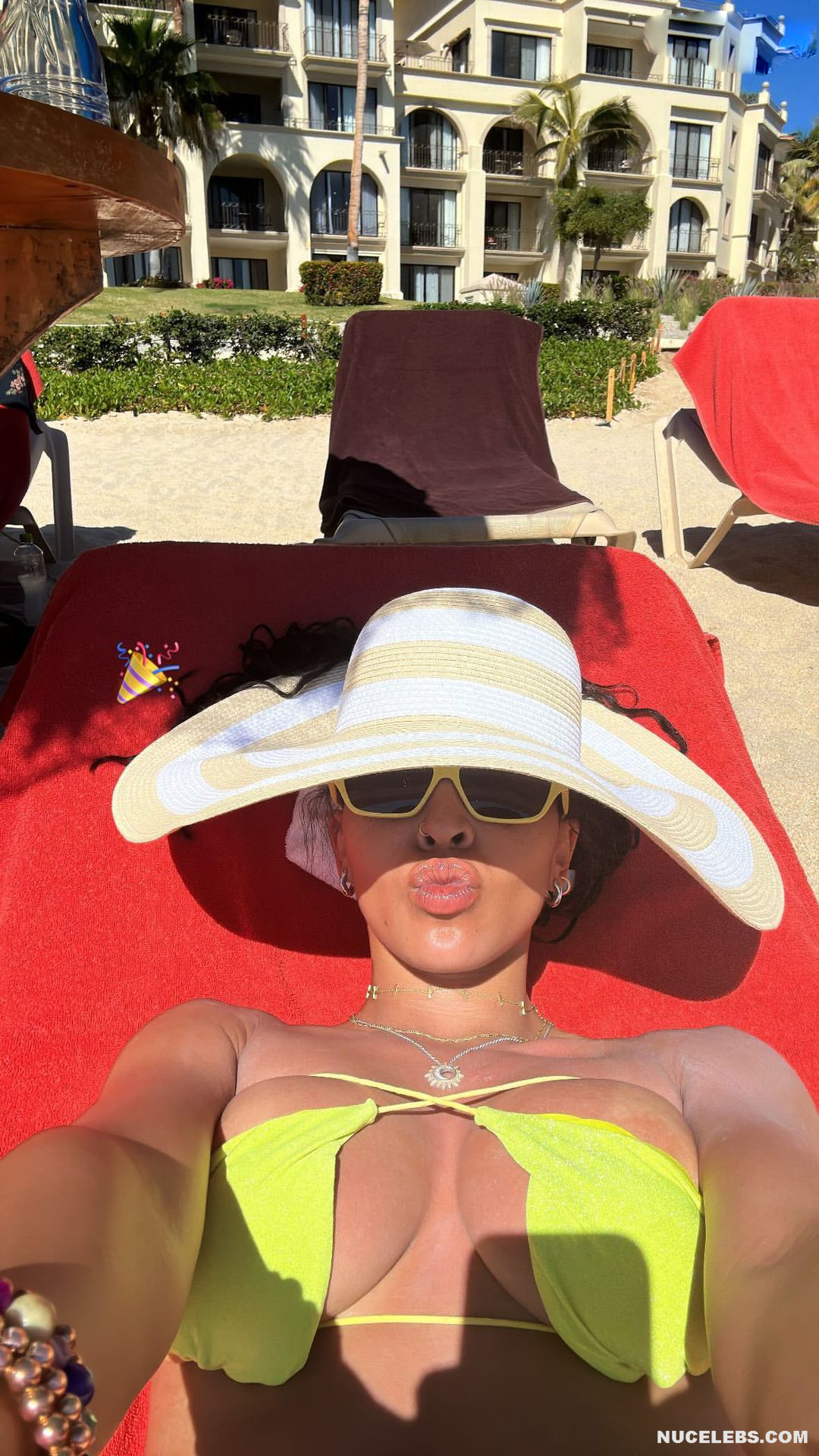 Tinashe loves to tease the public by practically exposing her naked body. So, this celebrity looked stunning in an unbuttoned jacket on a naked body, from which the sides of her sweet boobs peeked out. Also, this 30-year-old singer, dressed in a petite light green bikini, had fun on the beach. And at some point, Tinashe threw off her bra and sunbathed topless! In the photo you can see how she covers her boobies with her palms.