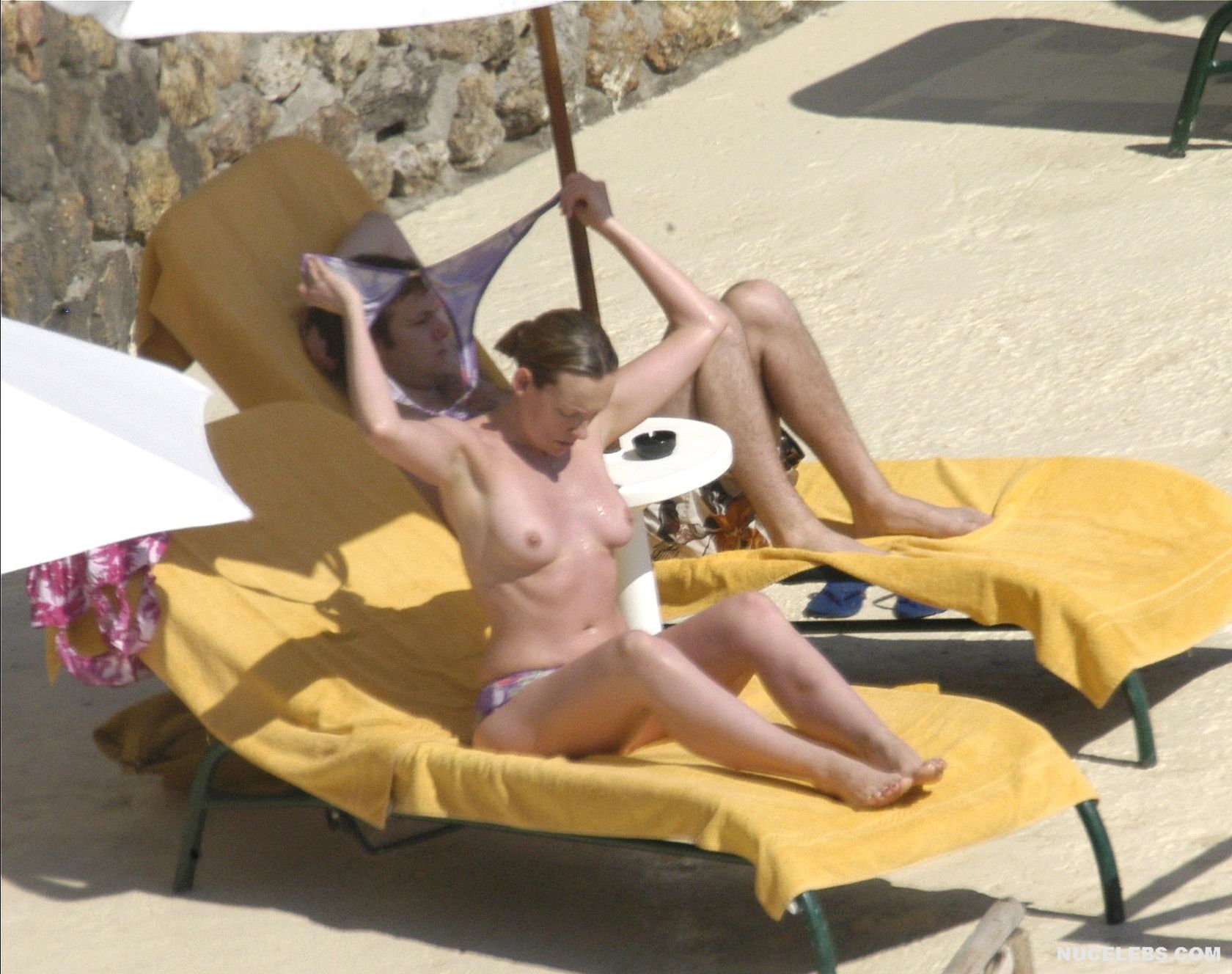 It turns out that Toni Collette loves topless sunbathing. This is a great chance for the paparazzi to get a lot of nude boob pics of Toni Collette. Bathed this Australian actress in a small purple bikini, but sunbathing remained only in panties. Oh, you will be definitely drool looking at Toni Collette nude titties with brown nipples when she was relaxing on the beach in the company of her man.