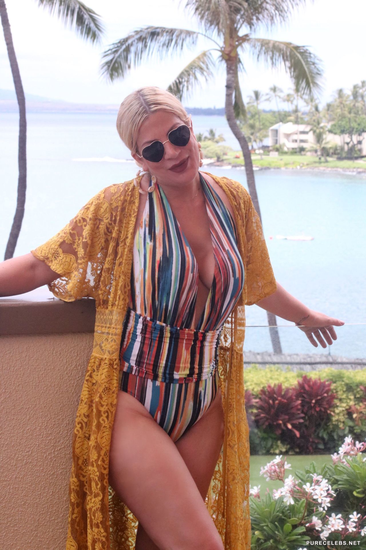 American actress Tori Spelling was caught by the paparazzi during her beach vacation. It is worth noting that this blonde looked very hot in a burgundy and black bikini. Tori Spelling nude big tits just wanted to jump out of the low neckline of her bra and it was an amazing sight. Also her butt looked very sexy in black panties, which was visible through a black pareo.