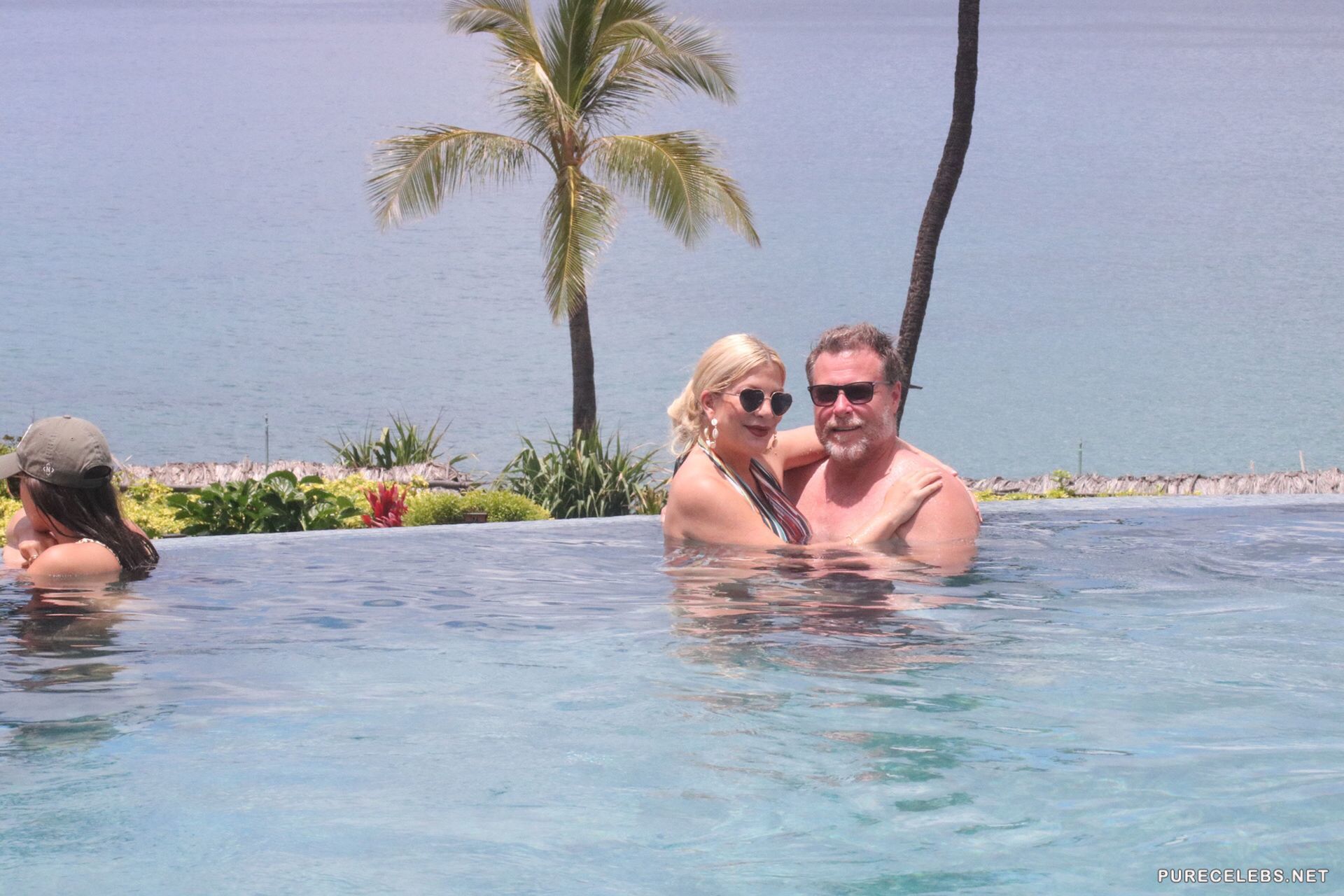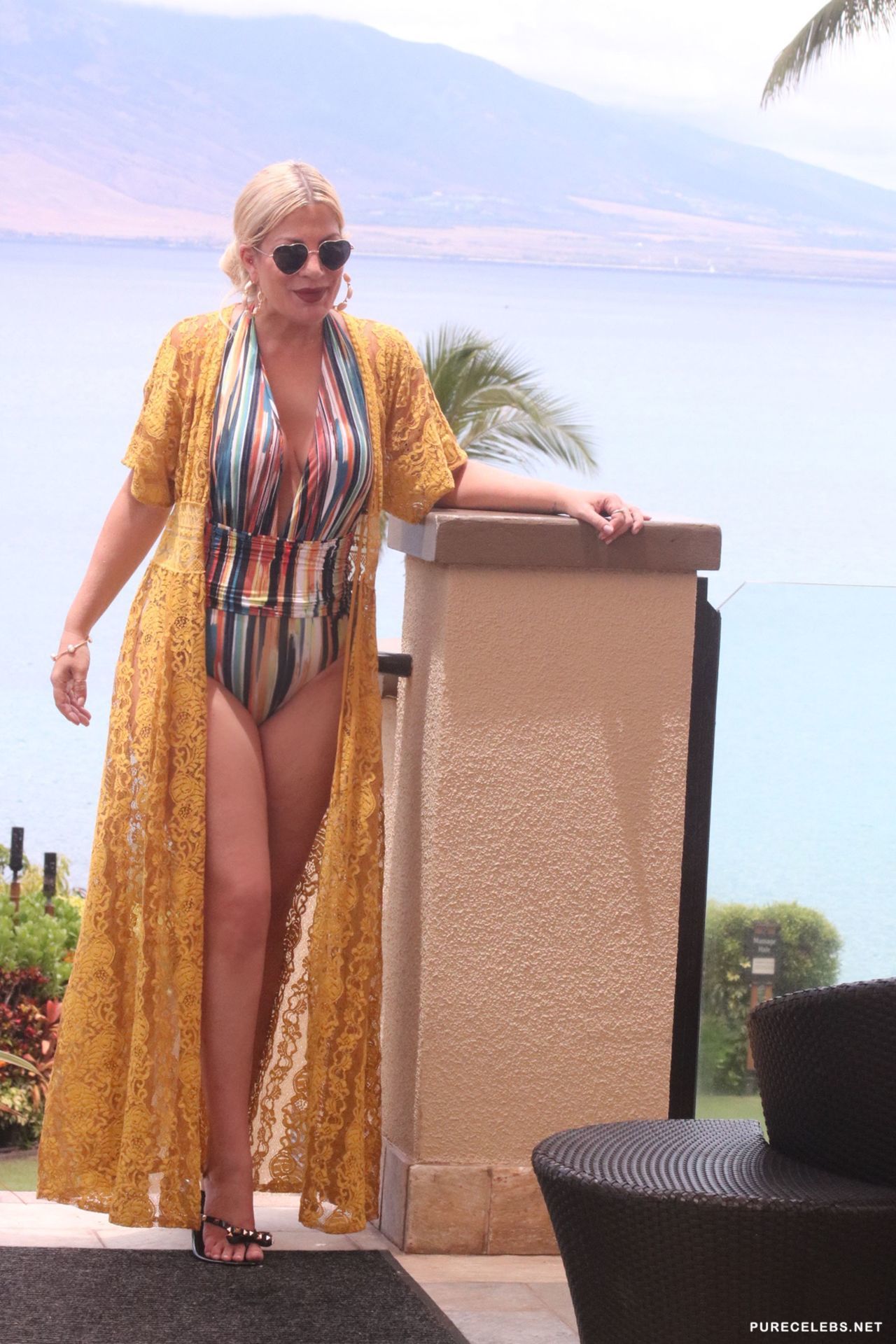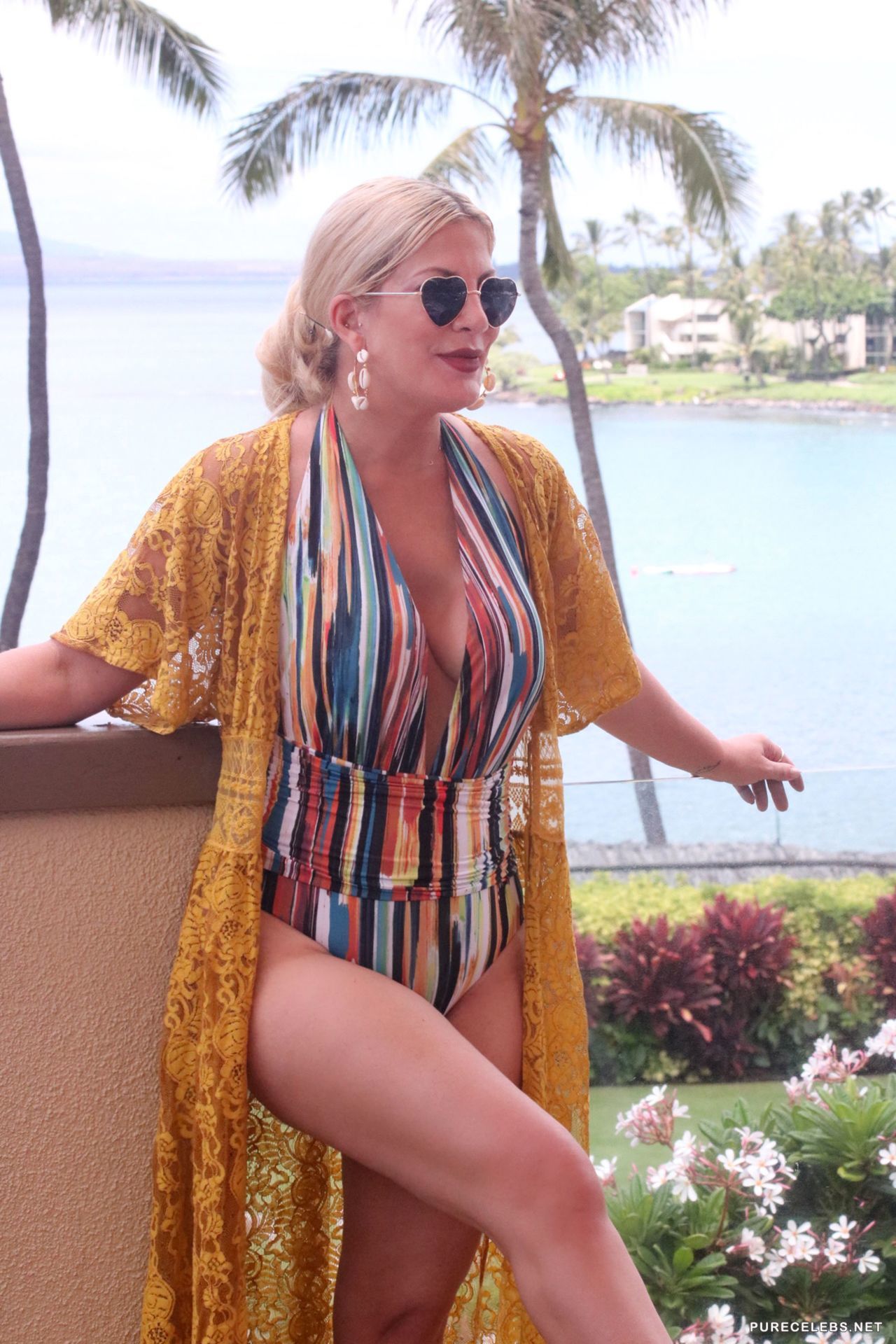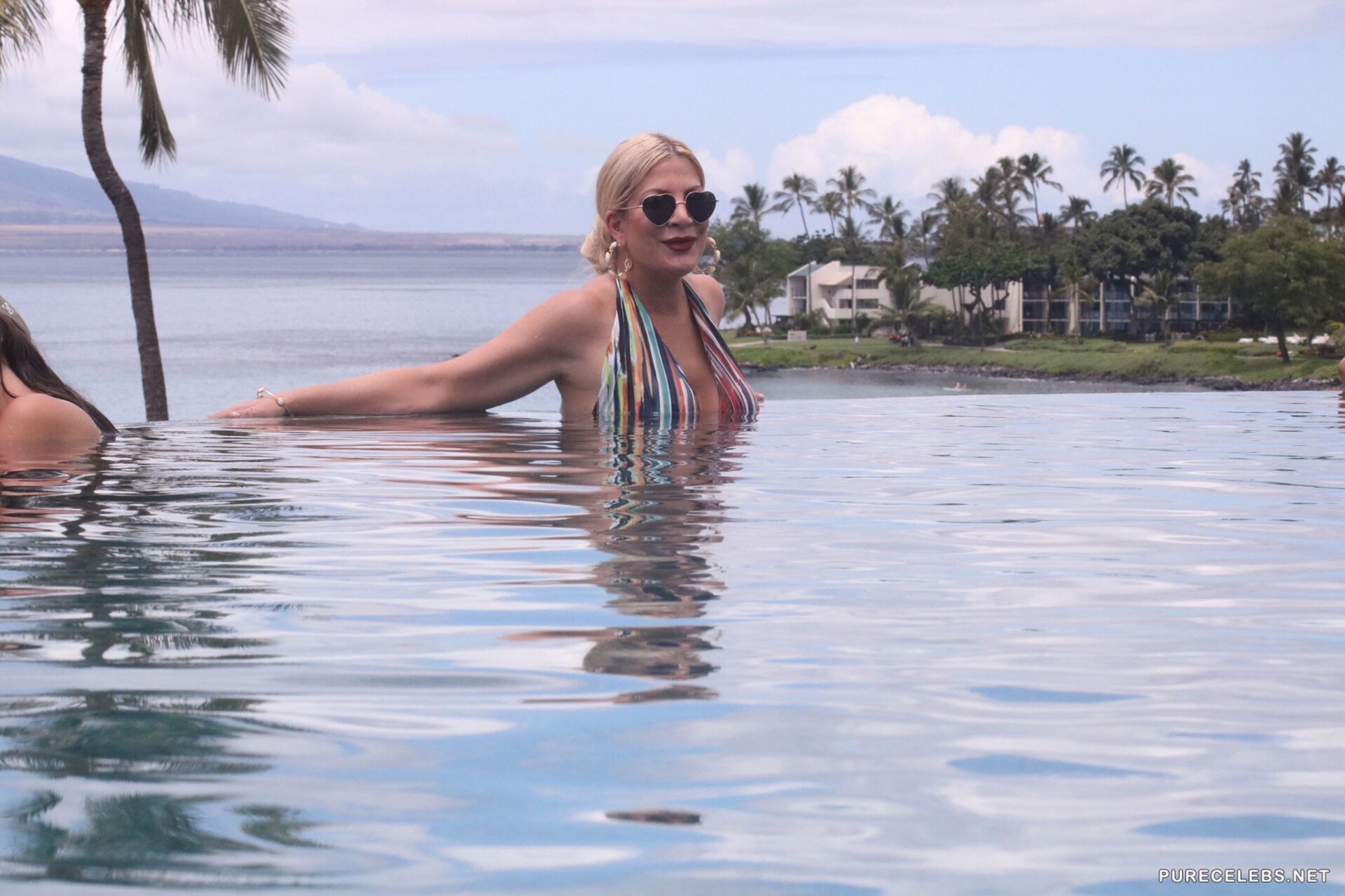 American actress Tori Spelling had a great time swimming in the pool, where she was caught by the ubiquitous paparazzi. The charming blonde in heart-shaped glasses and a striped swimsuit looked incredibly attractive. A swimsuit perfectly emphasized her lush hips, and it was simply impossible to look away from her wonderful cleavage. This celebrity certainly knows how to look very hot and seductive!