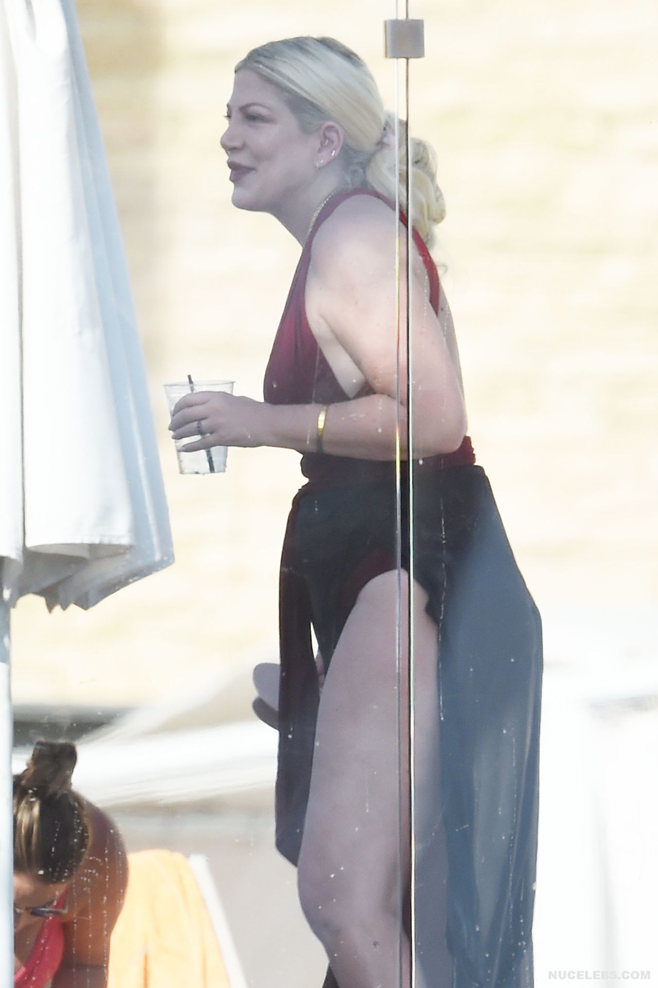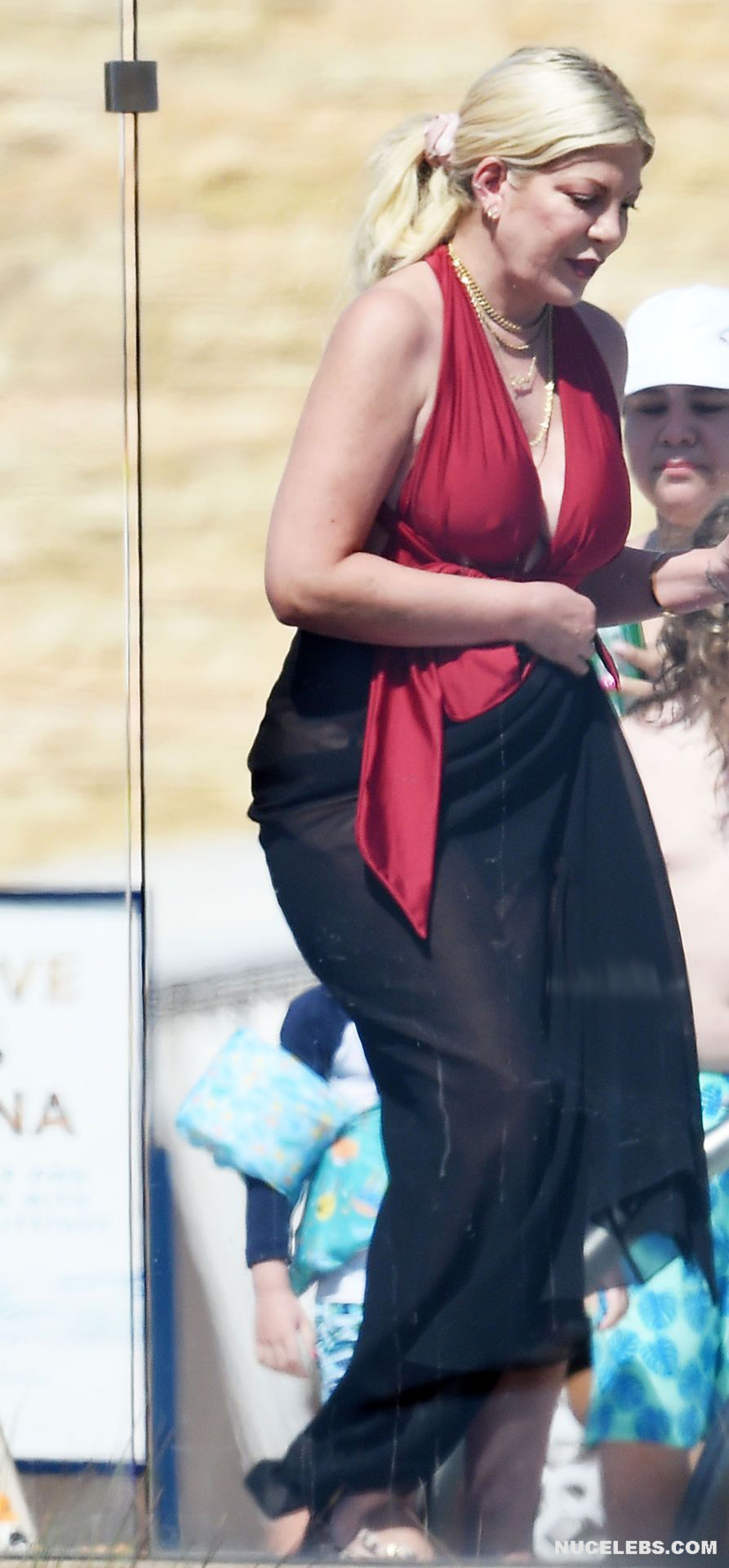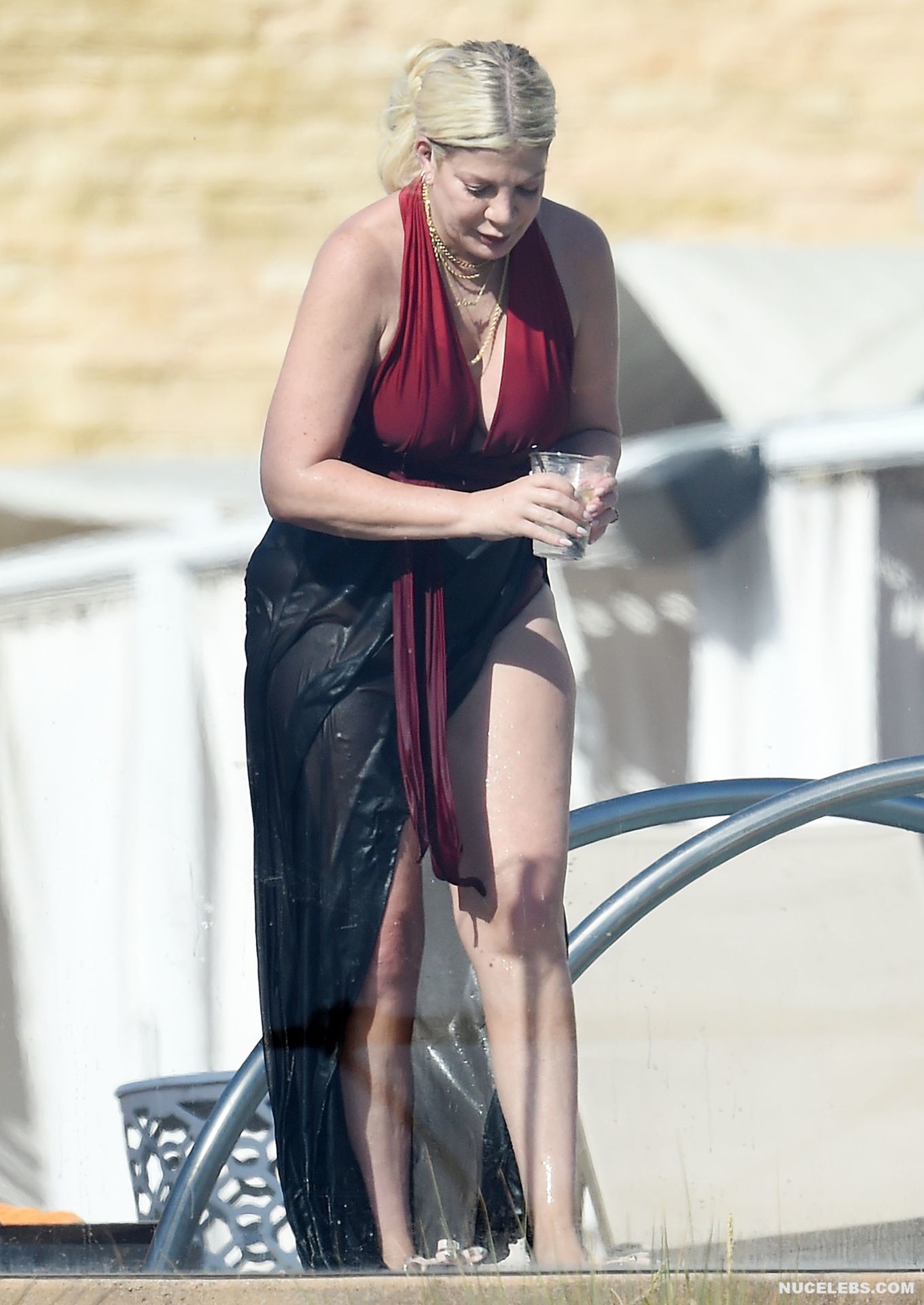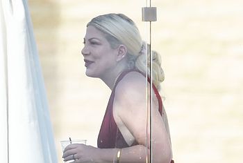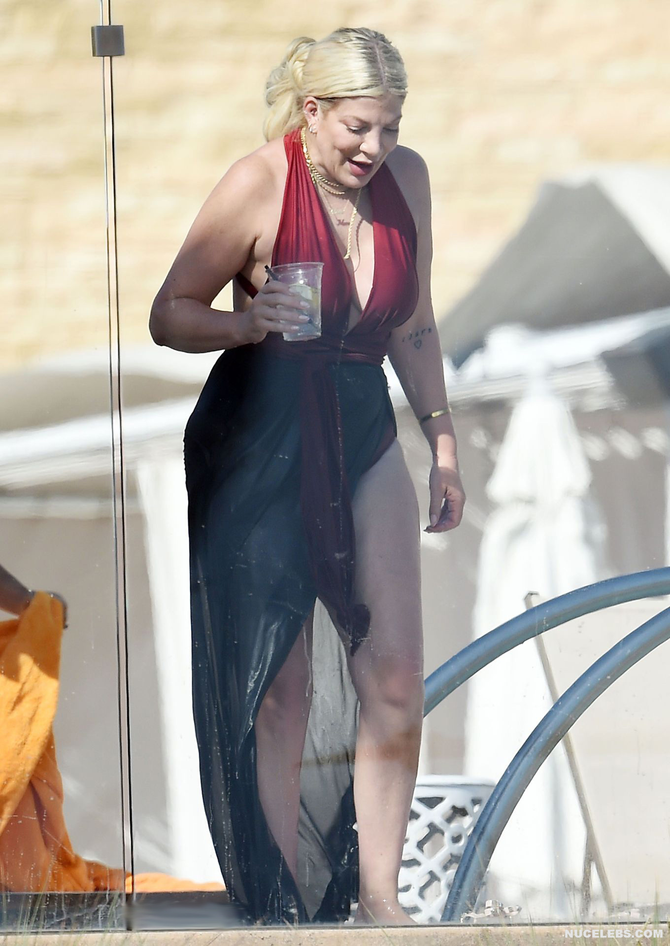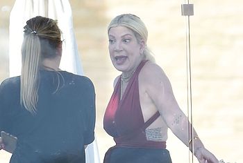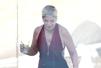 American actress Tori Spelling was caught by the paparazzi during her beach vacation. It is worth noting that this blonde looked very hot in a burgundy and black bikini. Tori Spelling nude big tits just wanted to jump out of the low neckline of her bra and it was an amazing sight. Also her butt looked very sexy in black panties, which was visible through a black pareo.