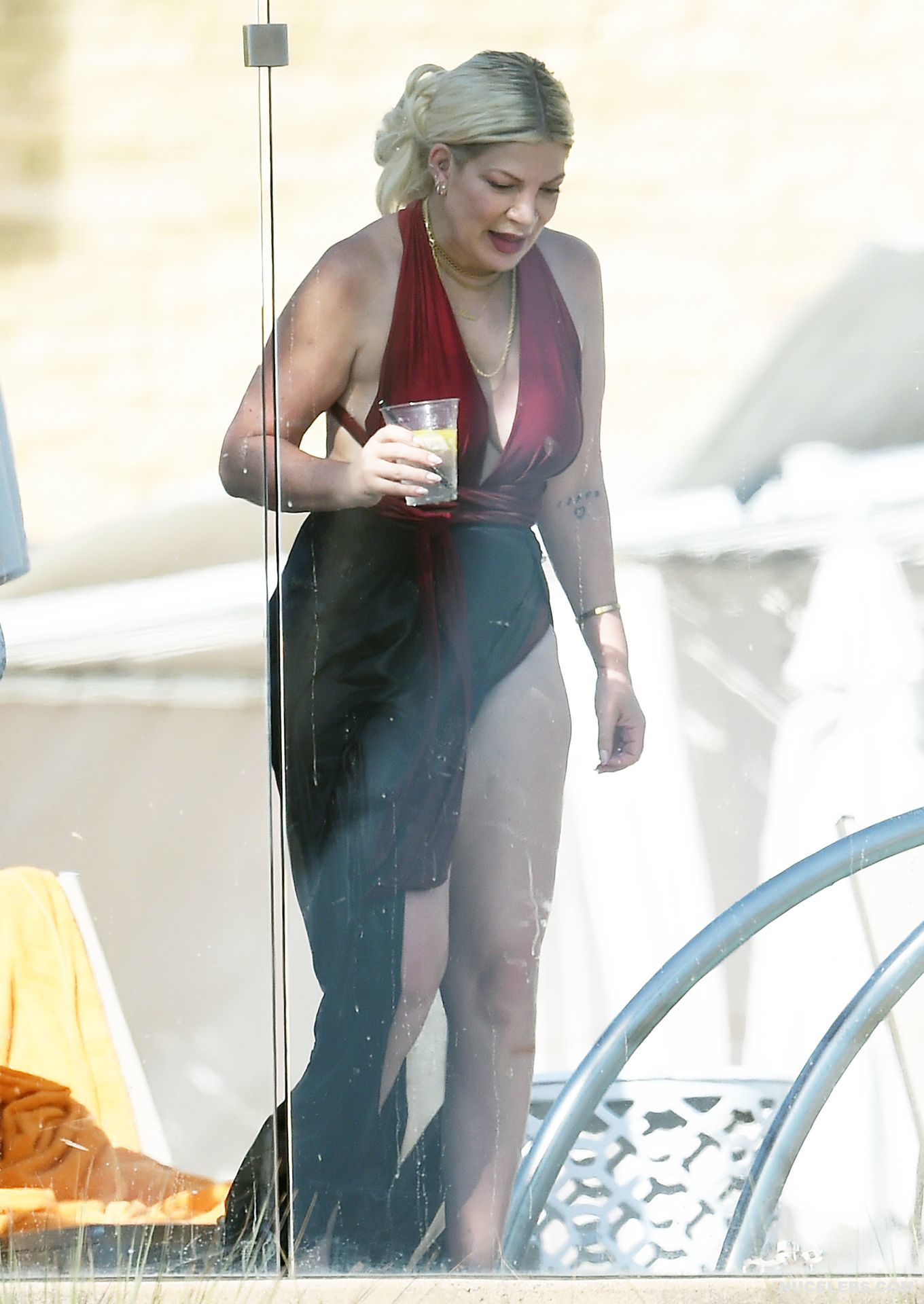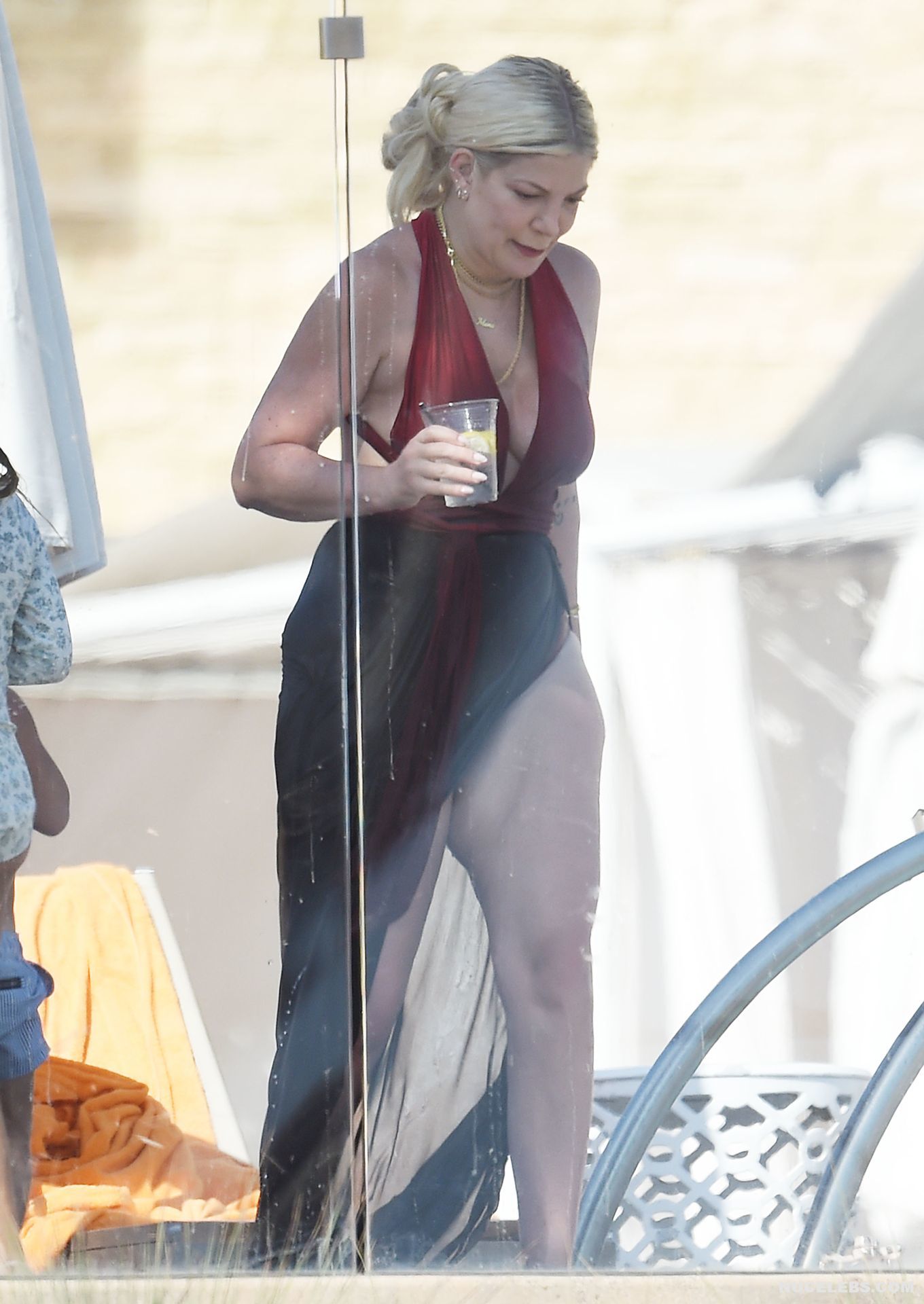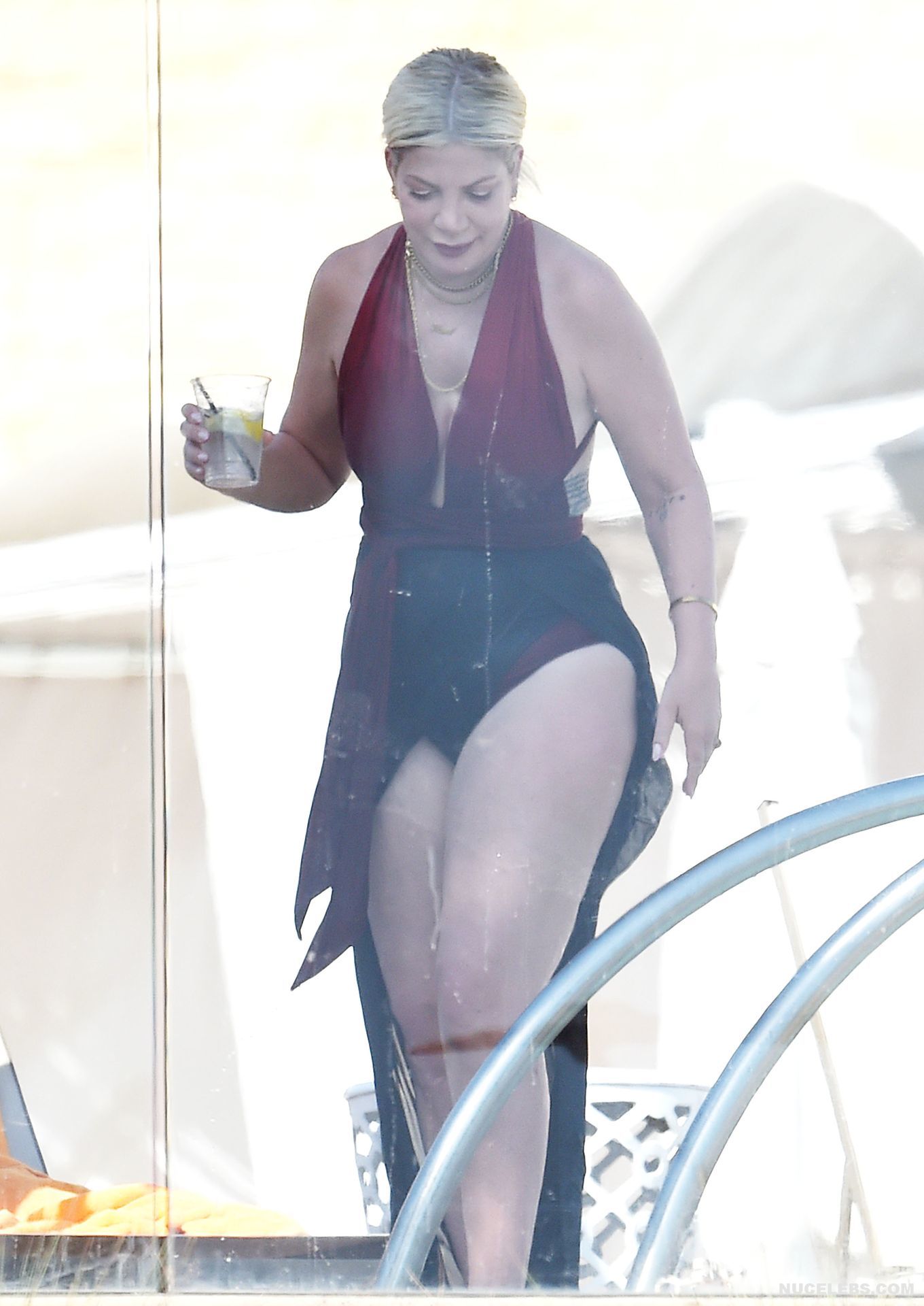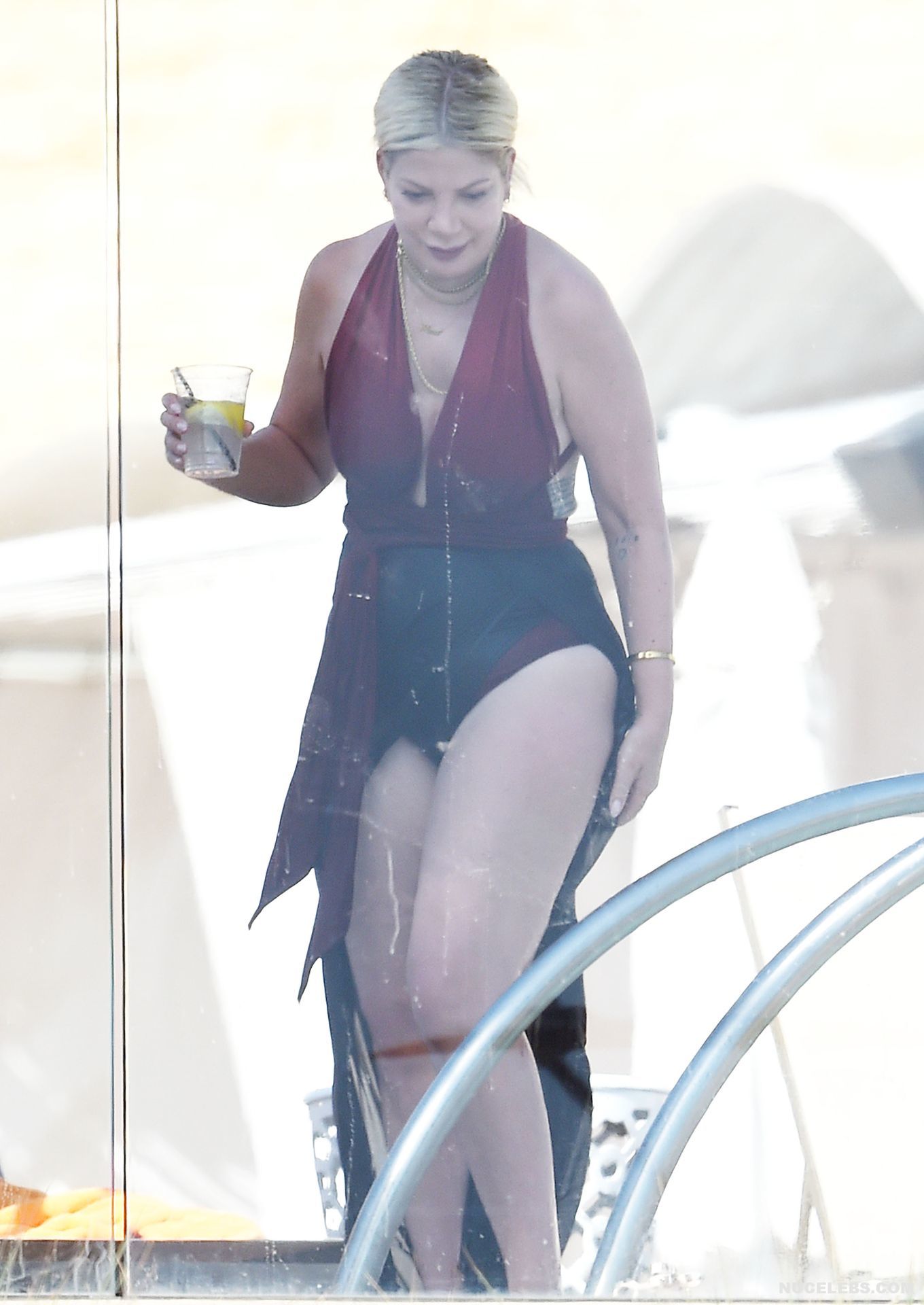 American actress Tori Spelling was caught by the paparazzi during her beach vacation. It is worth noting that this blonde looked very hot in a burgundy and black bikini. Tori Spelling nude big tits just wanted to jump out of the low neckline of her bra and it was an amazing sight. Also her butt looked very sexy in black panties, which was visible through a black pareo.