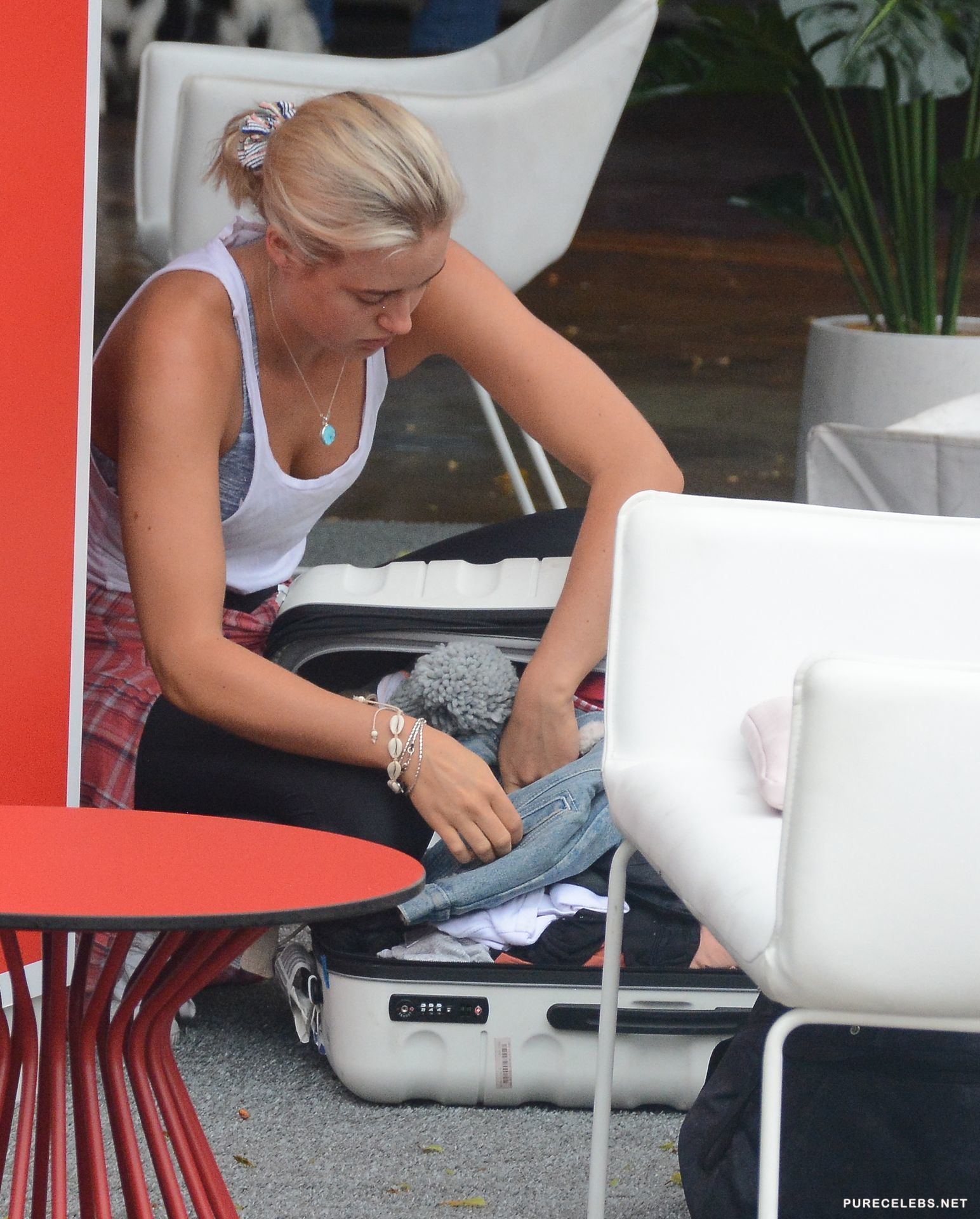 Olivia Phyland is a TV celebrity with blonde hair and pretty blue eyes and she keeps her body fit by working out. Today she does not look around to see if there are any paparazzi around and one dude manages to catch her as she is doing her stretches. He manages to snap photos of her cleavage as she is bending over.