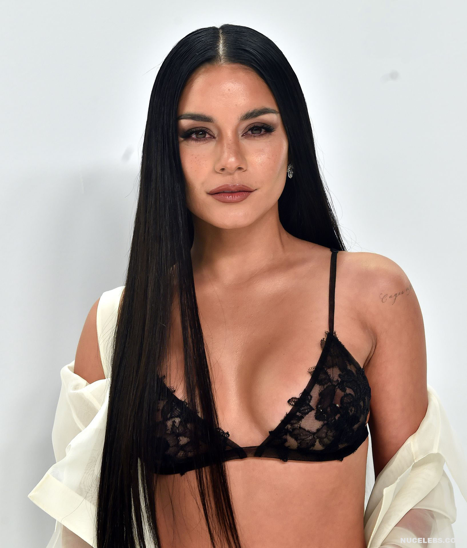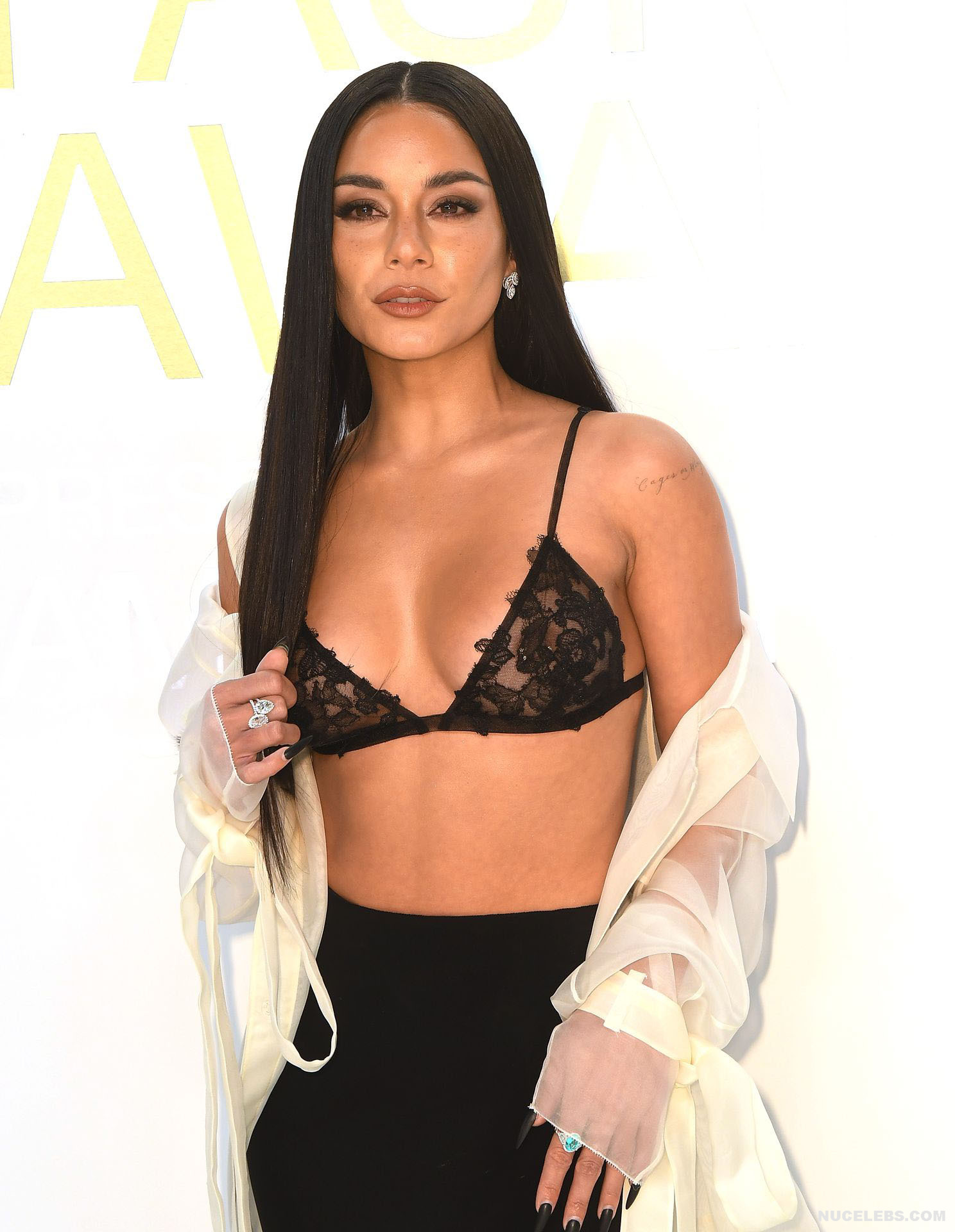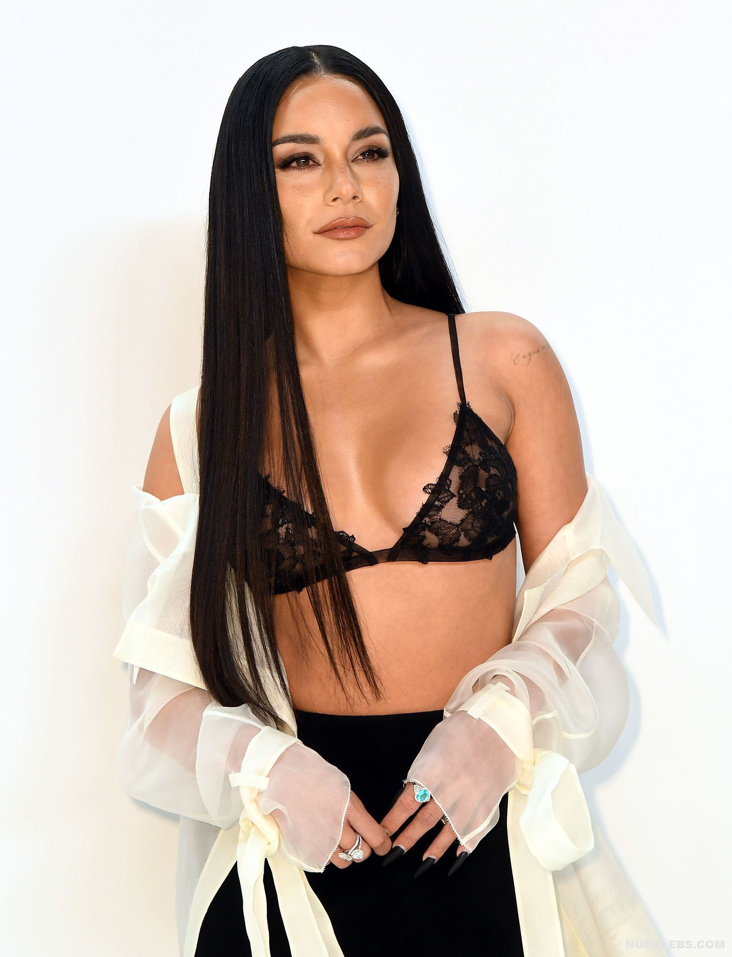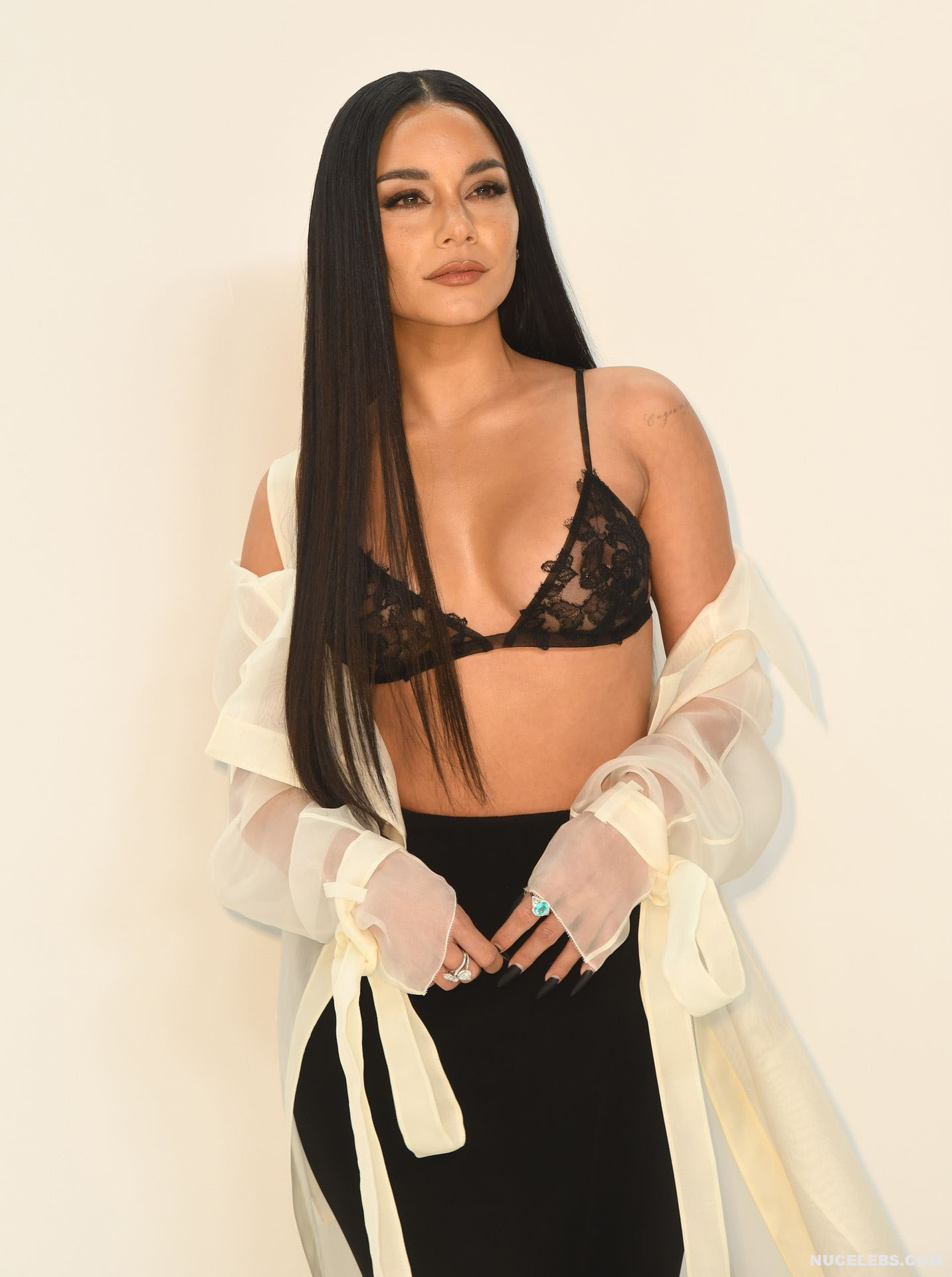 We can say that Vanessa Hudgens practically showed her nude titties in public at one of the events. The 33-year-old celebrity was wearing a long black skirt, as well as a white long transparent cape, which she did not button up. That is why her black lace bra was put on display. And since it had transparent inserts, Vanessa Hudgens’ nude tits with pierced nipples were even visible through!