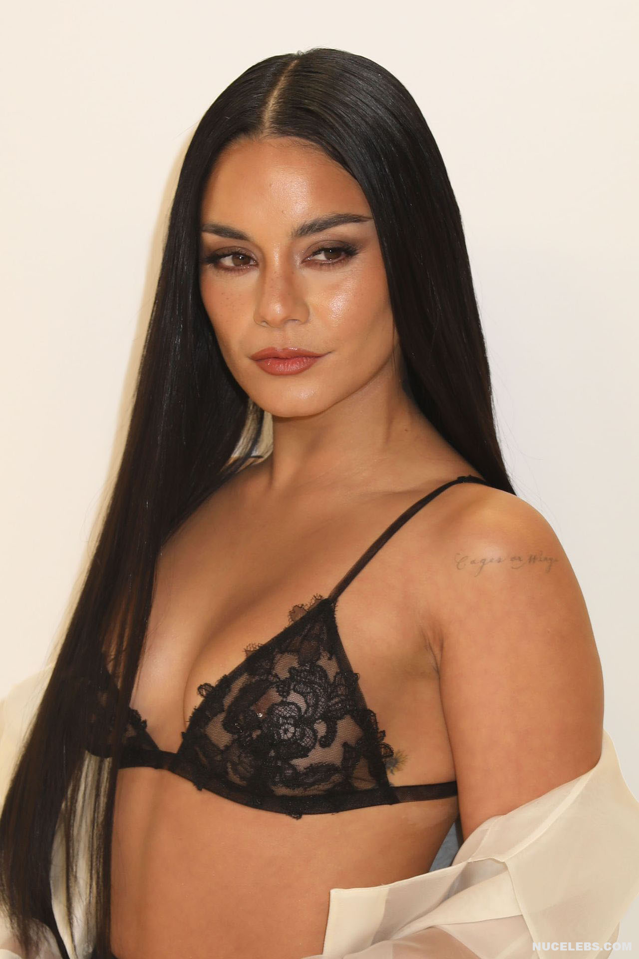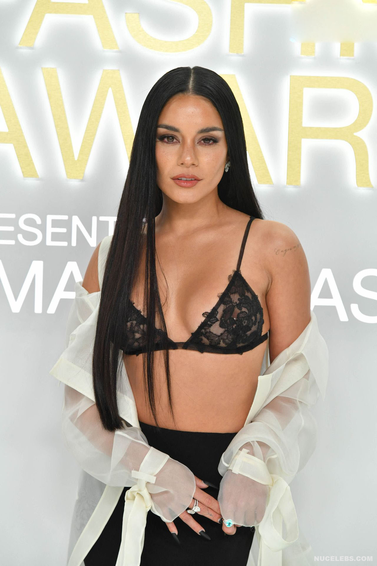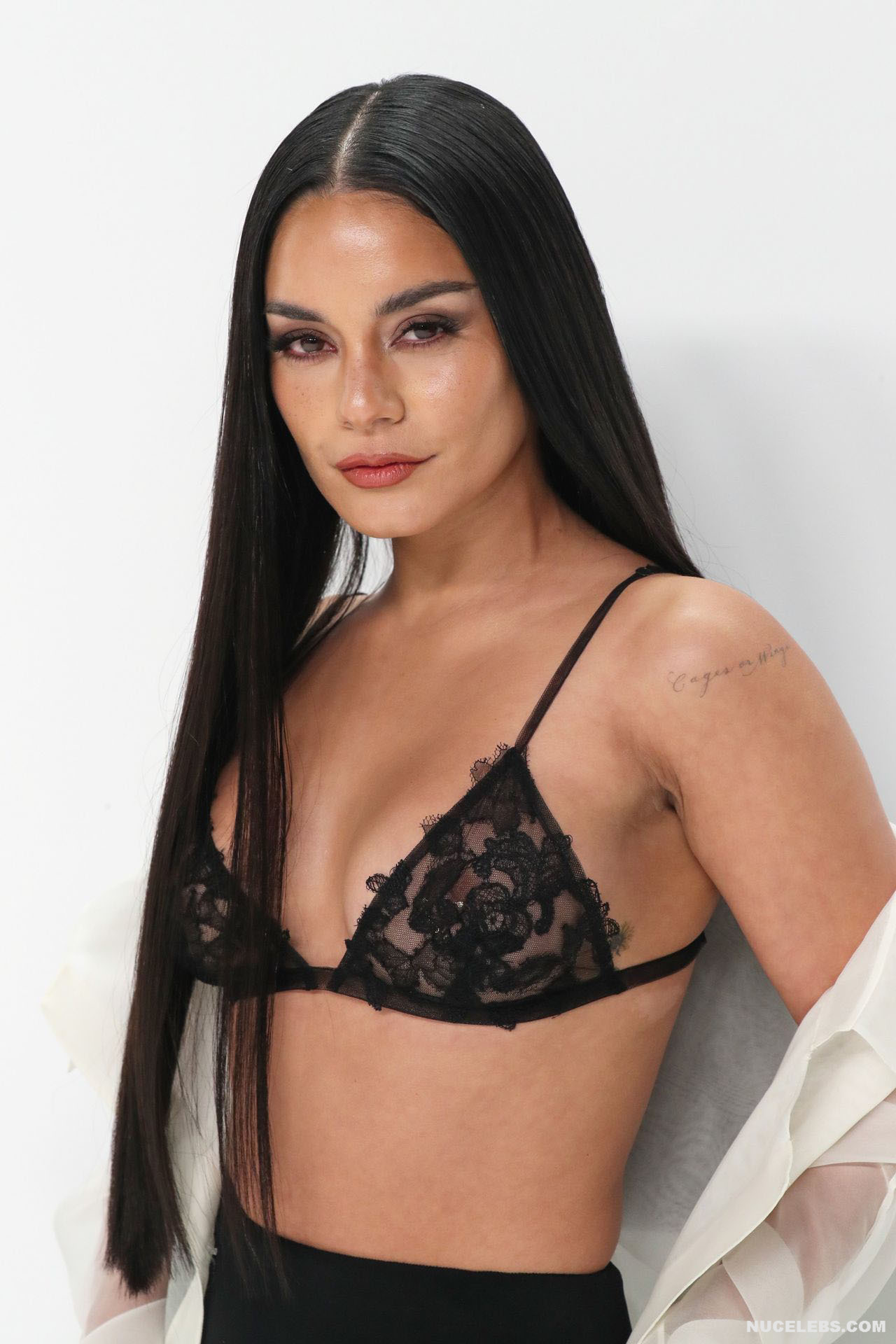 We can say that Vanessa Hudgens practically showed her nude titties in public at one of the events. The 33-year-old celebrity was wearing a long black skirt, as well as a white long transparent cape, which she did not button up. That is why her black lace bra was put on display. And since it had transparent inserts, Vanessa Hudgens’ nude tits with pierced nipples were even visible through!