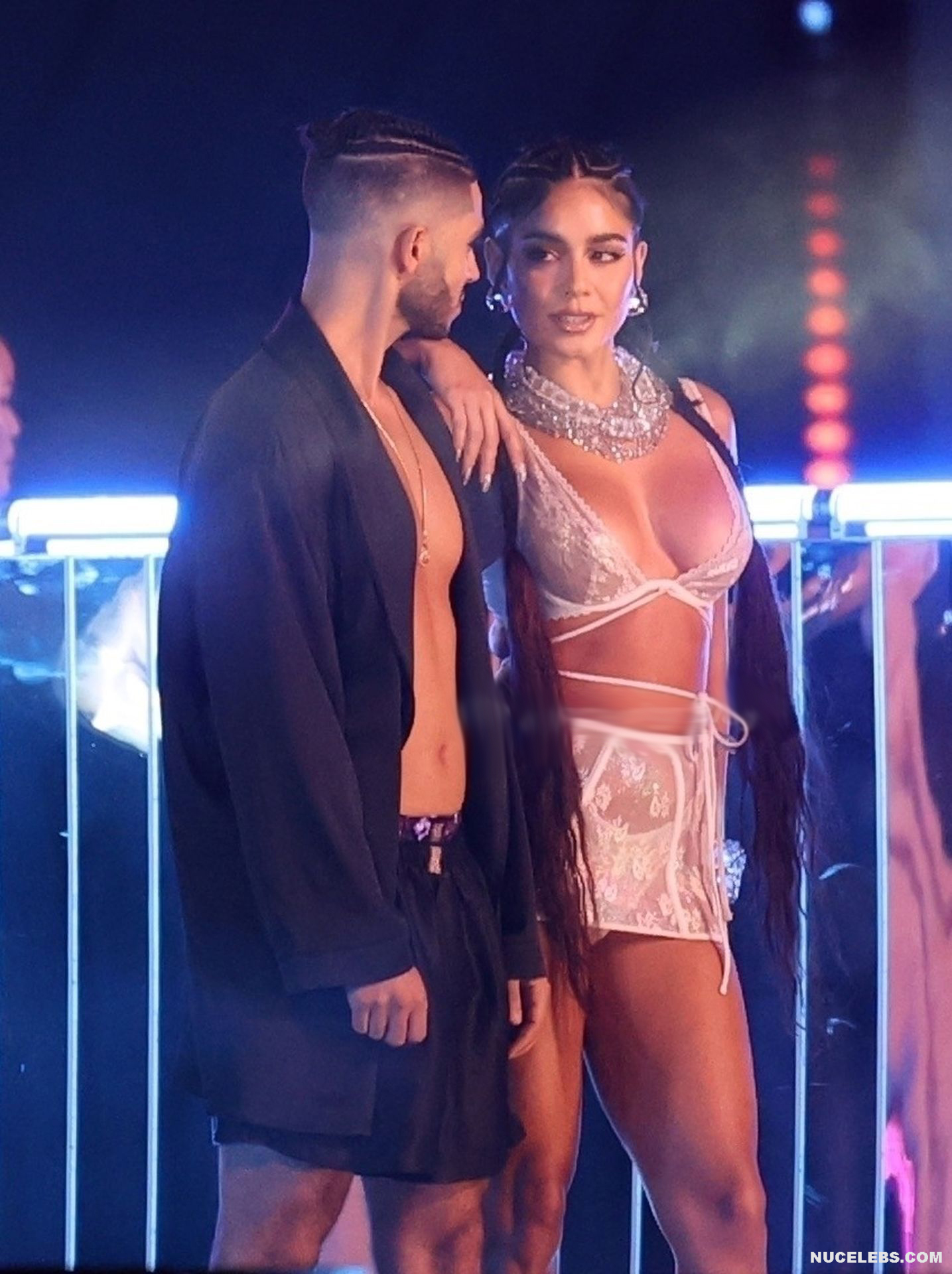 It looks like the American actress Vanessa Hudgens wanted to attract attention to herself. And she appeared at one of the events in very sexy and provocative lingerie. So the celebrity was wearing a bra, panties and a short skirt, made of white transparent fabric with lace. At the same time, the bra was so small that Vanessa Hudgens’s nude boobies almost slipped out of it. By the way, if you looked closely, you could see Vanessa Hudgens nude breasts with brown nipples through the thin fabric!