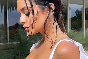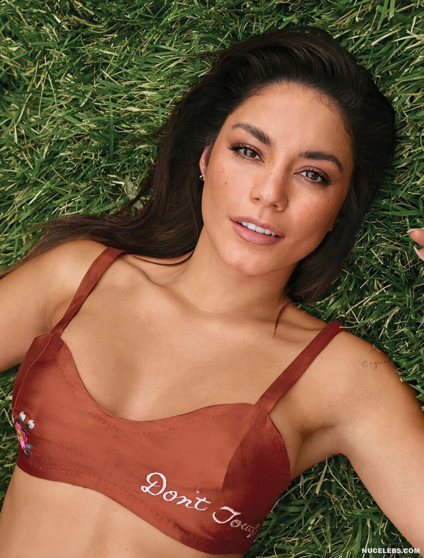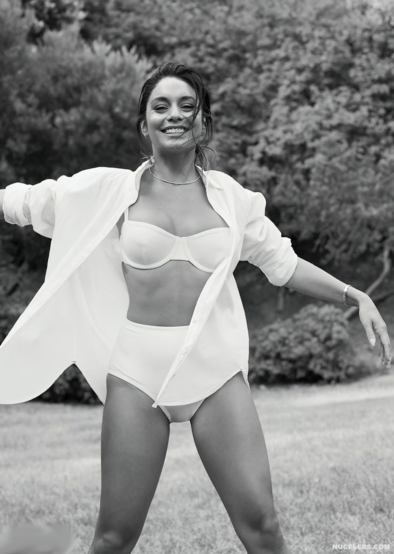 Check out Vanessa Hudgens in a hot photo shoot for Shape Magazine! This brunette, cheerfully smiling, looked at the camera, posing in seductive underwear. The white bra perfectly accentuated her big boobs. And the high-rise panties accentuated the narrow waist of the celebrity. In this photo shoot, Vanessa Hudgens even partially showed her nude breasts. So, she posed for braless in a peach sweater with gold buttons. And when Vanessa Hudgens raised her hands up, the bottom of her nude tits peeked out of the unbuttoned jacket.