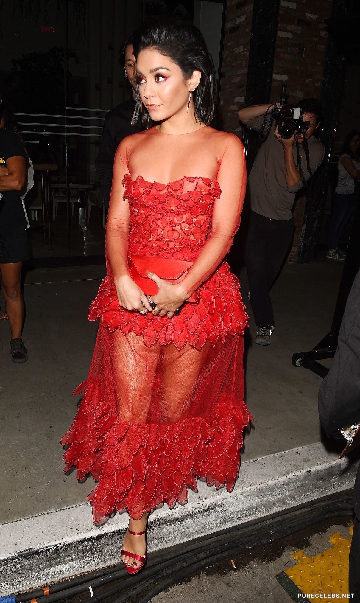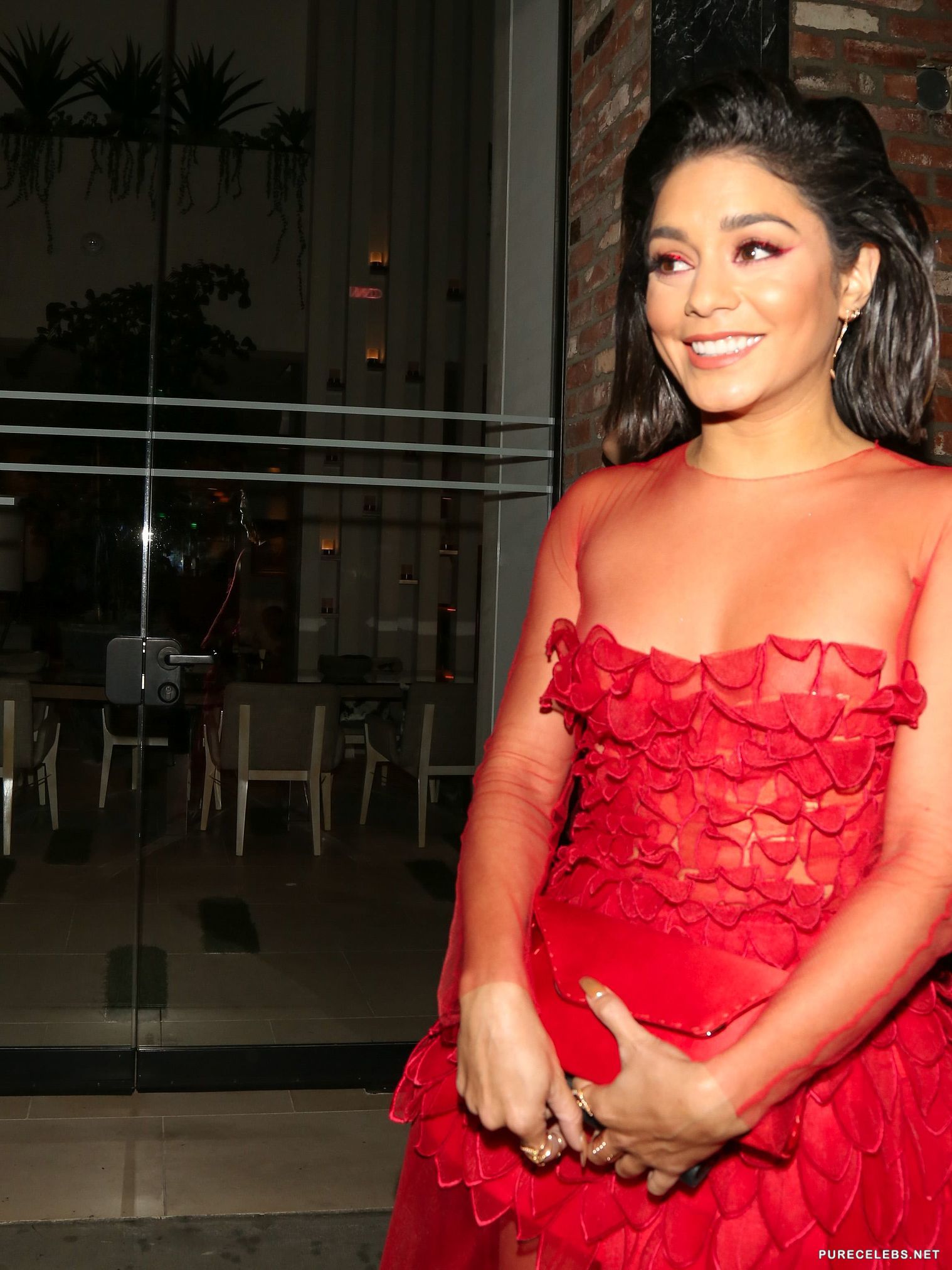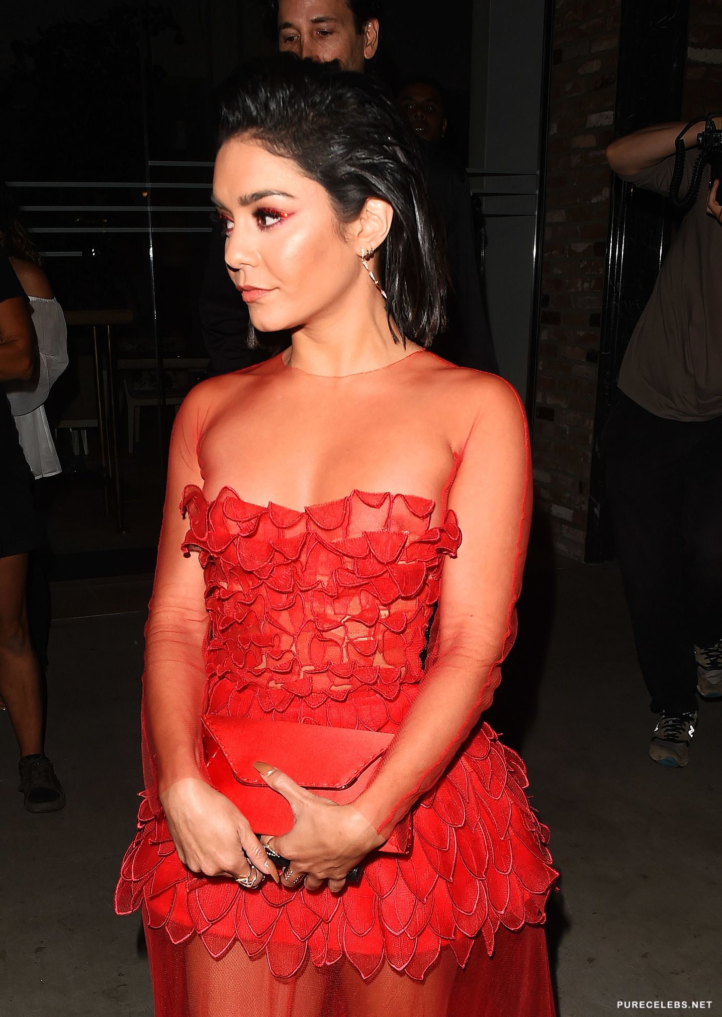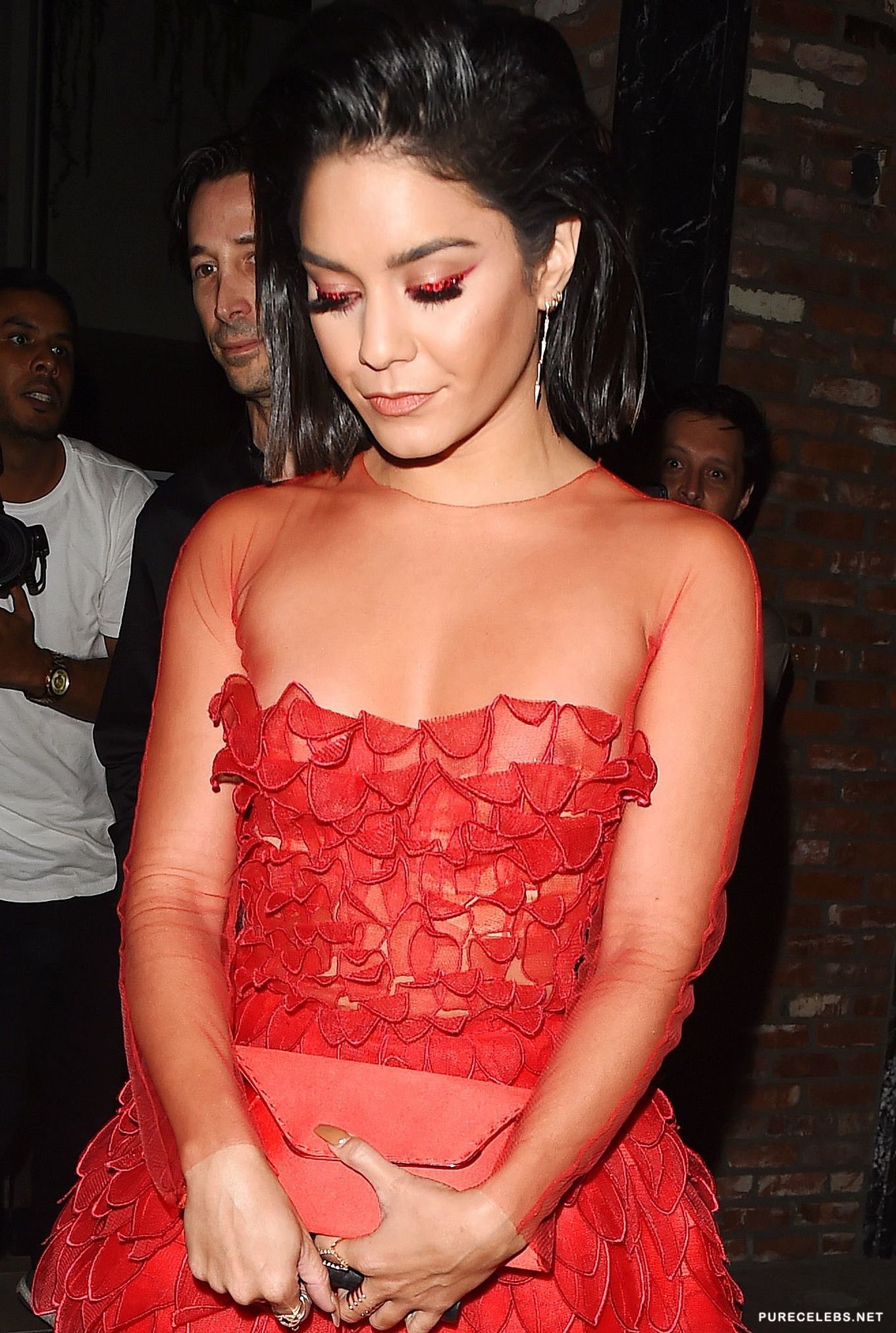 High School Musical star Vanessa Hudgens is a young and upcoming American actress that has, as of late, pushed herself into a singing career. Despite her roles and songs, we’re most impressed with her petite figure and cute face. That’s why it’s great to see her showing off her little breasts in a see through red dress at a public event. Take a look at this gallery and you’ll fall in love with this tiny, dark beauty.