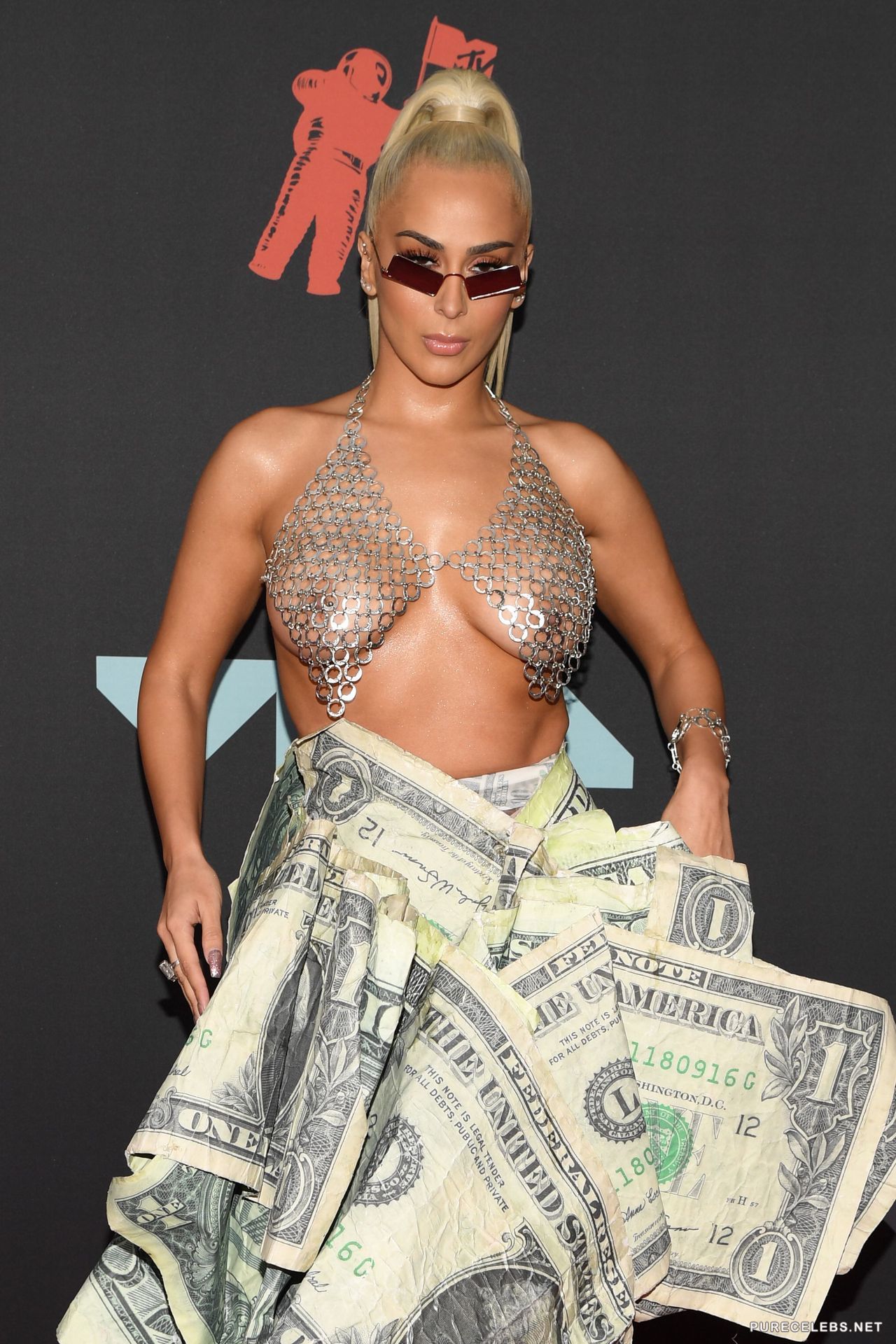 Charming singer Veronica Vega will simply drive you crazy with her last outfit in which she appeared at the event, because she posed in front of the camera almost topless. Hot blonde in black glasses was dressed in an unusual skirt made of one-dollar bills, but her huge juicy tits with hard nipples, which were clearly visible through her mesh top, certainly attracted the most attention. You can not resist this beauty!