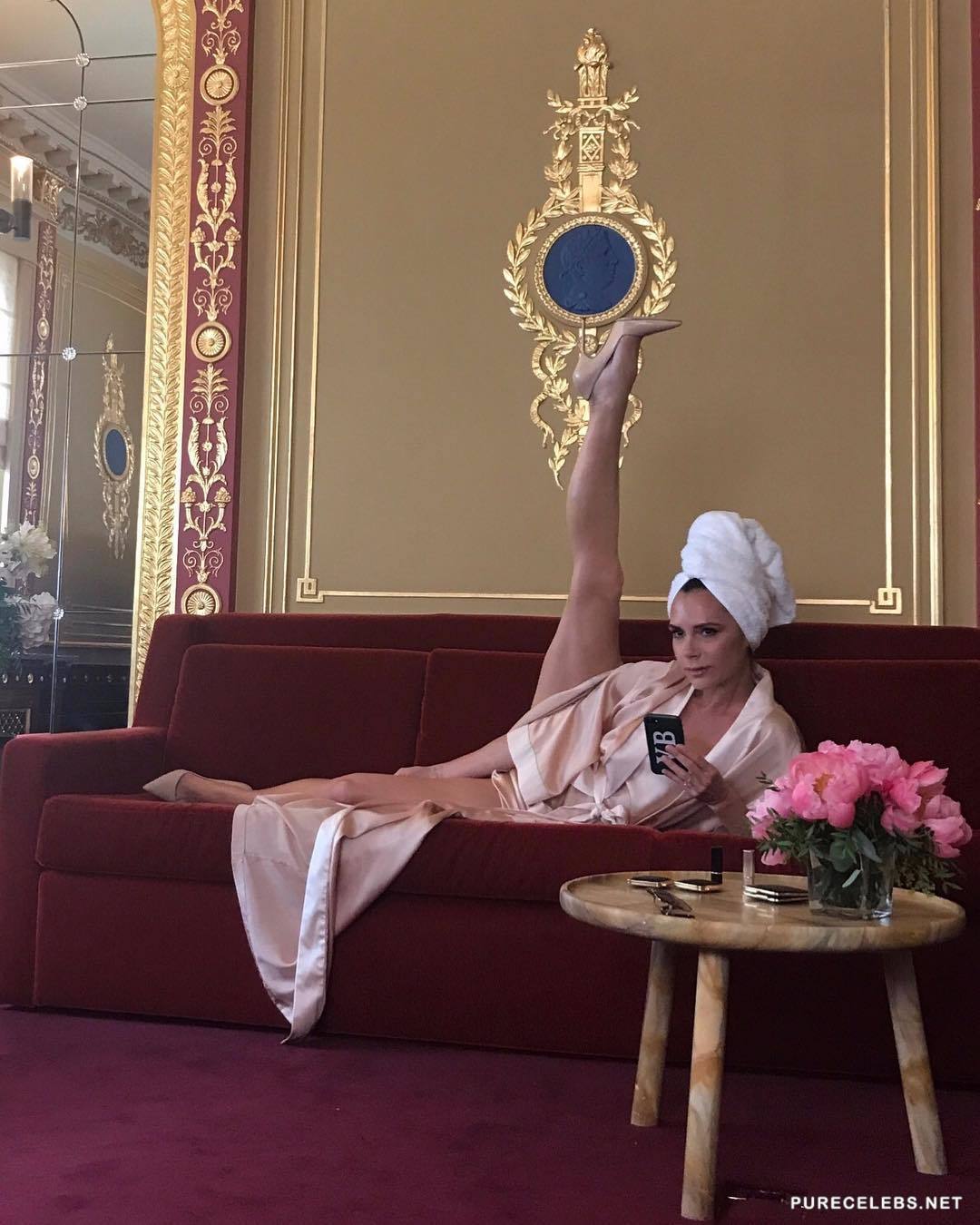 Former Posh Spice Victoria Beckham is turning 44 this year and she is determined to prove that she is not old hag. The slim brunette posed for a fashion magazine. This mature brunette was photographed wearing a pink silk robe stretched out on a sofa and spreading her attractive legs for the photographers while seductively touching her thighs. Despite her age Mrs. Beckham is looking as hot as ever.