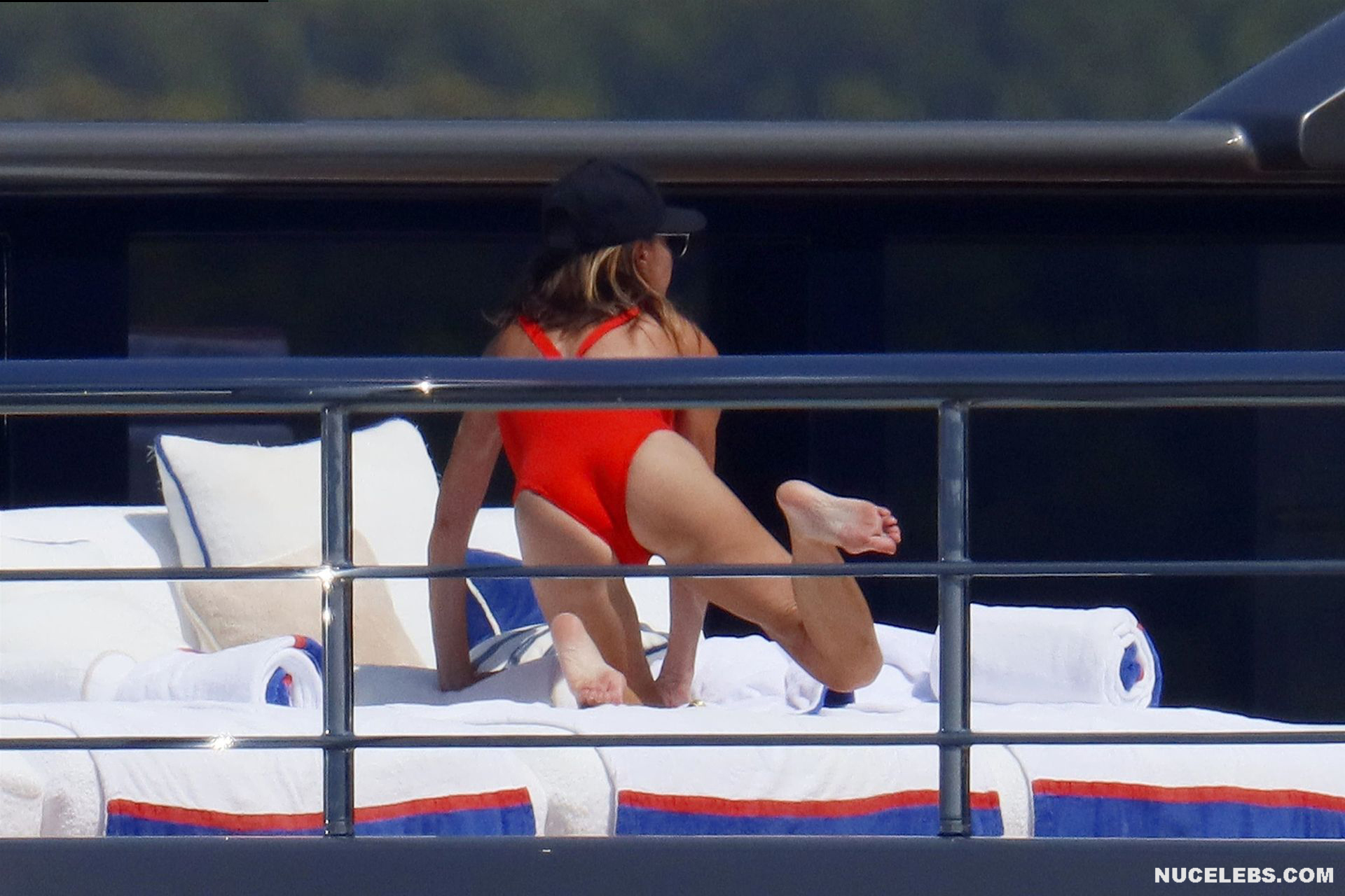 Victoria Beckham is in no hurry to spoil her fans with a demonstration of her nude body. But you can see her slender figure in a red swimsuit right now. While this British singer was sunbathing on a yacht, the paparazzi photographed her from different angles. And it’s worth noting that Victoria Beckham’s nude boobs came close to popping out of her swimsuit’s low cut.